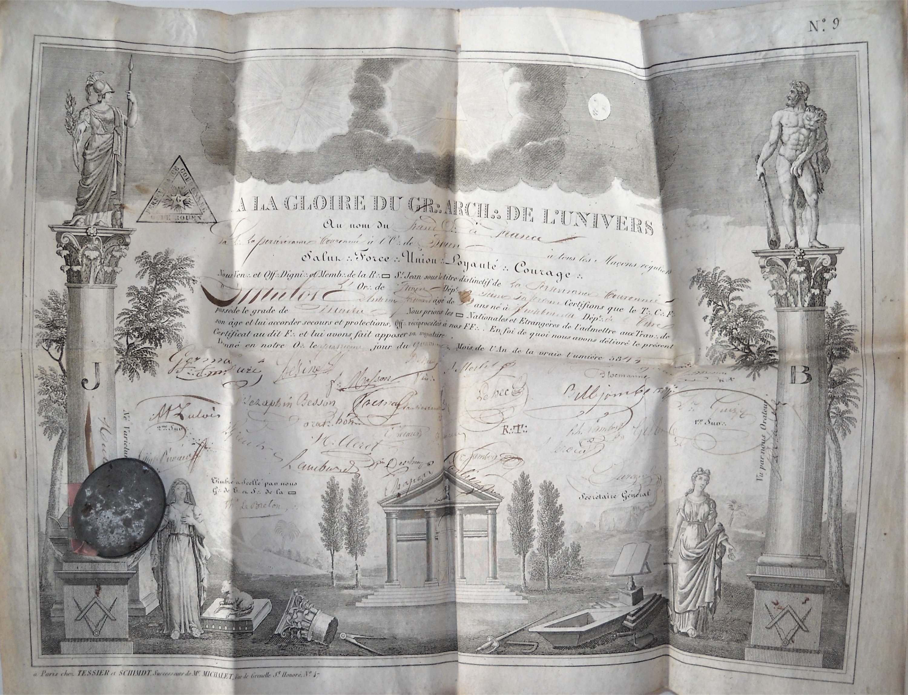 Diplôme de compagnon maître de la loge « La Persévérance Couronnée Orient de Rouen » décerné à Archange Gast, le 25 juillet 1814 à Rouen, 52 x 38 cm, avec sceau conservé dans sa boite métallique attachée par des rubans de couleurs ;
