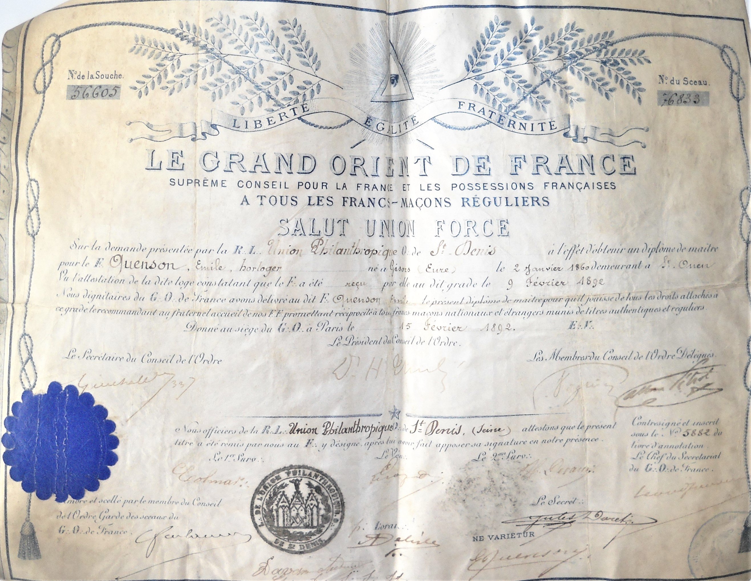 Diplôme de maître de la loge « Union philanthropique Orient de Saint Denis » décerné à Emile Quenson, horloger à Gisors, le 15 février 1892 à Paris, 27 x 33 cm ;