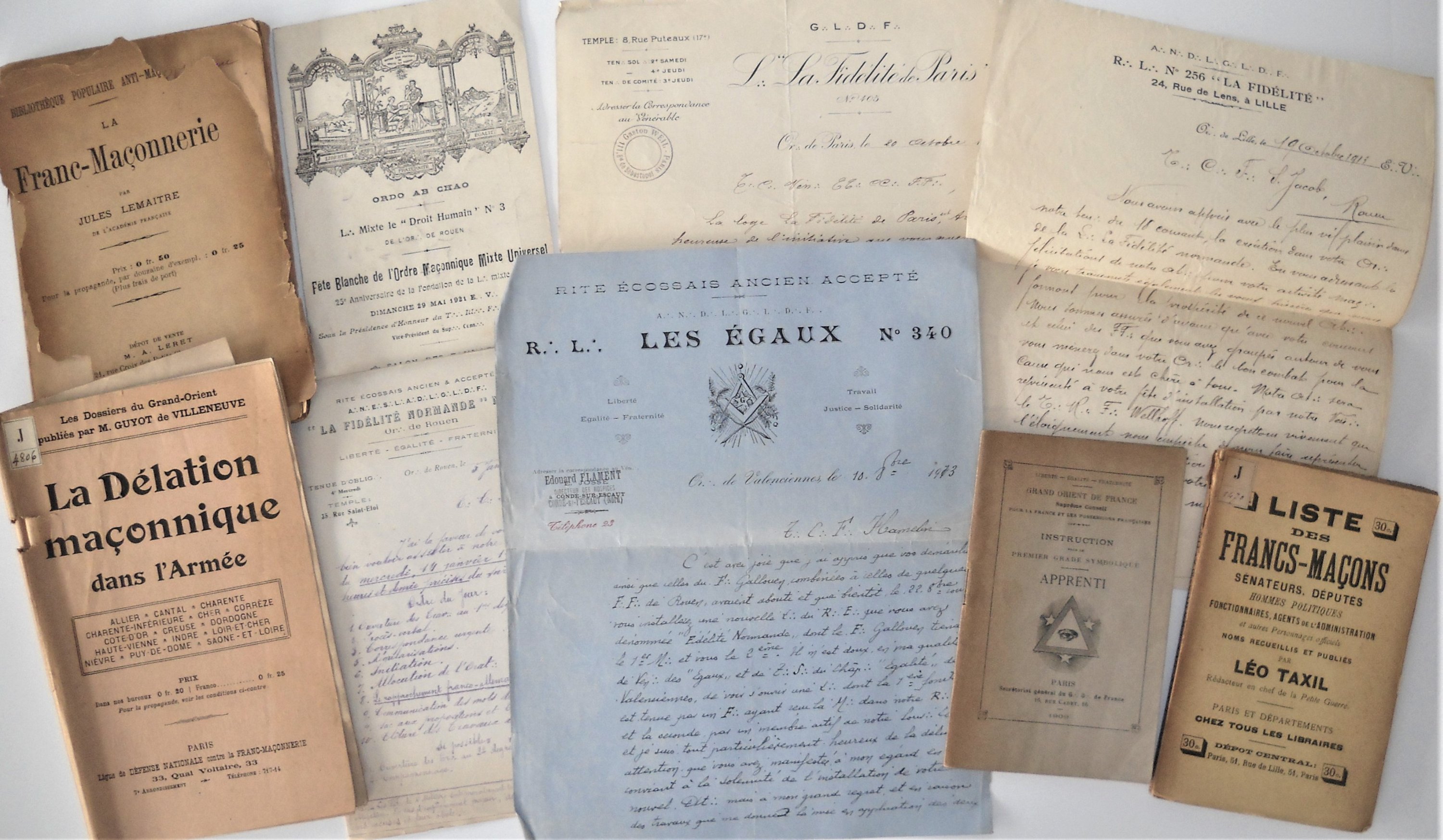 Loge de « La Fidélité Normande » à Rouen : 3 L.A.S., octobre 1913, de la loge « Les Egaux » de Valenciennes, « La Fidélité » de Lille, « La Fidélité » de Paris, relatives à la création de la nouvelle loge fondée à Rouen ; Convocation du 5 janvier 1914 ; programme musical de la fête blanche de lordre maçonnique mixte universel, à Rouen le 29 mai 1921 ;