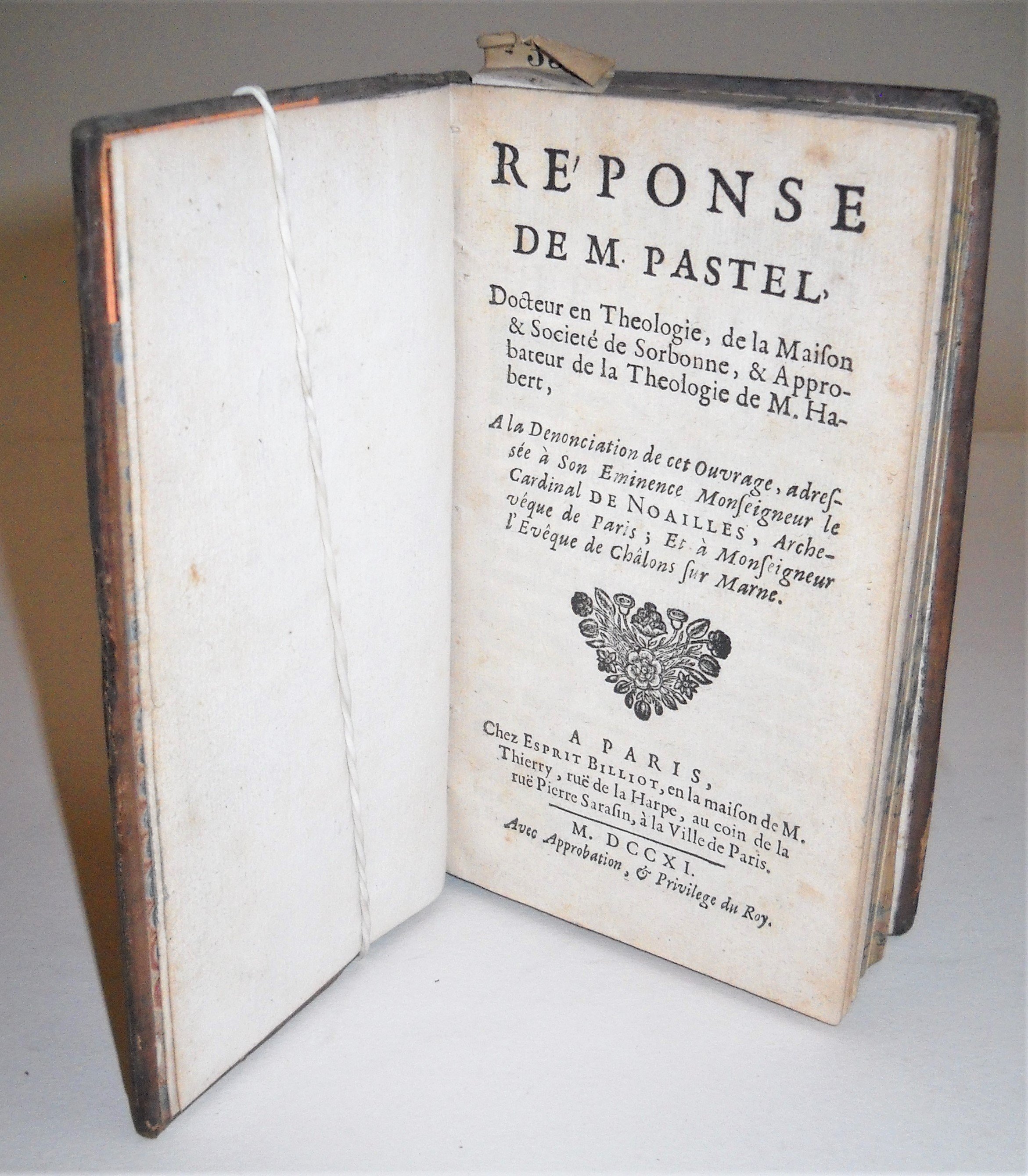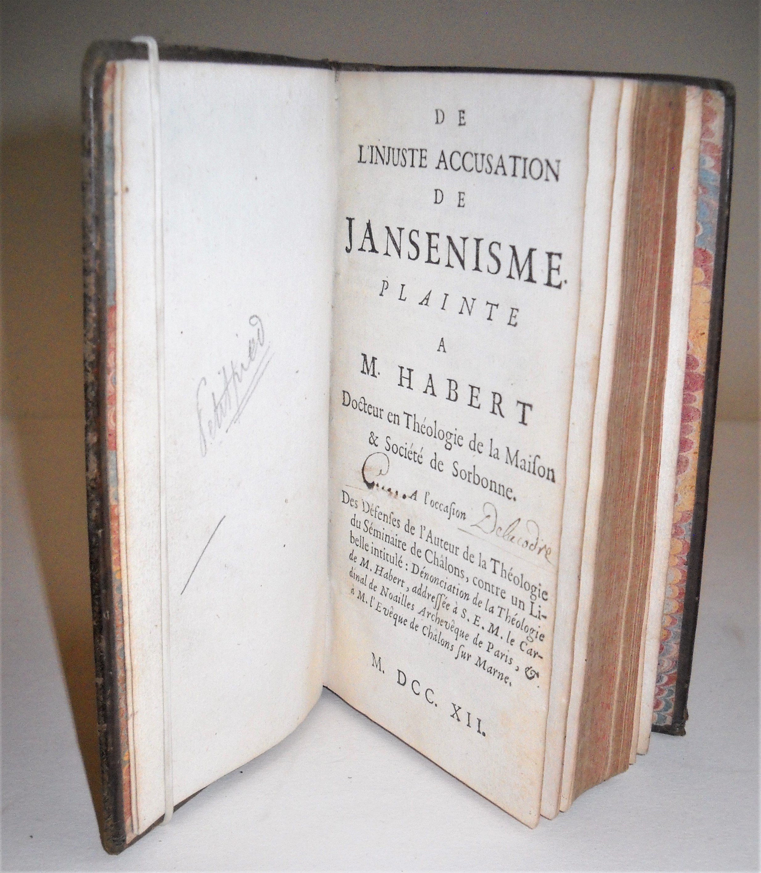 • Recueil factice, rel. in-12 plein veau d’époque, comprenant: Réponse de M. Pastel, docteur en théologie, de la Maison & Société de Sorbonne, & Approbateur de la théologie de M. Habert… Paris, Billiot, 1711, 3 ff.-168 pp., suivi de Recueil des mandements de nosseigneurs les evesques des Pays-Bas… s.l., 1714, 16-23 pp., et de Lettre du R. P. Porée, à M. Grenan, au sujet de l’oraison funèbre du roy, qu’il a prononcée en Sorbonne le 11 décembre 1715, s.l., 1716, 35 pp.