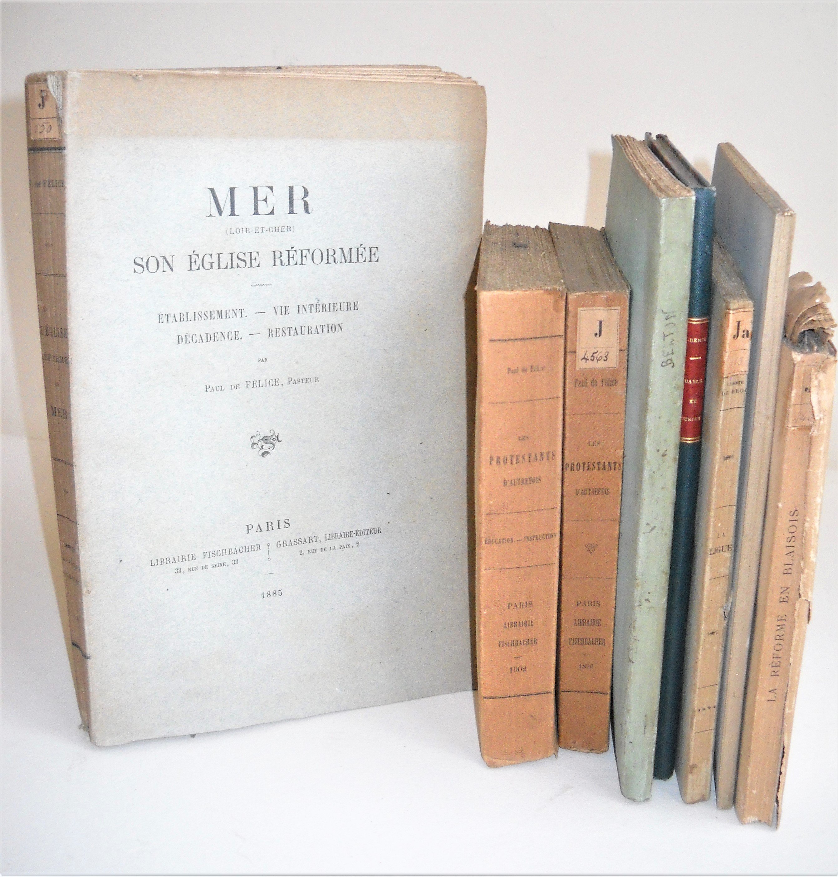 De Broc, La Ligue, 1874, 113 pp., tiré à 100 ex. avec envoi autographe signé ; De Félice : La réforme en Blaisois, documents inédits, registre du consistoire (1665-1677), 1885, 111 pp. ; Mer (Loir-et-Cher) son église réformée, 1885, 301 pp. ; Abbé Develle, Blois Les Nouvelles Catholiques (1654-1792), 1885, 85 pp. ; Denis, Bayle et Jurieu, Caen, 1886, 81 pp. ; Belton, Notes sur lhistoire des protestants dans le Blésois, 1886, 218 pp. ; De Félice, Les protestants dautrefois, vie intérieure des églises, murs et usages, 2 vol., 1896 et 1902, 290 et 406 pp.