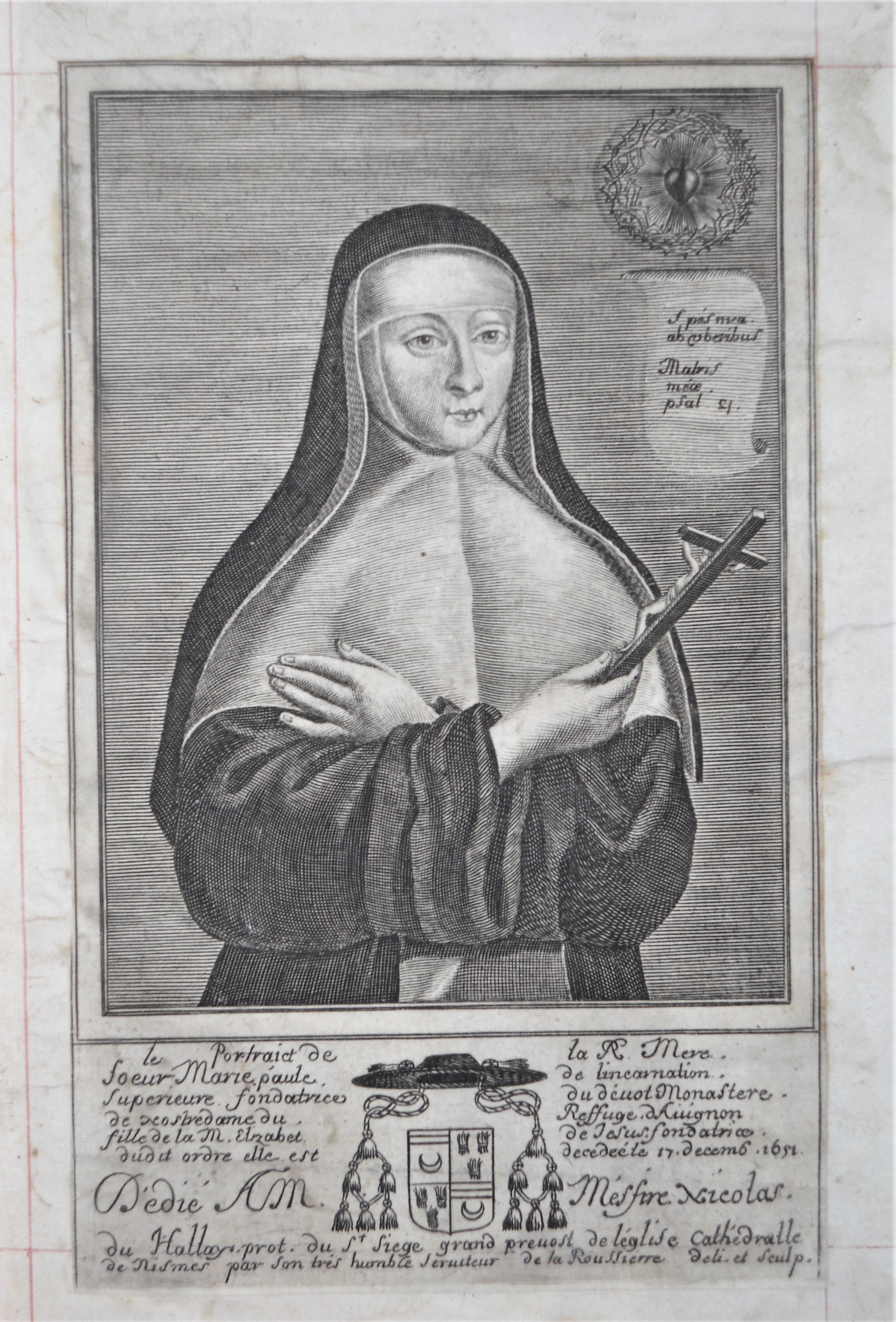 La première page est ornée dun portrait de sur Marie Paule de lIncarnation supérieure fondatrice du monastère de Notre-Dame du Refuge à Avignon, gravé par S. de la Roussière, graveur au burin, actif au 17e siècle ; vignette contrecollée, 17,5 x 11,5 cm ;