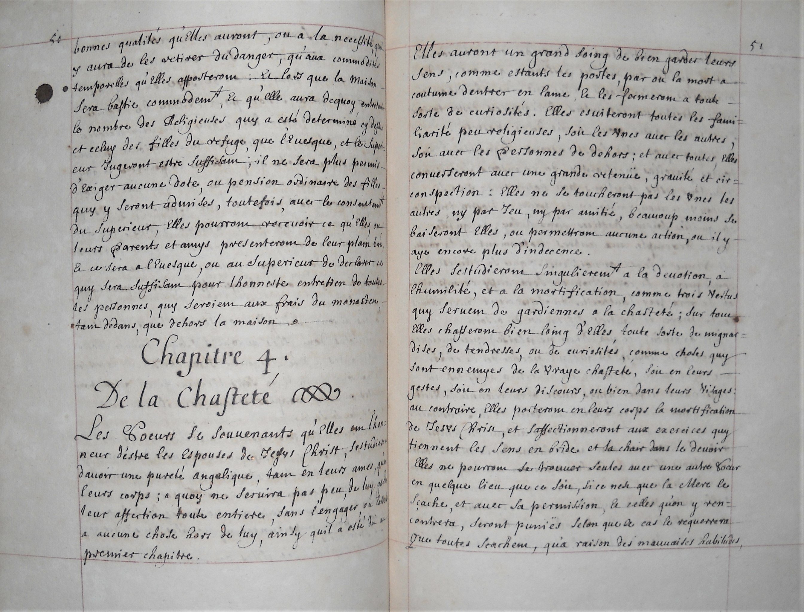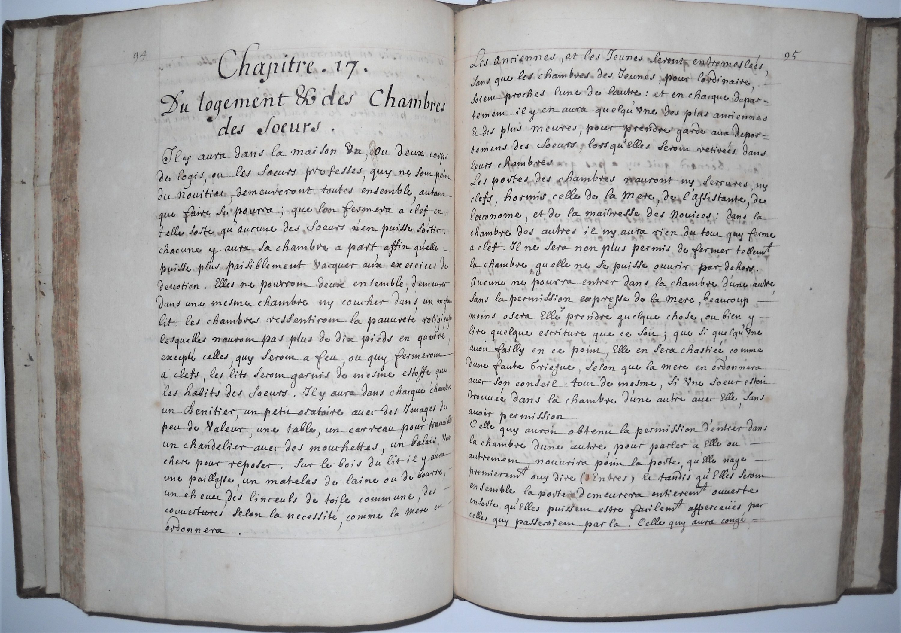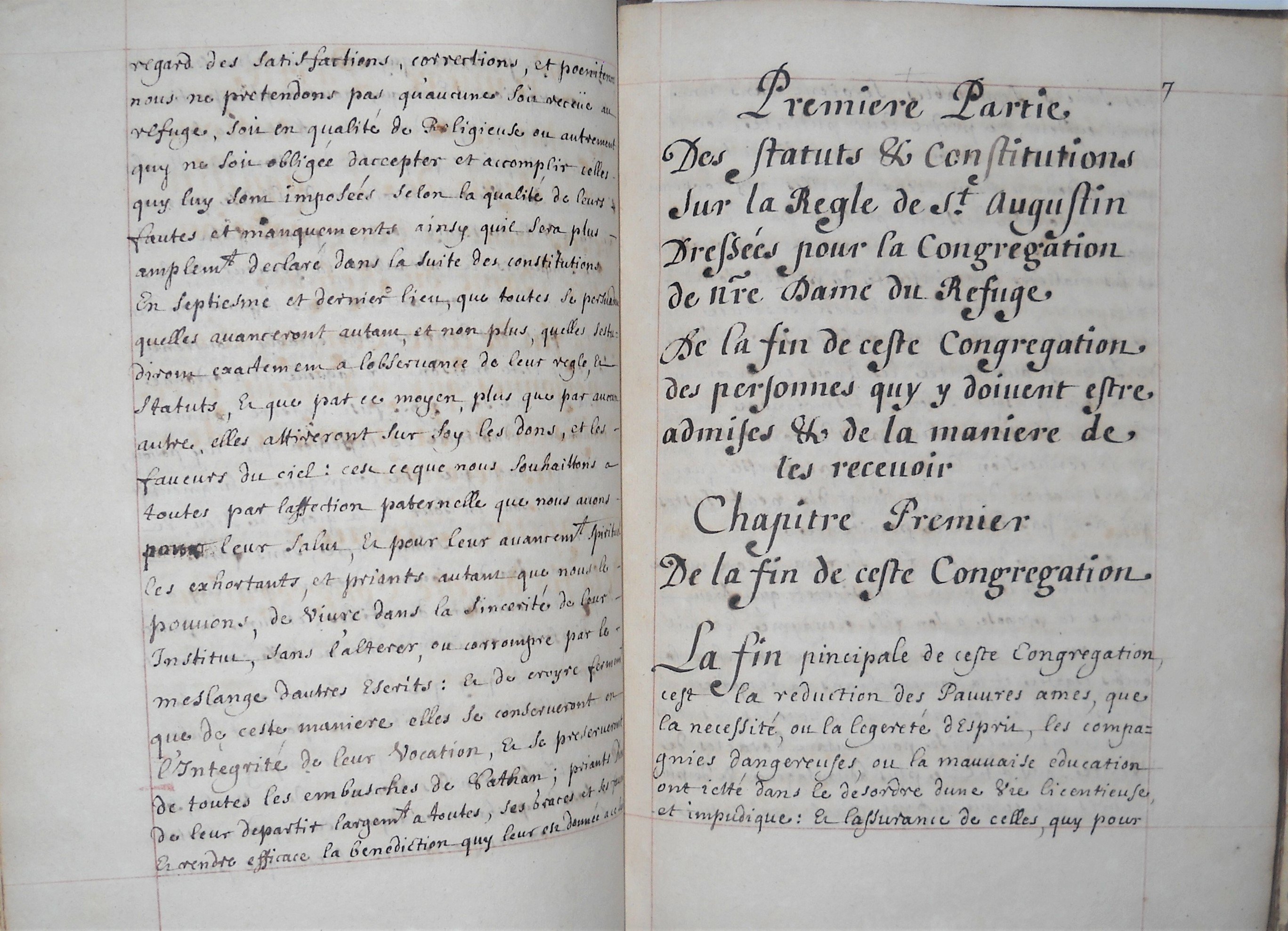 Des statuts & constitutions sur la règle de St Augustin dressées pour la congrégation de Notre-Dame-du-Refuge, de la fin de ceste congrégation des personnes quy y doivent estre admises & de la manière de les recevoir, manuscrit à lencre brune, 2nde moitié du 17e siècle, rel. in-4 plein veau dépoque, 244 pp. ; Copie manuscrite des statuts et des règles à suivre au sein de la congrégation religieuse féminine de Notre-Dame du Refuge, congrégation pour les pécheresses repentantes fondée en 1624 à Nancy par Elisabeth de Ranfaing soumise à la règle de saint Augustin.