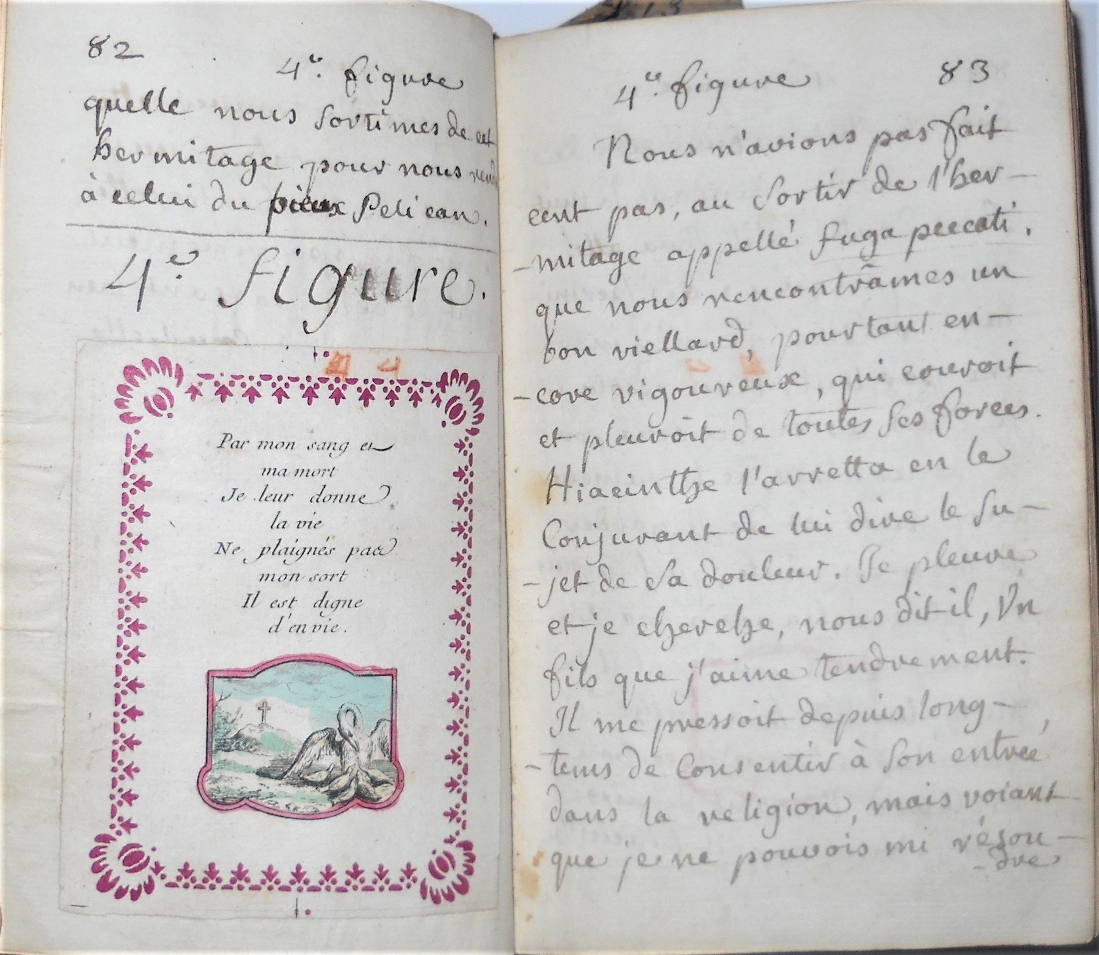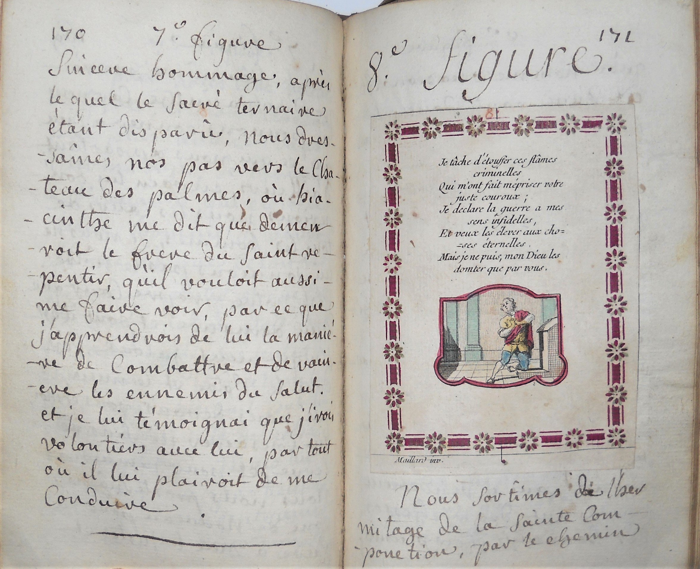 Le vrai Bonheur ou le Voyage Spirituel de Théophile dans le Sacré désert de la Perfection, représenté en 32 figures en taille douce et en lumières, où sont renfermées les trois vies Purgatives, illuminatives et unitives en deux volumes [par sur Victoire de Saint Xavier, religieuse de la congrégation de N. D. de Reims] ; copie manuscrite du premier tome, 2nde moitié du 18e siècle, rel. in-8 veau dépoque, 491 pp., ornées de 20 vignettes contrecollées et rehaussées de couleurs dépoque, sculptées par Fouchault et éditées par Bresson de Maillard, graveur et marchand destampes, cour des Célestins à lArsenal à Paris, actif au milieu du 18e siècle.