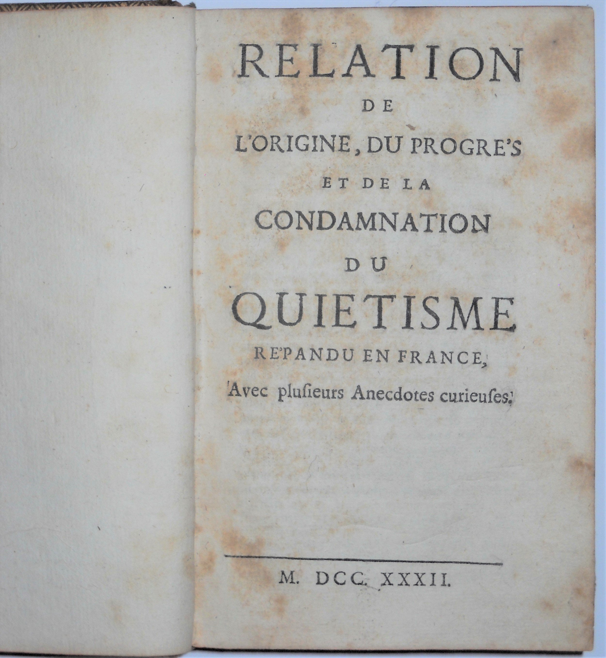 Relation de lorigine, du progrès et de la condamnation du quiétisme répandu en France, avec plusieurs anecdotes curieuses, 2 tomes en un vol., 1732, rel. in-12 plein veau (en létat), (13) ff.-328-280 pp. (rousseurs), rare édition originale posthume publiée par Gabriel Deliege à Sainte-Menehould, car la plupart des exemplaires furent saisis et brûlés par lettres de cachet.
