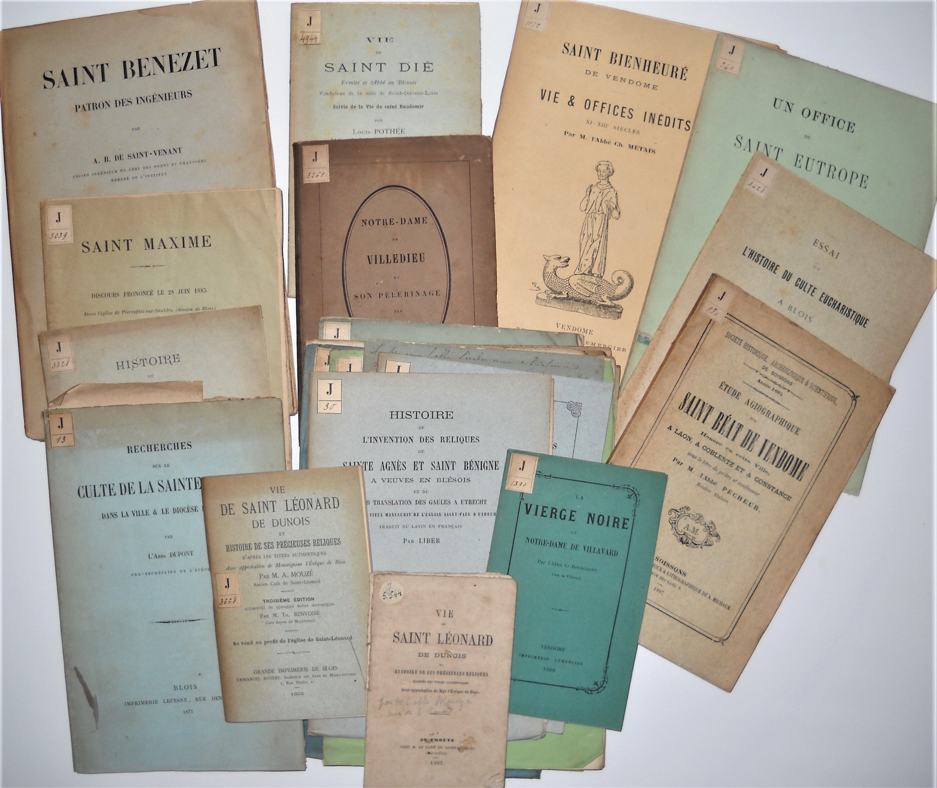 Naudin, Vie de saint Victor évêque du Mans, patron de la paroisse de la Chaussée-Saint-Victor, Blois, 1863 ; Abbé Mouzé, Vie de saint Léonard de Dunois et histoire de ses précieuses reliques, chez lauteur à Saint léonard, 1863 ; Abbé Bourgogne, La Vierge noire de Notre-Dame de Villavard, Vendôme, 1868 ; Vallier, Le bras de Saint Arnoul et les bulles des évêques de Gap, Grenoble, 1870 ; Dupré, Du culte de saint Blaise dans le Vendômois, Angers, 1873 ; Abbé Poussin, Notre-Dame de Villedieu et son pèlerinage, chez lauteur à Villedieu, 1875 ; Abbé Dupont, Recherches sur le culte de la sainte Vierge dans la ville & le diocèse de Blois, Blois, 1875 ; Abbé Tanquerel des Planches, Veuves son ancienne abbaye, ses saints et le nouveau pèlerinage en lhonneur de saint Joseph, Blois, 1883 ; Liber, Histoire de linvention des reliques de sainte Agnès et saint bénigne à Veuves en Blésois, 1884 ; Abbé Dubois, Saint Maxime, discours prononcé le 28 juin 1885 dans léglise de Pierrefitte-sur-Sauldre à loccasion de la translation solennelle du corps du saint martyr ; Métais, Un office de saint Eutrope au XIe siècle, Vendôme, 1887 ; Abbé Pêcheur, Etude agiographique sur saint Béat de Vendôme, Soissons, 1887 ; Métais, saint Bienheuré de Vendôme, vie & offices inédits XIe-XIIIe siècles, Vendôme, 1888 ; Pouyade, Notice sur la vie du saint et léglise de saint Lubin de Vendôme, 1889 ; de Saint Venant, Saint Benezet patron des ingénieurs, Bourges, 1889 ; abbé Gruau, Histoire populaire de Saint Genou, Blois, 1894 ; Histoire de linvention des reliques de sainte Agnès & saint Bénigne à Veuves en Blésois, Blois, 1898 ; Rebsomen, Essai sur lhistoire du culte eucharistique à Blois, Blois, 1899 ;Abbé Renvoisé, Vie de saint Léonard de Dunois et histoire de ses précieuses reliques par labbé Mouzé augmentée de quelques notes, Blois, 1902 ; Louis Pothée, Vie de Saint Dié ermite et abbé en Blésois, Blois, 1905 ; Notes relatives à liconologie de la sainte Vierge, S. Georges et S. Chéron, Vendôme ; Abbé Auger, Mémoire sur la découverte du tombeau de Saint Eutrope de Saintes faite le 19 mai 1843, Paris, 1846 ; etc.