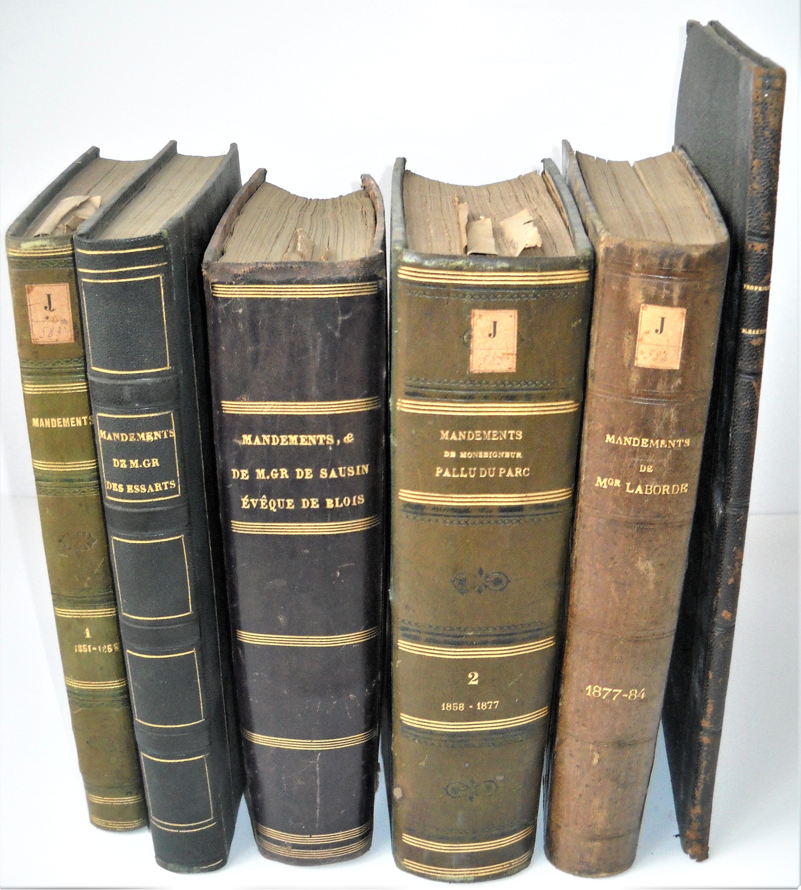 Réunion en 5 vol. rel. in-4 des Mandements des évêques du diocèse de Blois : Monseigneur de Sausin 1823-1844 ; des Essarts, 1845-1850 ; Pallu du Parc, 1851-1877 ; Laborde, 1877-1884 ; Projet des statuts synodaux du diocèse de Blois, soumis aux observations du clergé par Mgr lévêque, 1881 ; Congrès des uvres diocésaines tenu à Blois les 8, 9 et 10 novembre 1897, Blois, 1898 ; Joint petit recueil des lettres circulaires de lévêque de Blois entre 1824 et 1837 ;