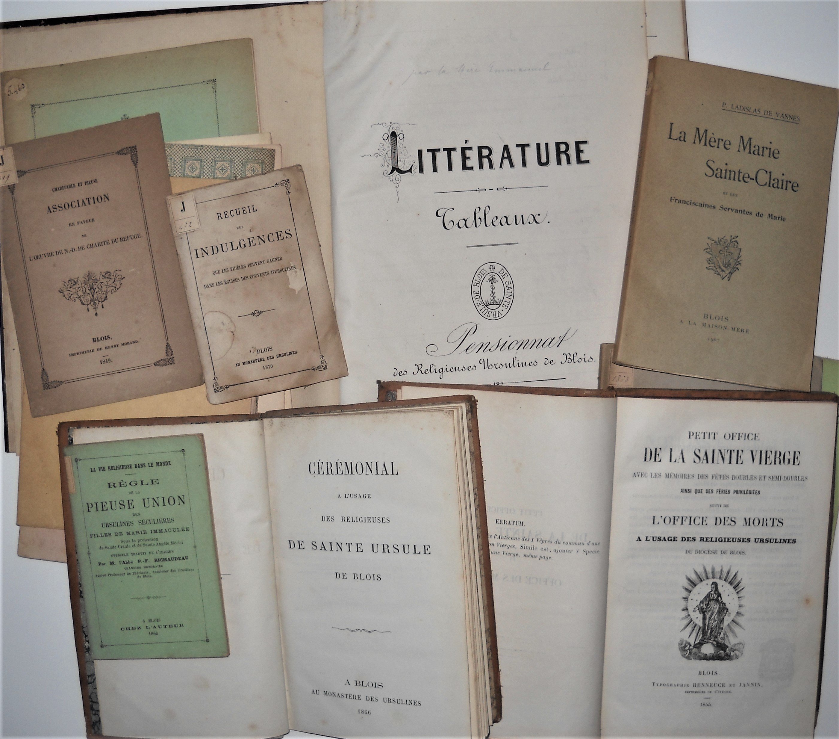 Lot de 17 ouvrages, brochures et opuscules, formats divers, br. ou rel., dont : Charitable et pieuse association en faveur de luvre de Notre-Dame de Charité du Refuge, Blois, 1849 ; Petit office de la Sainte Vierge suivi de loffice des morts à lusage des religieuses Ursulines du diocèse de Blois, Blois, 1855, 88 pp. ; Monastère de lincarnation des ursulines de Blois ; Cérémonial à lusage des religieuses de sainte Ursule de Blois, Blois, monastère des Ursulines, 1866, 127 pp. ; Abbé Richaudeau, Règle de pieuse union des Ursulines séculières filles de Marie immaculée, Blois, 1866, 128 pp. ; Souvenirs, extrait des annales de Notre-Dame de la Providence de Blois, Blois, 1869, 77 pp. ; Recueil des indulgences que les fidèles peuvent gagner dans les églises des couvents dUrsulines, Blois, 1870 ; Un mois de préparation à la mort, mon dernier mois, Sur Marie du Cur de Jésus, religieuse de Notre-Dame de Charité du Refuge de Blois, 1873, 30 pp. ; P. Ladislas de Vannes, La Mère Marie Sainte-Claire et les franciscaines servantes de Marie, Blois, 1907, 159 pp. ; Tableaux des cours de littérature, par la mère Emmanuel ; pensionnat des religieuses Ursulines de Blois ; Distribution des prix au pensionnat des Ursulines de Blois, 1907 ; Circulaires des Ursulines de Blois et extrait des annales de Notre-Dame de la Providence de Blois.