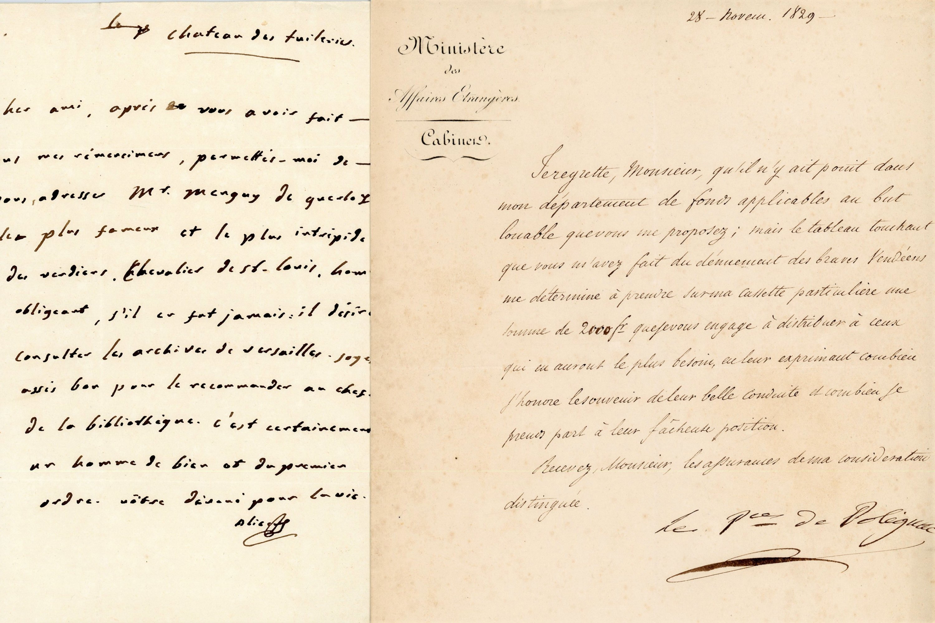 • Nombreuses lettres signées de ministres en réponse à des demandes de secours, 1829-1830, dont L.S., 28 novembre 1829, Jules prince de Polignac (1780-1847), président du Conseil des ministres et ministre des Affaires étrangères