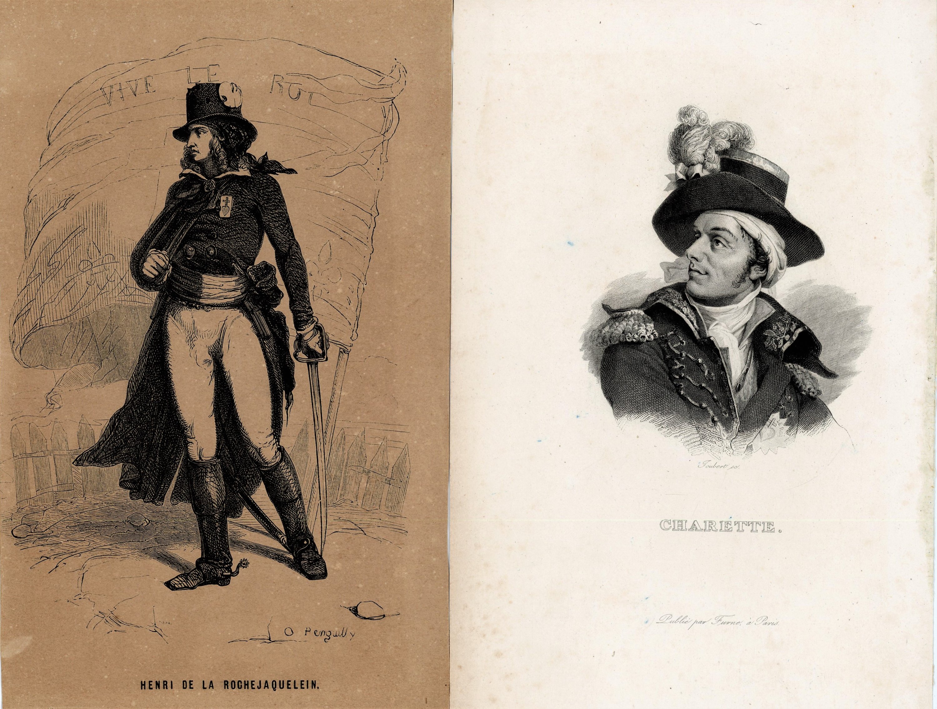 Joint: 2 gravures lithographiées des généraux vendéens François Athanase Charrette de la Contrie et d’Henri de la Rochejaquelein, 22 x 14 cm.