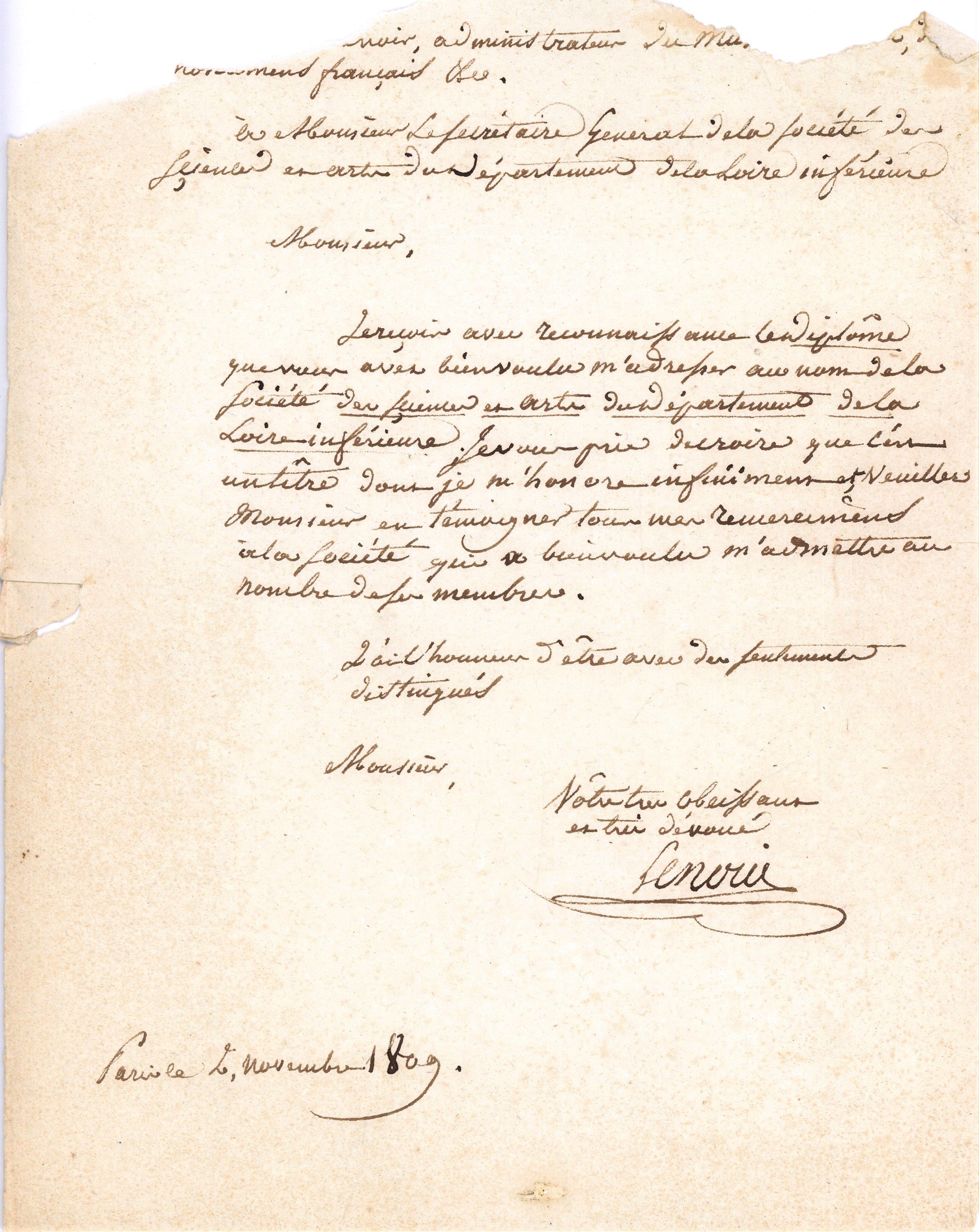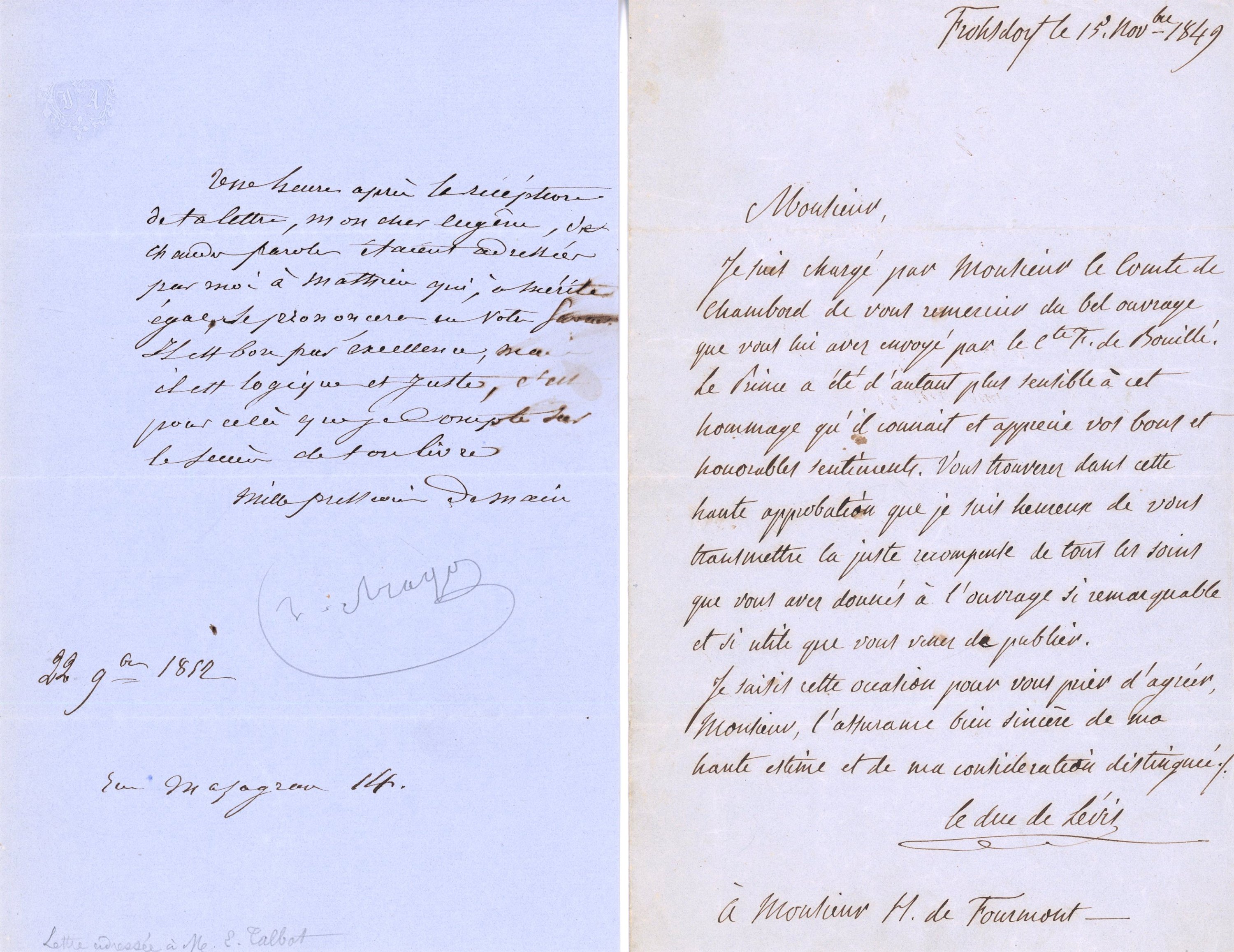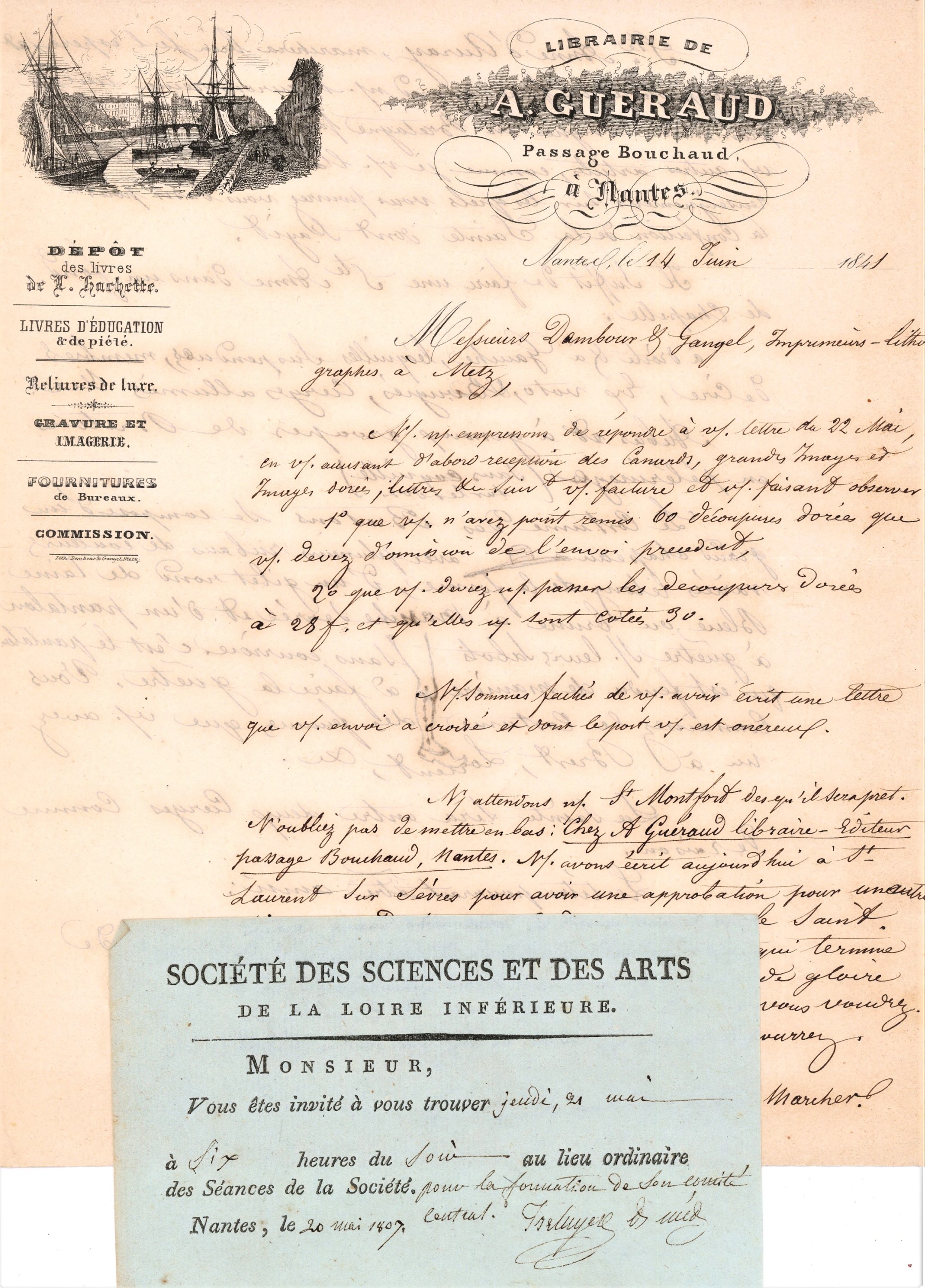 L.A.S., L.A. et divers d’hommes et de femmes de lettre, élus, scientifiques, politiques, etc, la plupart originaire/en lien avec la Bretagne ou la ville de Nantes, adressées à la Société des Sciences et Arts et à la Société royale académique de la Loire-Inférieure, à des éditeurs nantais (Guéraud, Mellinet-Malassis) et à divers