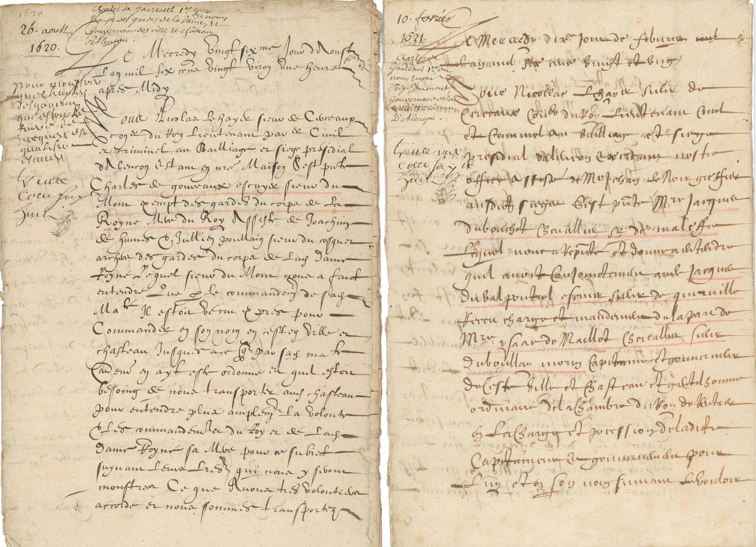 Copie manuscrite, délivrée le 26 août 1620, de la prise de possession de loffice de gouverneur des ville et château dAlençon par Charles de Gauréault, écuyer sieur du Mont exempt des gardes du corps de la Reine Mère du roi [Marie de Médicis]: « assisté de Joachim de Humes et de Julien Poulain sieur du Cosguet archers des gardes du corps de ladite dame Reine lequel sieur du Mont nous a fait entendre par le commandement de sa dite Majesté il était venu exprès pour commander en son nom en cette ville et château
