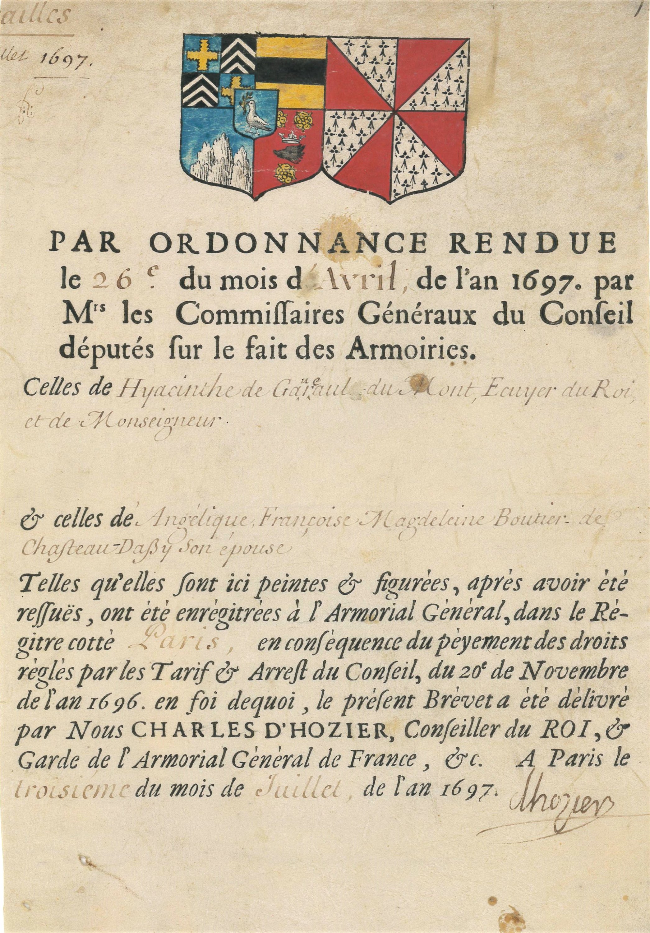 Brevet d'armoiries délivré à Paris, 3 juillet 1697, et signé par le roi d'armes Charles d'Hozier (1640-1732). Armoiries gouachées en faveur de Hyacinthe de Gauréault Dumont, écuyer du roi et premier valet de chambre du Dauphin, et dAngélique Françoise Madeleine Boutier de Château dAssy son épouse. Mi-manuscrit, mi-imprimé, feuillet sur vélin étréci, 26,5 x 18 cm.