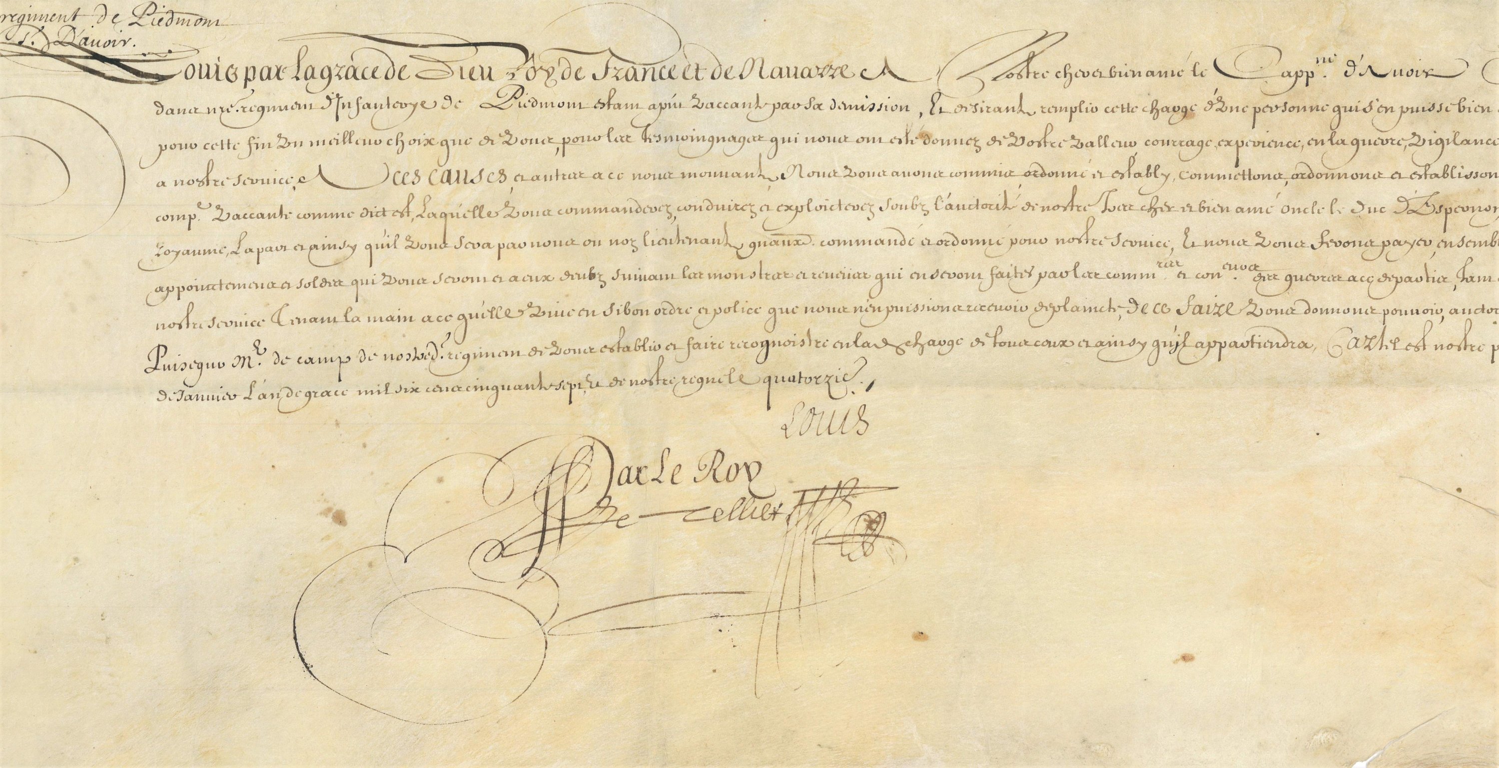 P.S., Paris, 16 janvier 1657, Louis » (secrétaire) et contresignée par Michel le Tellier (1603-1685), ministre de la Guerre, parchemin oblong ; Commission de capitaine au régiment de Piémont délivrée au jeune marquis d’Avoir « la compagnie qu’avait le capitaine Saintot dans notre régiment d’infanterie de Piedmont étant à présent vacante par sa démission » « sous l’autorité de notre très cher et bien aimé oncle le duc d’Épernon pair de France colonel général de l’infanterie de ce royaume ».