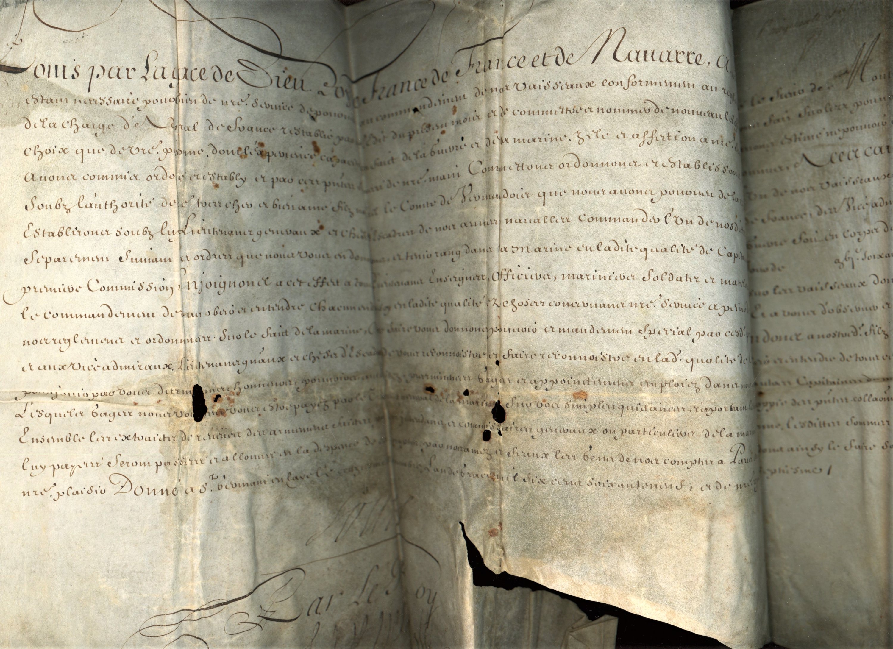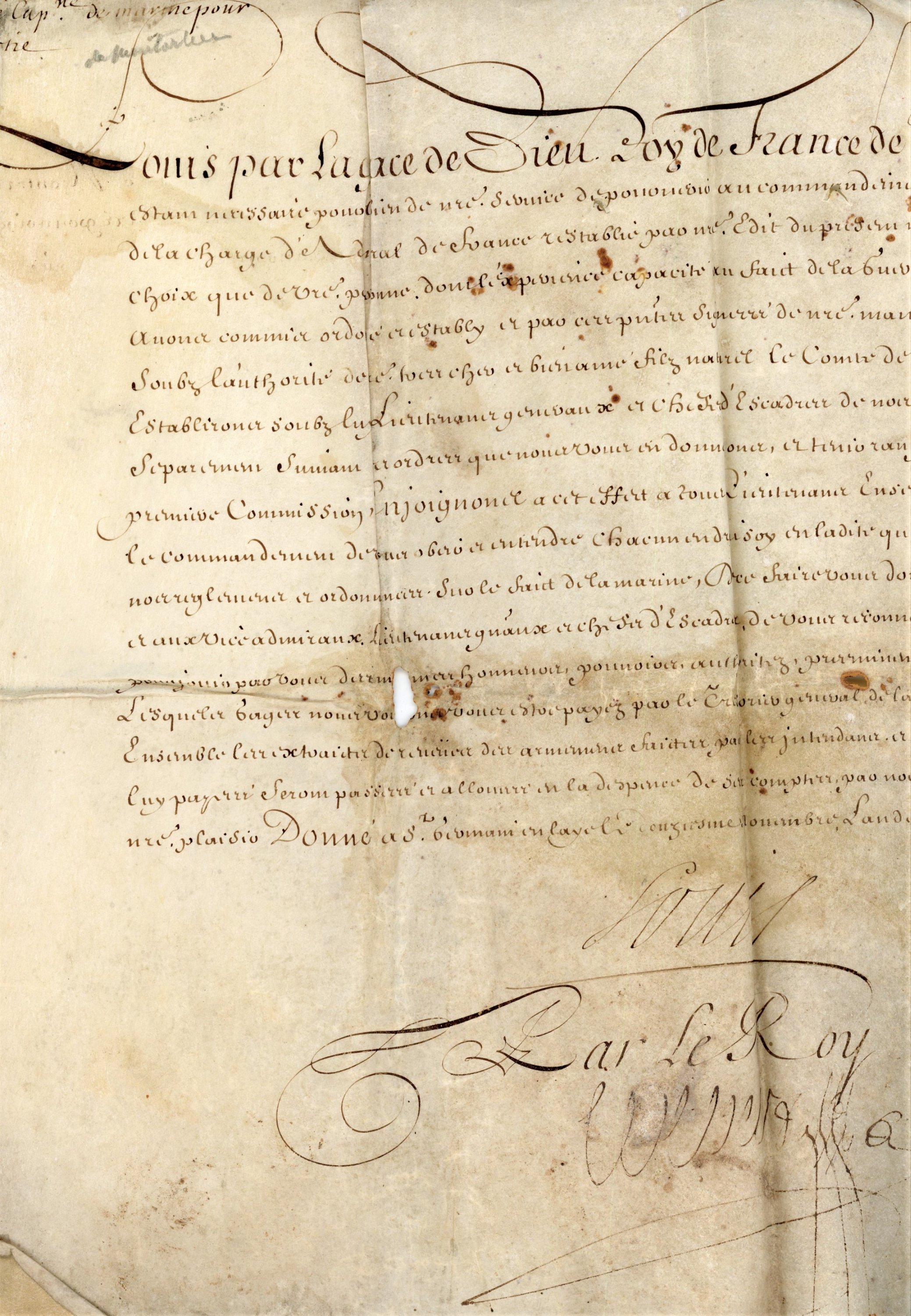 P.S., Saint Germain-en-Laye, 12 novembre 1669, « Louis » (secrétaire) et contresignée par Jean-Baptiste Colbert (1619-1683), ministre de la Marine, parchemin oblong (plis, petits manques) ; Commission dofficier de marine délivrée à Philippe Le Marié, sieur de Montortier (1639-1690) : « commettons, ordonnons et établissons capitaine de lun de nos vaisseaux de guerre » sous lautorité du comte de Vermandois, amiral de France « commander lun de nos dits vaisseaux de guerre soit en corps darmes descadre ou séparément suivant les ordres que nous vous en donnons, et tenir rang dans la marine ».