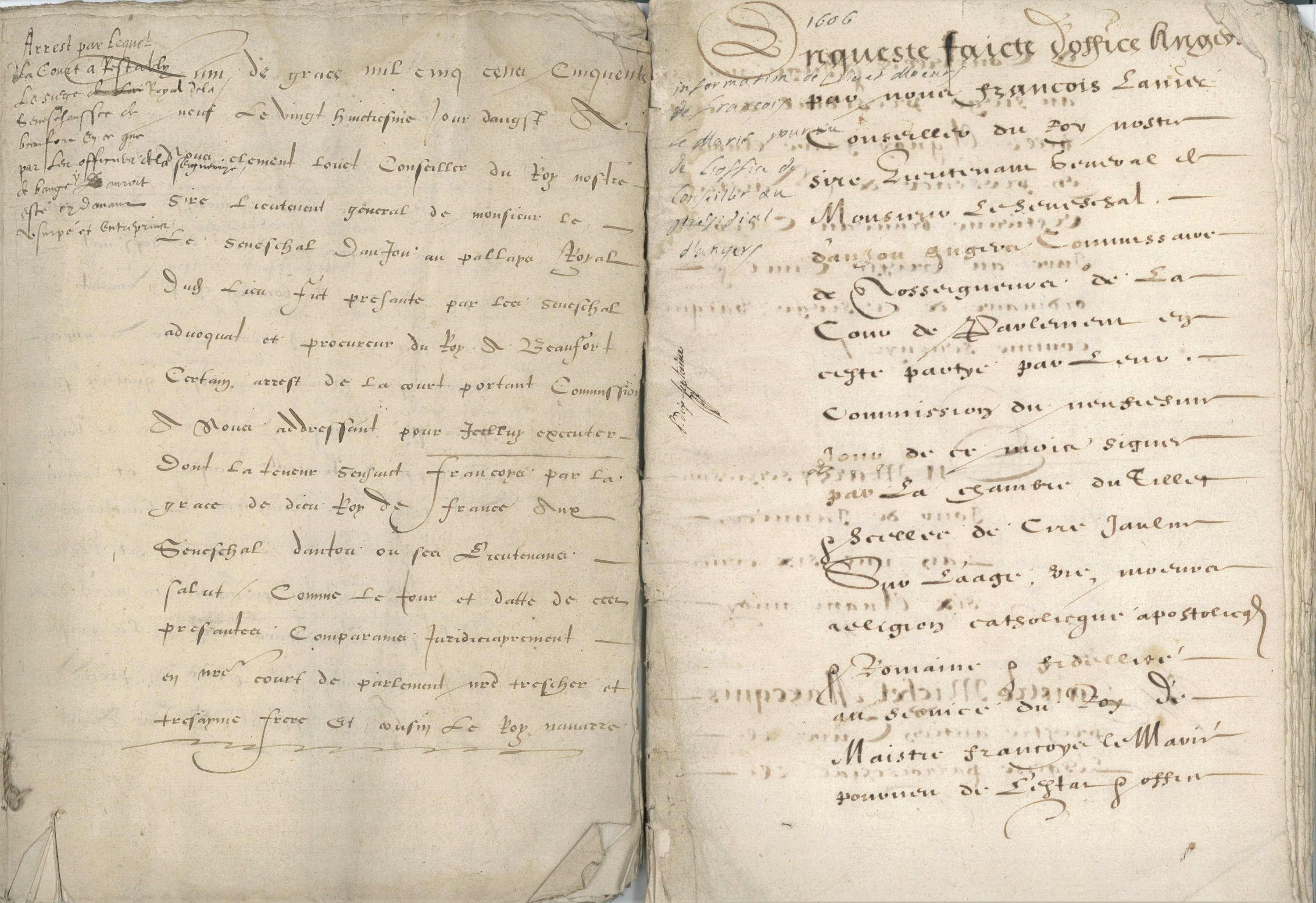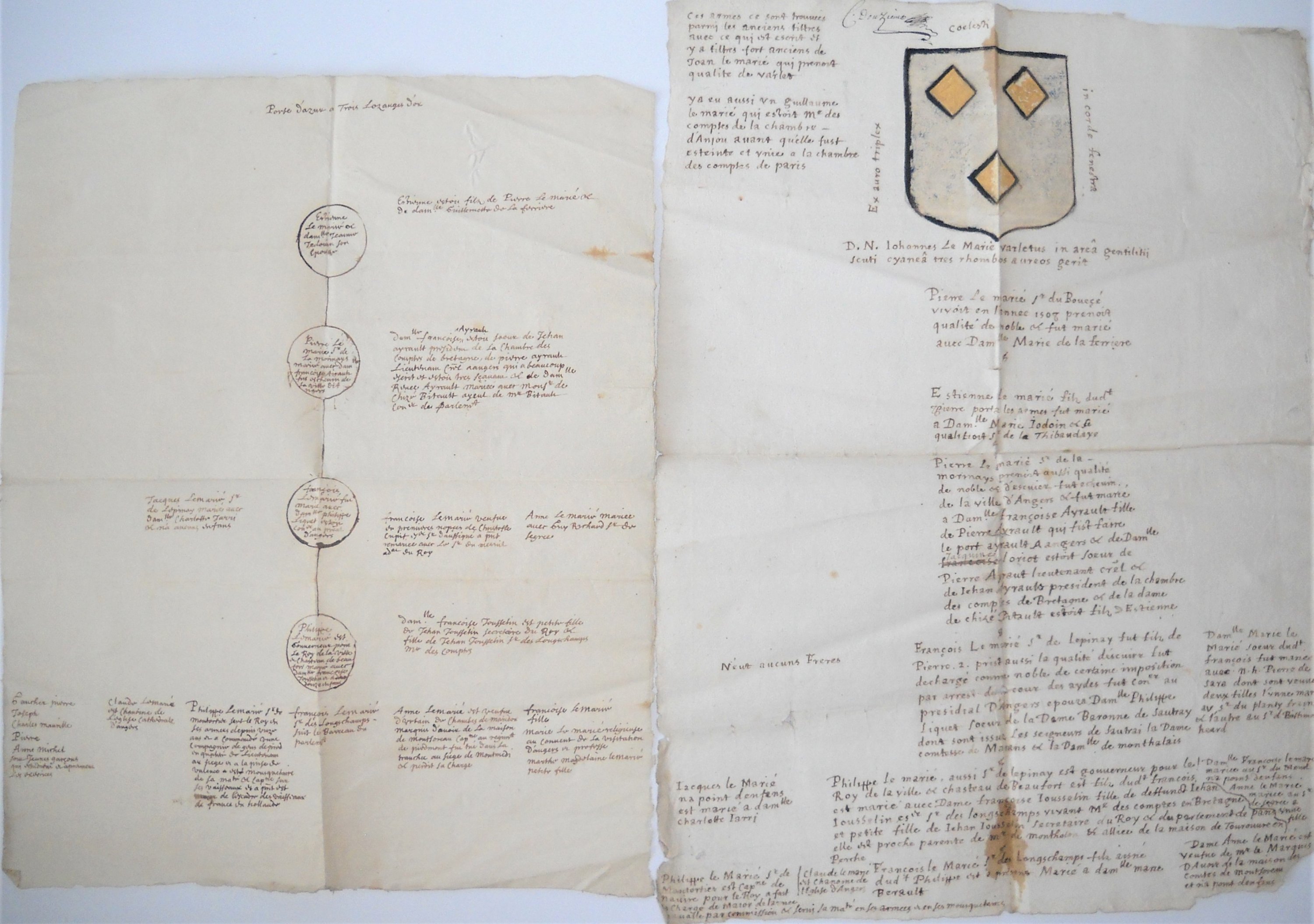 • Collation manuscrite, 16 janvier 1606, 49 pages in-folio, enquête et information faite sur demande du sénéchal d’Anjou « sur l’âge, vie, mœurs, religion catholique apostolique et romaine, et fidélité au service du roi » de François Le Marié, sieur de l’Espinay (1579-?), pourvu de l’état et office de conseiller et juge magistrat au siège présidial d’Angers ;