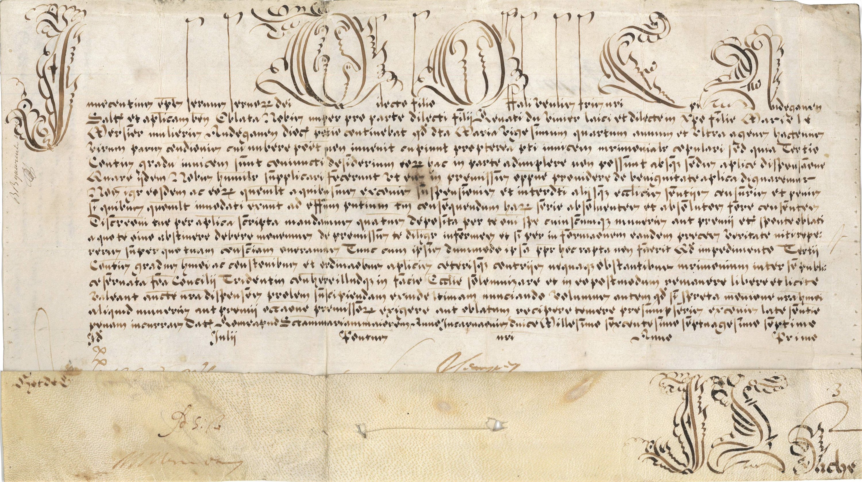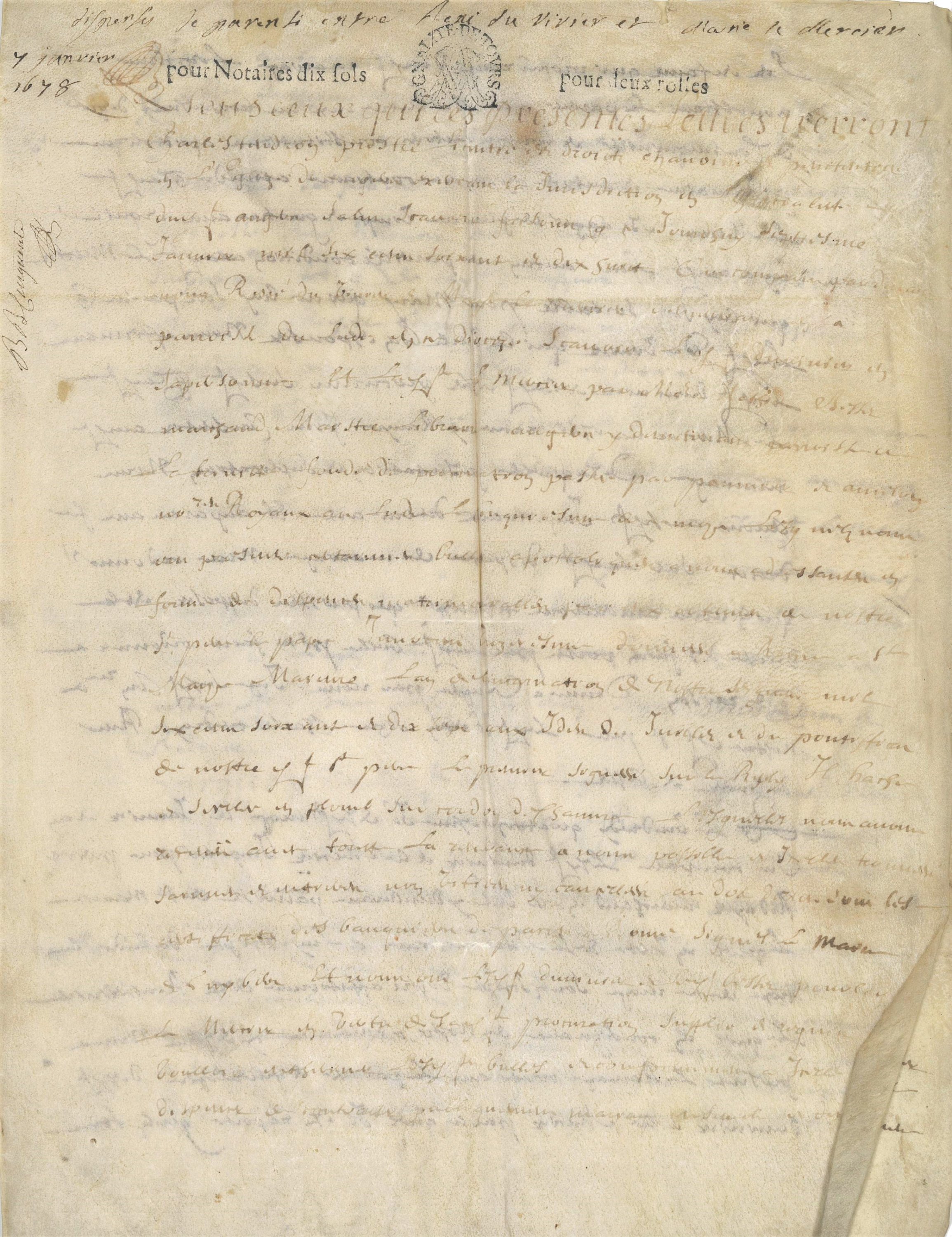 Bulle du pape Innocent XI (manque le sceau en plomb), juillet 1677, parchemin, 38 x 25 cm ; dispense de consanguinité en latin avec lettres capitales ornées accordée à René du Vivier [lieutenant de la bourgeoisie de la ville du Lude] et à Marie Le Mercier ; est inscrit en français au dos mention denregistrement et dauthentification signées Pierre Guibert: « Nous soubsignés conseillers du Roy banquiers expéditionnaires de la Cour de Rome demeurant à Paris, pour satisfaire aux ordonnances, certifions que la présente Bulle est vraye bonne et originale, bien et dument expédiée [
