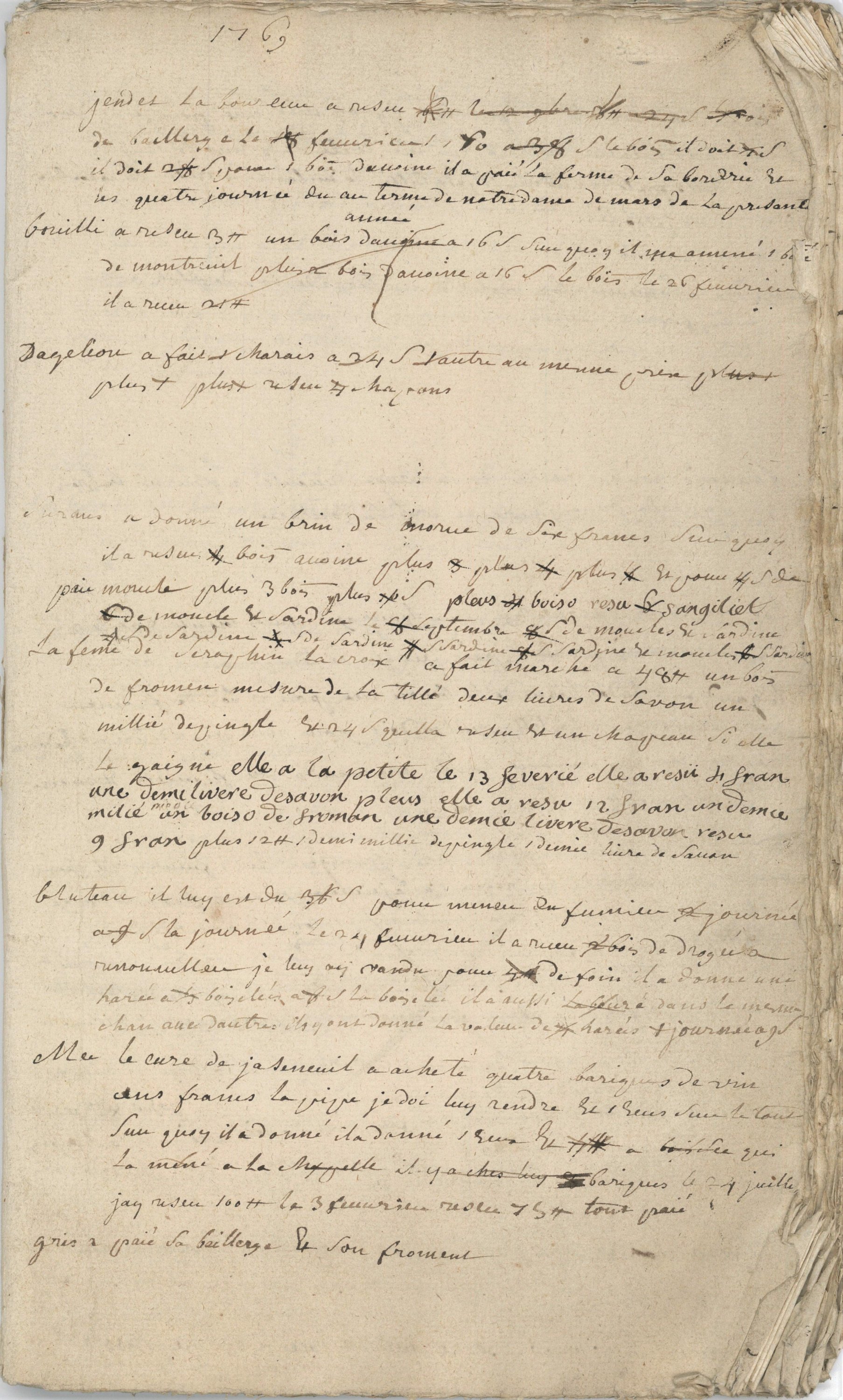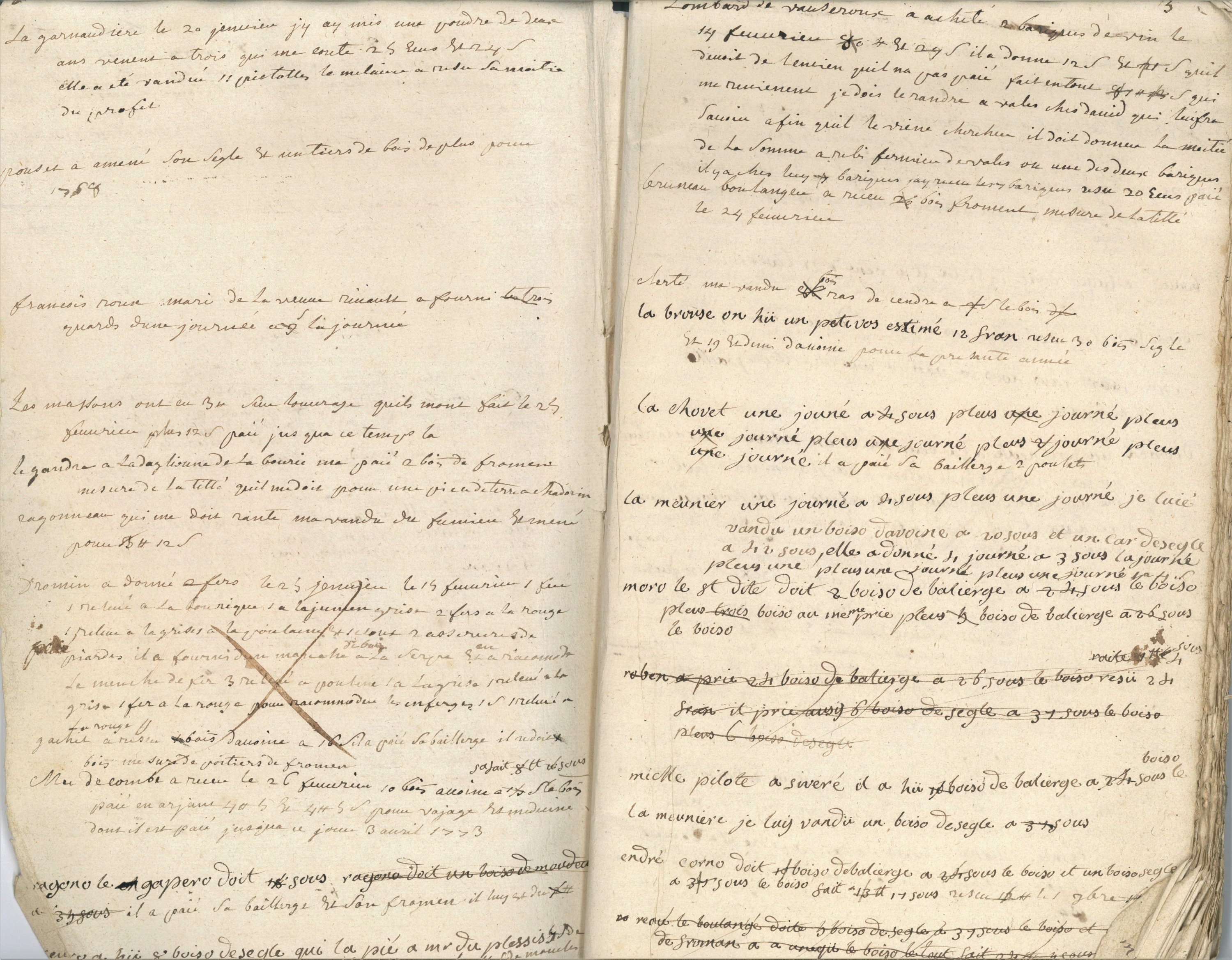 Cahier manuscrit anonyme, 1769-1775, 86 pages in-folio ; livre de comptes tenus par des régisseurs inscrivant les paiements des fermes et locatures, ventes de bleds, vins et bétails, des rentes dues, du coût de la main d’œuvre journalière, des travaux de maçonnerie, de ferronnerie, etc ; Concerne des exploitations agricoles des communes de Vasles et alentours (Deux-Sèvres et Vienne): Vaubrune, la Giborlière, la Gourjaudière, la Bourie, etc.