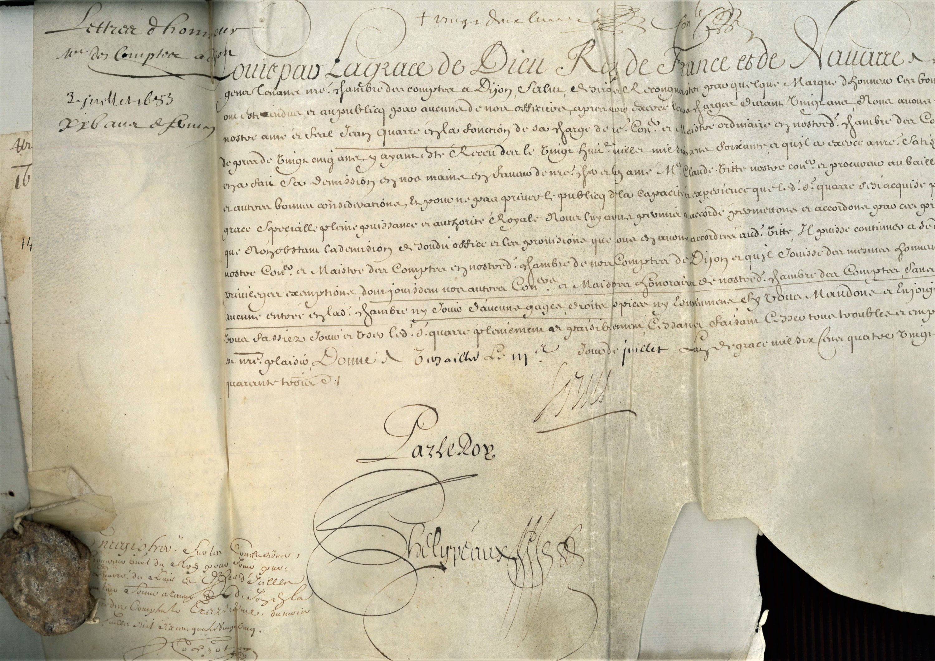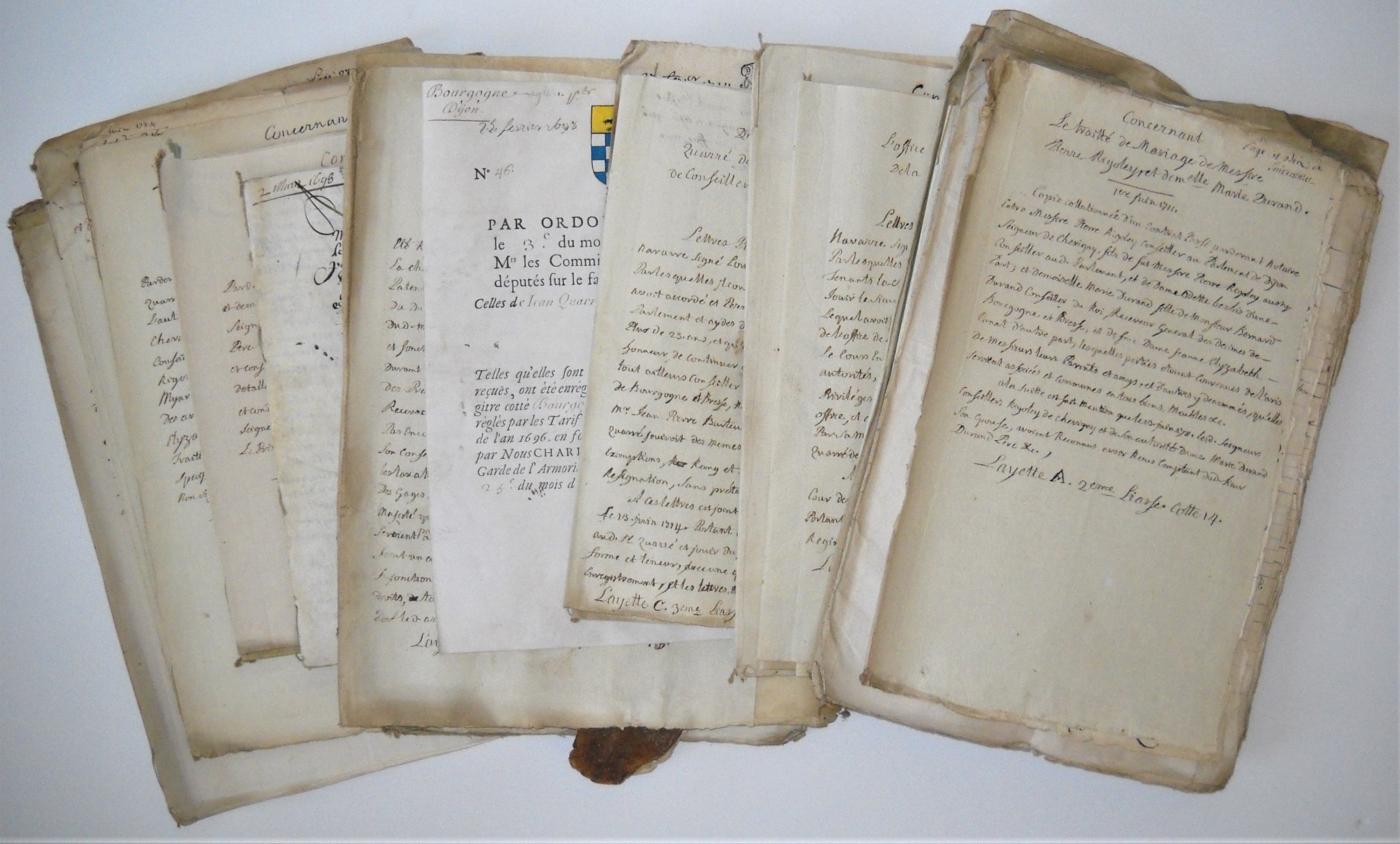 Env. 40 pièces manuscrites, papier et parchemin, formats divers ; copies d’actes notariés, pièces de procédures et lettres patentes royales signées "Louis"