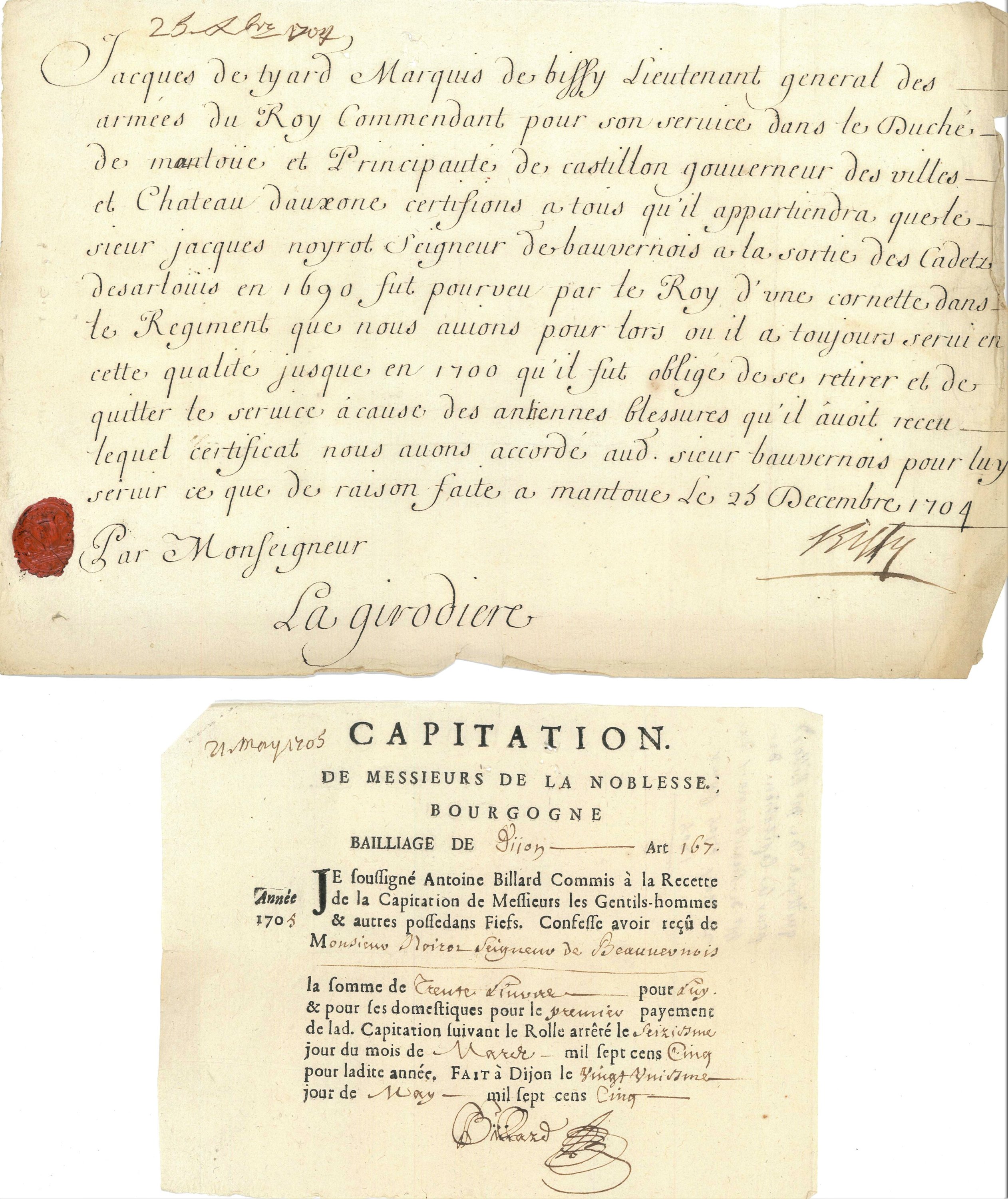 P.S., Mantoue, 25 décembre 1704, Jacques de Thyard de Bissy (1648-1744), lieutenant général des armées du roi, commandant dans le duché de Mantoue et la principauté de Castillon ; Certificat de service délivré à Jacques Noirot « à la sortie des cadets de Sarrelouis en 1690, fut pourvu par le roi dune cornette dans le régiment que nous avions pour lors où il a toujours servi cette qualité jusquen 1700, quil fut obligé de se retirer et de quitter le service à cause des anciennes blessures quil avait reçu »