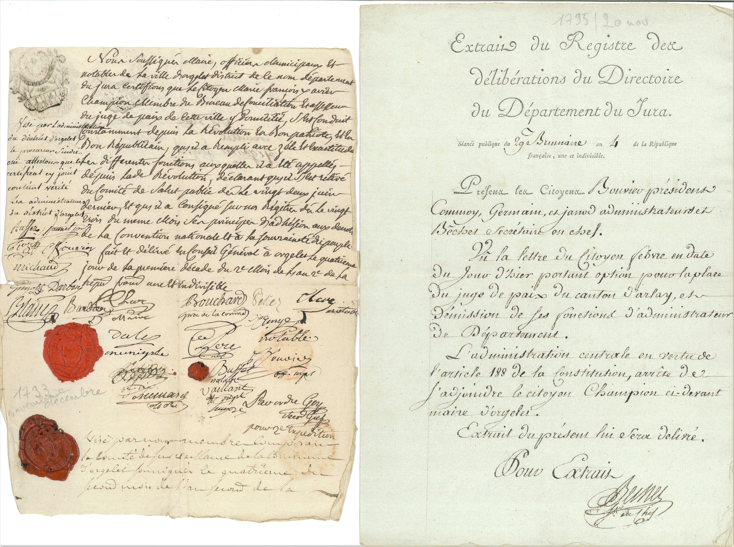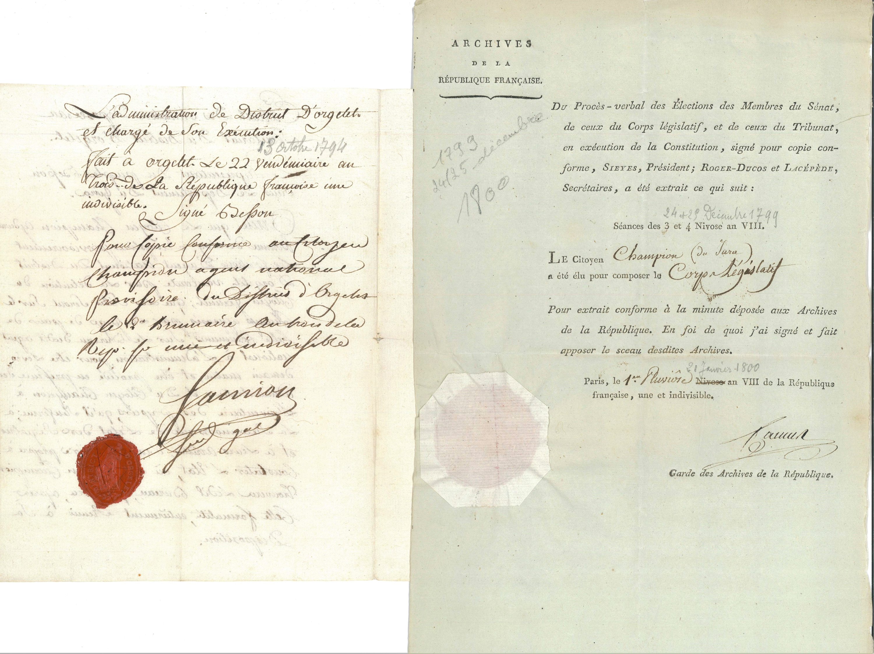 2 passeports de circulation délivrés par les municipalités de Lons-le-Saunier et dOrgelet, 1792 et 1794 ; Extrait des délibérations de la commune dOrgelet destituant Champion de son mandat de maire, 4 octobre 1793 ; Certificat de bon patriote délivré par le Conseil général dOrgelet, novembre 1793 ; Extrait de minute de la nomination comme agent national du district dOrgelet, 13 octobre 1794 ; Arrêté de nomination par ladministration du département du Jura à la fonction dadministrateur du département, 20 novembre 1795 ; Proclamation de lélection de Champion comme député au Conseil des Anciens, 9 avril 1797 ; Certificat denregistrement en qualité de député au Conseil des Anciens, 15 mai 1797, signé par Armand Gaston Camus (1740-1804), garde des Archives de la République ; Belle L.A.S., 11 juillet 1797, signées par les 5 députés du Jura représentants au Conseil des Cinq-Cents et au Conseil des Anciens : Jean-Joseph-Joachim Janod (1761-1836), Etienne Joseph Ferroux (1751-1834), Antoine Grenot (171748-1809), Pierre René Athanase Babey (1743-1815), François-Joseph Febvre (1763-1832) ; Extrait de minute du procès-verbal des élections, 21 janvier 1800, signé par Armand Gaston Camus (1740-1804), garde des Archives de la République, confirmant sa nomination comme membre du Corps législatif ; 2 L.A.S., 1805 et 1808, Théodore Vernier (1731-1818), ancien député du Jura au Conseil des Cinq-cents et sénateur, fervent opposant à Bonaparte ; Cahier manuscrit des comptes des recettes et dépenses tenus par François Xavier Wishoffer, régisseur du domaine de Charnod appartenant à François Xavier Champion, 1806-1807 ; Registre manuscrit, couverture en parchemin, + de 128 pages in-fol., comptes des rentes dues à Louis François Champion, avocat en parlement à Charnod, puis à son fils François Xavier, milieu du 18e et début du 19e siècle ; etc.