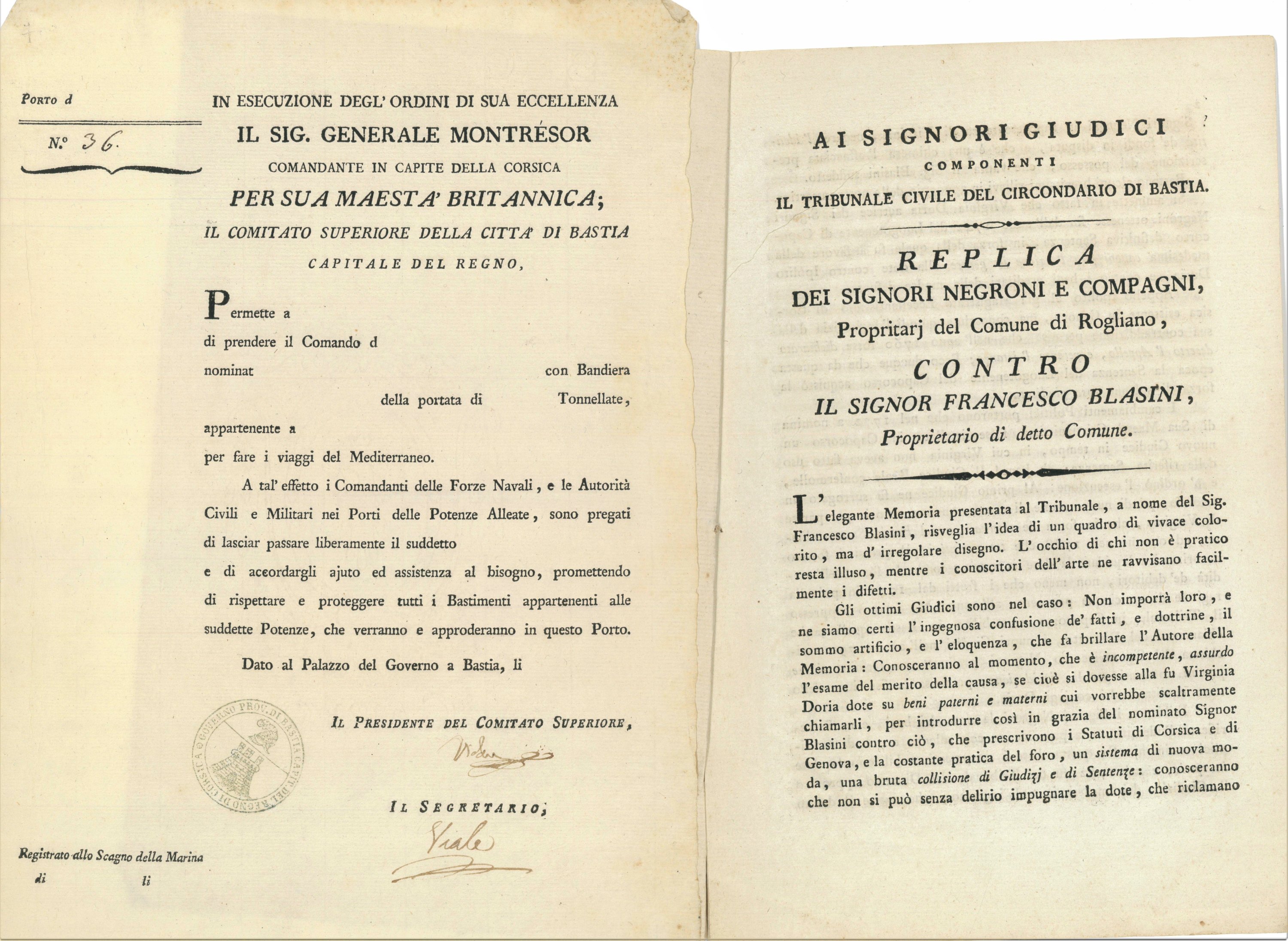 Mémoire imprimé du tribunal de Bastia, 1812, concernant les familles Negroni et Blasini de Rogliano, 13 pages in-4 ;