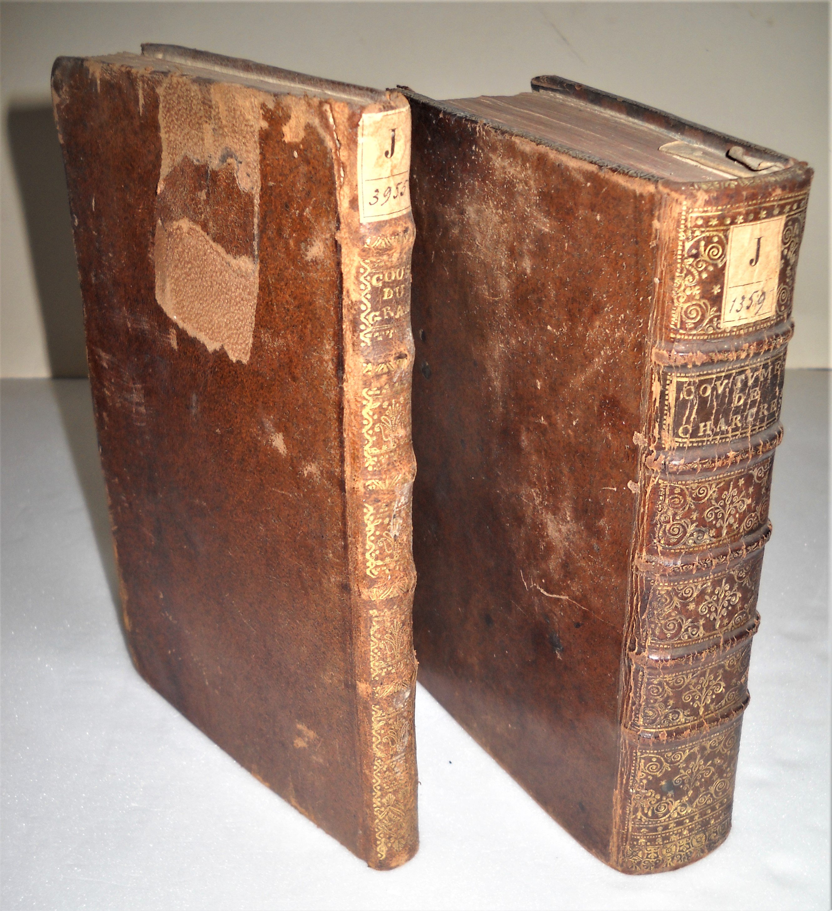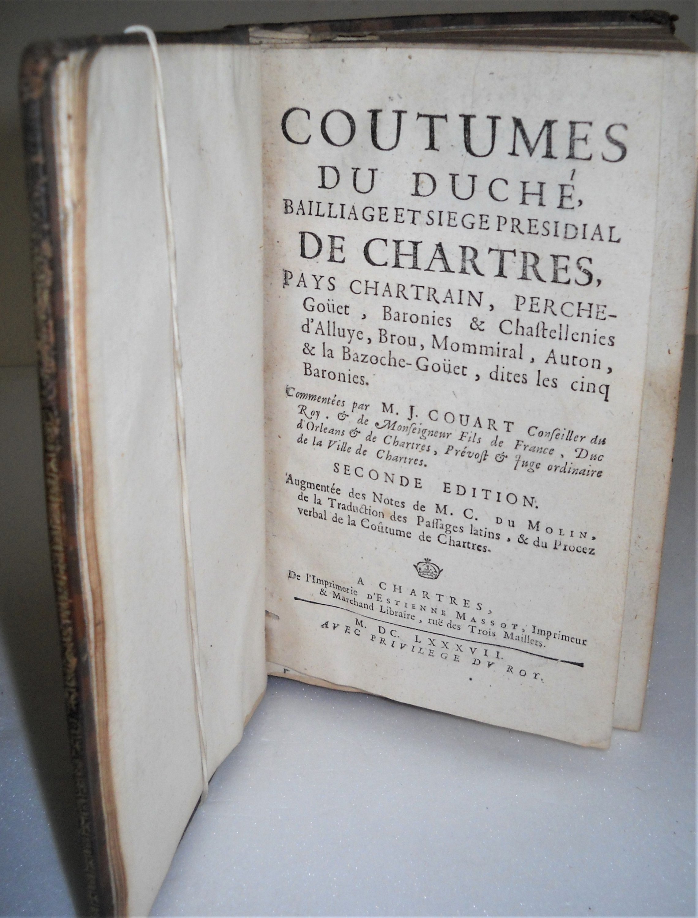 Coutumes du Duche, Bailliage et Siège Présidial de Chartres, Pays Chartrain, Perche-Gouet, Baronnies & Chastellenies d'Alluye, Brou, Mommiral, Auton & la Bazoche-Gouet, Dites les Cinq Baronies. Commentées par M. J. Couart Conseiller du Roy. & De Monseigneur Fils de France, Duc d'Orléans & de Chartres, Prévost & Juge Ordinaire de la Ville de Chartres. Seconde édition. Augmentée des Notes de M. C. du Molin, De la Traduction des Passages Latins, & Du Procez Verbal de la Coutume de Chartres, Chartres, de limprimerie dEstienne Massot, 1687, rel. en plein cuir dépoque in-8, (8)-592 pp., (Dos frottés, défauts dusage aux coiffes et aux coins, intérieur très propre sans mouillures ni rousseurs, qqs petits trous de ver). En début et fin de louvrage, ajout de 10 pages manuscrites à la plume: « Michel Tiphaingne huissier à cheval au chastelet de Paris demeurans à Chartres » ; « Le 5 avril 1713 il a été jugé deux choses par arrest de la cour