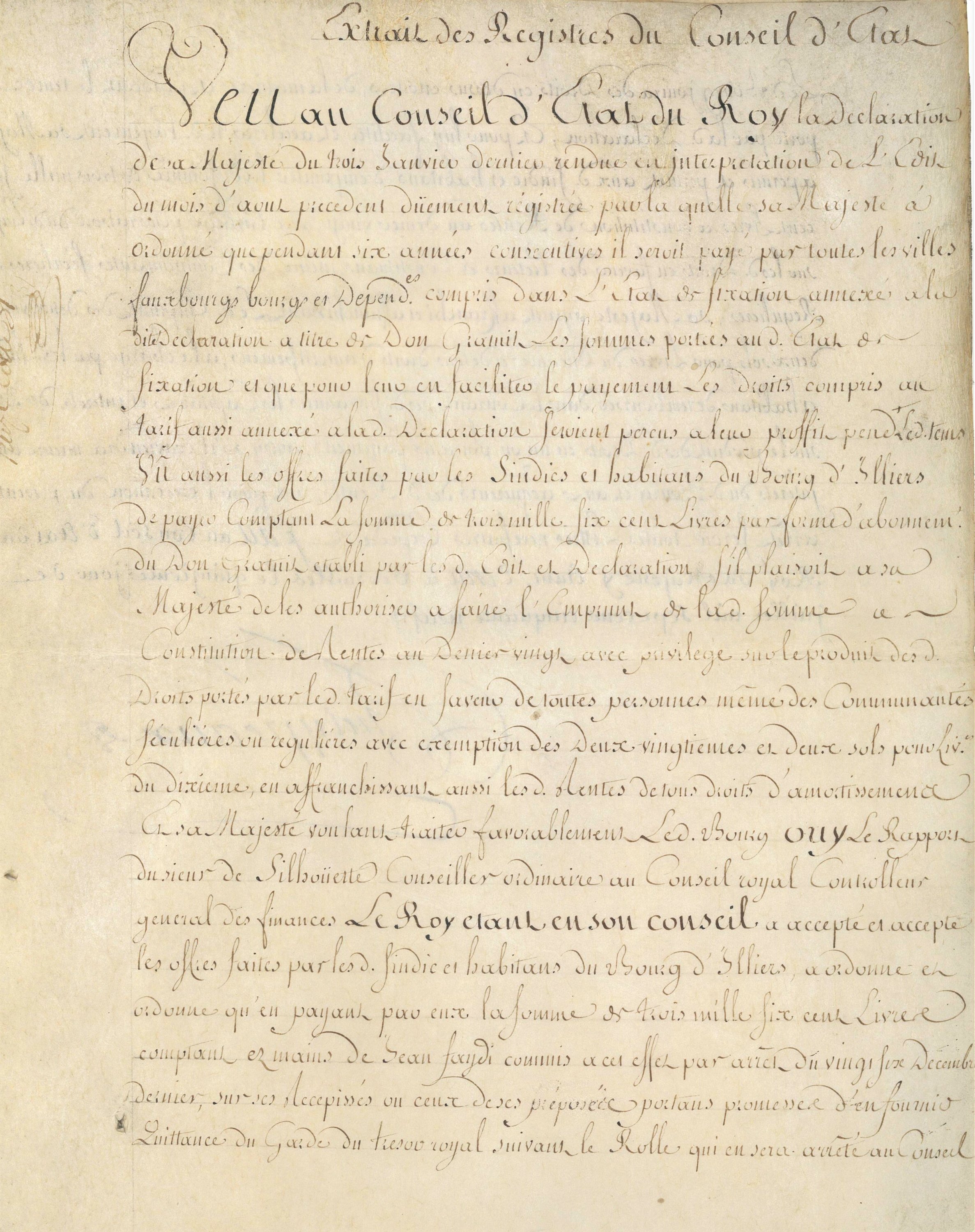 JOINT: 3 pièces manuscrites : Copie de la transaction, 16 novembre 1641, passée entre les seigneurs dIlliers au sujet de la terre des Radrets à la Bazoche Gouet, 20 pp. in-4 sur parchemin ; Copie du contrat de vente, 27 juillet 1670, de la terre des Radrets à la Bazoche-Gouet par messire Louis dIlliers chevalier seigneur des Radrets pour 18500 livres, 36 pp. in-4 sur parchemin, avec ajout manuscrit et signé de Montmorency seigneur de Courtalain pour le rachat du fief et de la métairie de la Touche au Gault du Perche ; Copie de constitution de rente, 18 juin 1781, passée par messire Louis comte de Meaussé de la Rainville chevalier seigneur de Villebeton, Bouffry et autres lieux, 4 pp. in-8 sur parchemin.