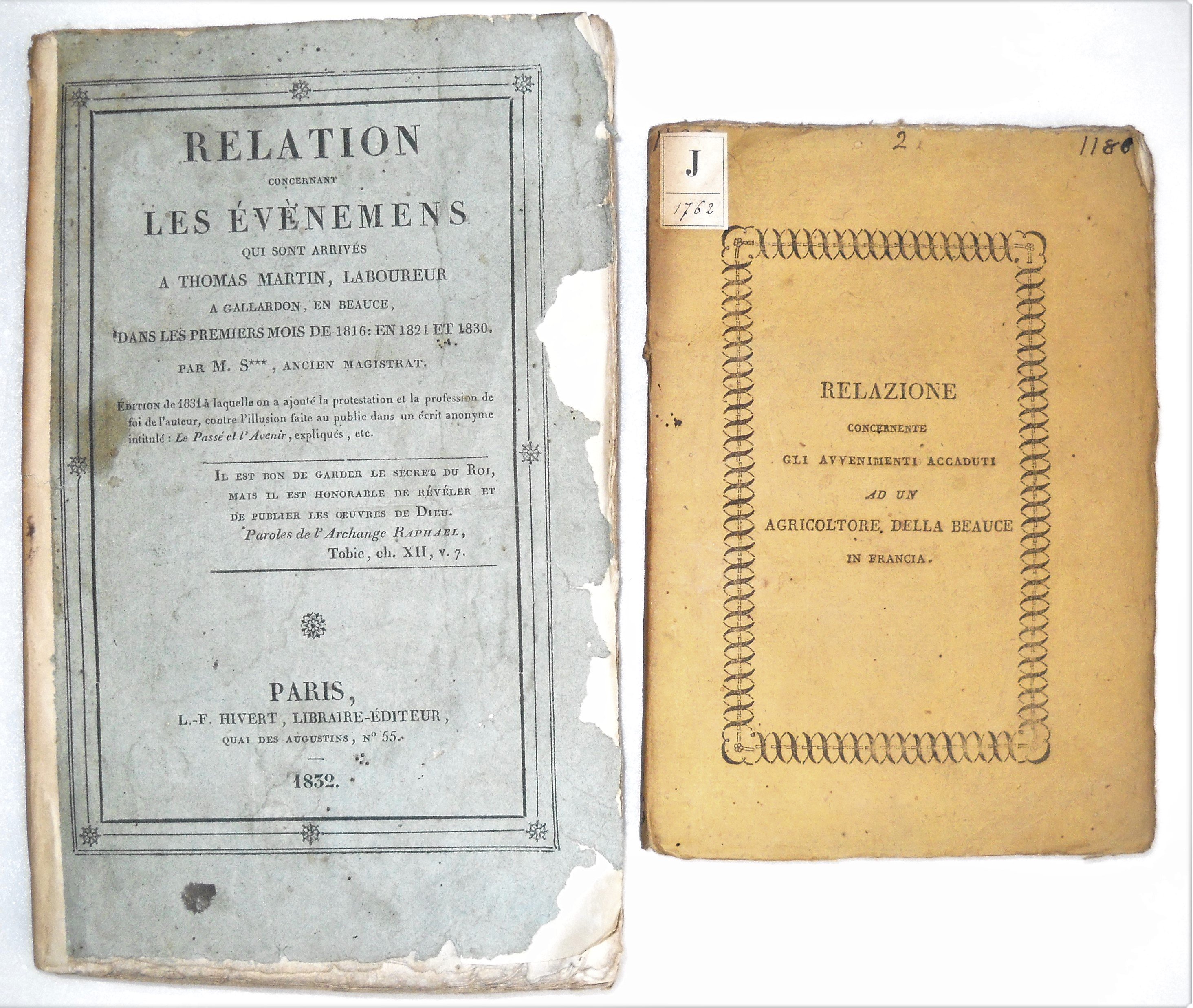 Joint: rare édition italienne Relazione concernente gli avvenimenti accaduti ad un agricoltore della Beauce in Francia nei primi mesi del 1816 [Relation concernant les événements survenus à un fermier de Beauce en France dans les premiers mois de 1816], Imola, 1822, br. in-12, 116 pp.