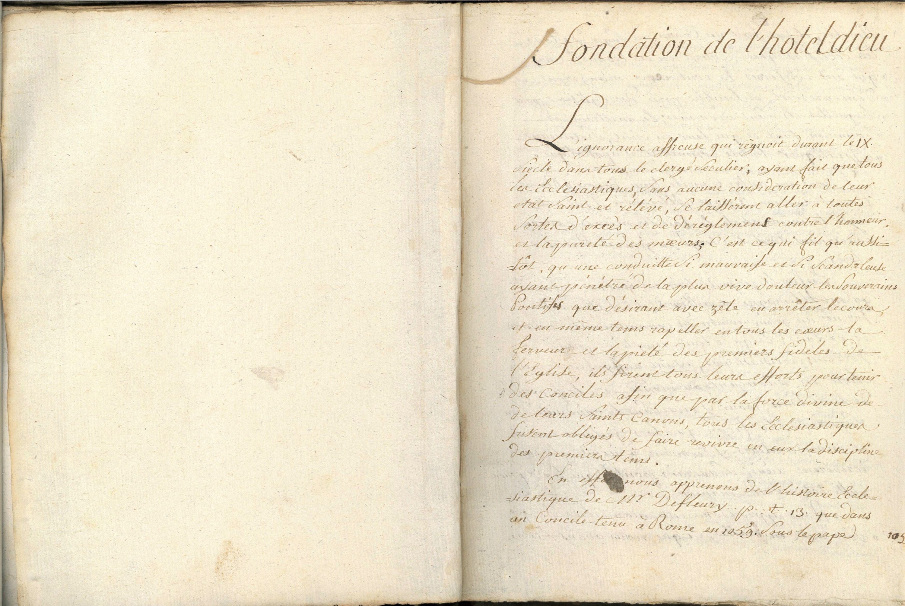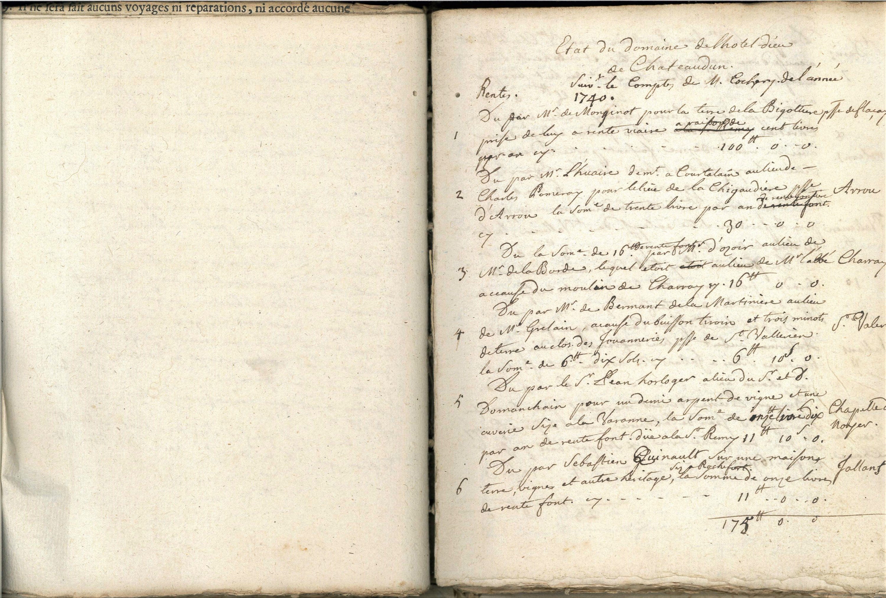 Rarissime recueil d'un brouillon-manuscrit comprenant : la liste des Noms des maitres de l'hotel-dieu de Châteaudun depuis son origine jusqu'en 1737 ; Noms des prêtres de l'hotel-dieu depuis environ 1100 jusqu'en 1775 ; Noms des administrateurs de l'hotel-dieu depuis la déclaration de 1548 jusqu'en 1777 ; Fondation de l'hotel-dieu et son histoire jusqu'en octobre 1777 ; Etat du domaine de l'hotel-dieu de Chateaudun suivant le compte de M. Cochery de l'année 1740.