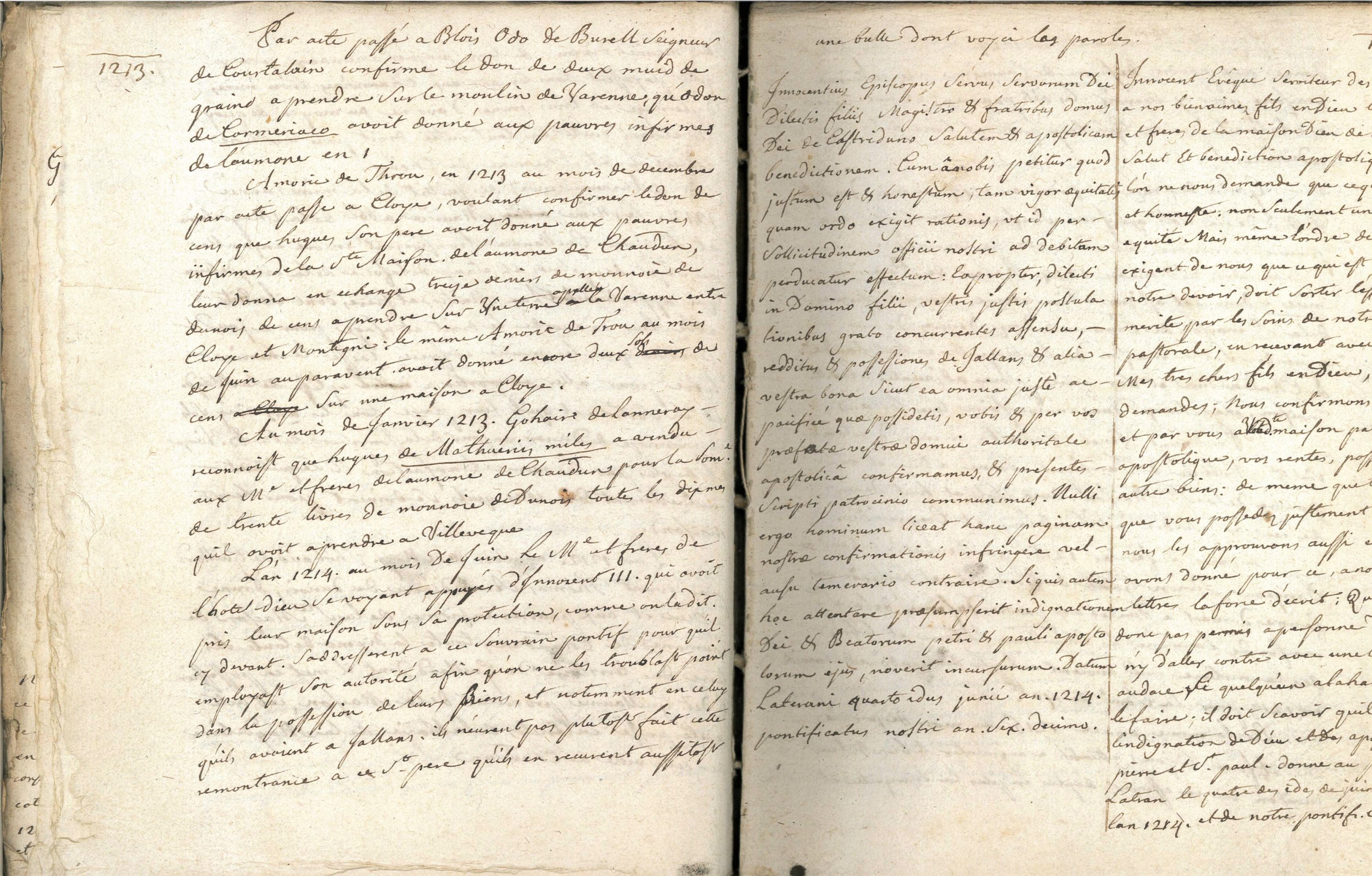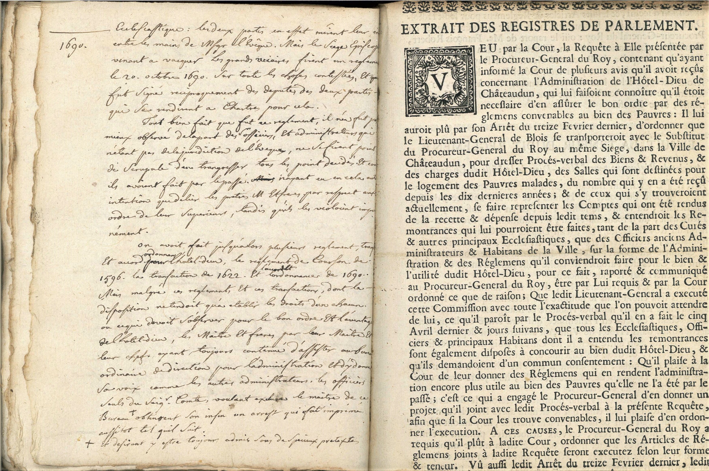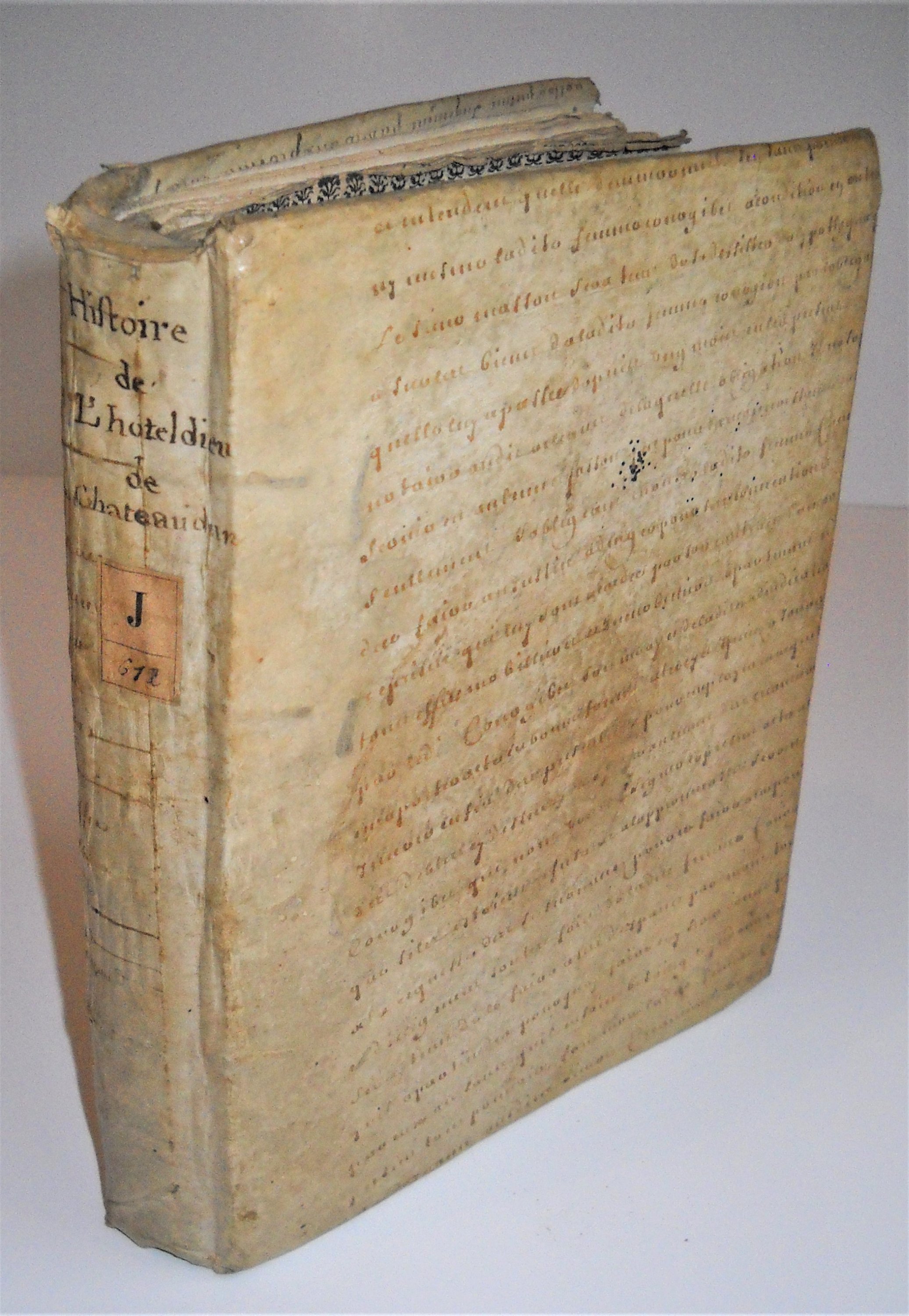 Histoire de l'Hôtel-Dieu de Châteaudun, manuscrit anonyme, fin du 18e siècle, rel. parchemin in-4, 318 pp. ;