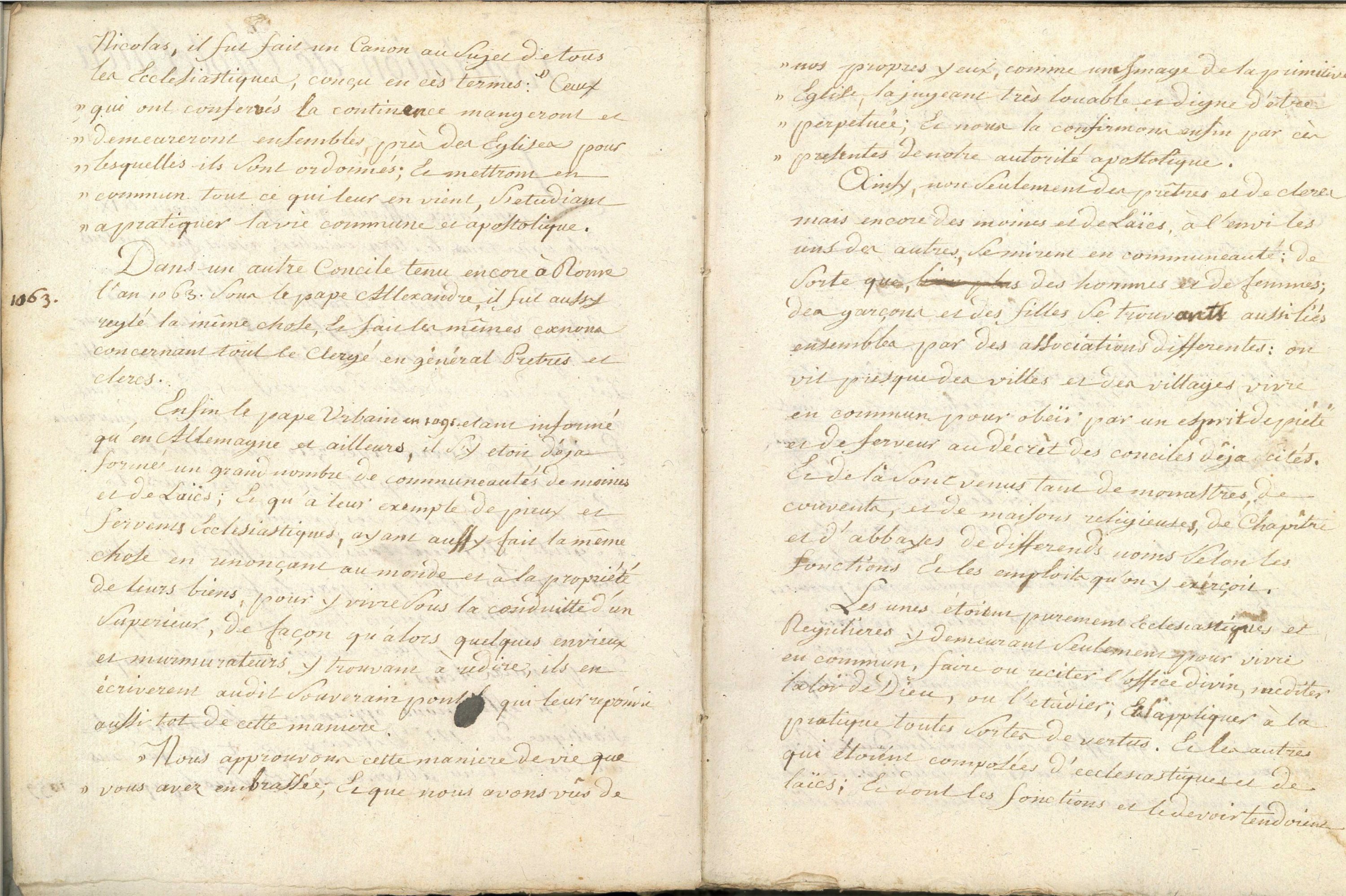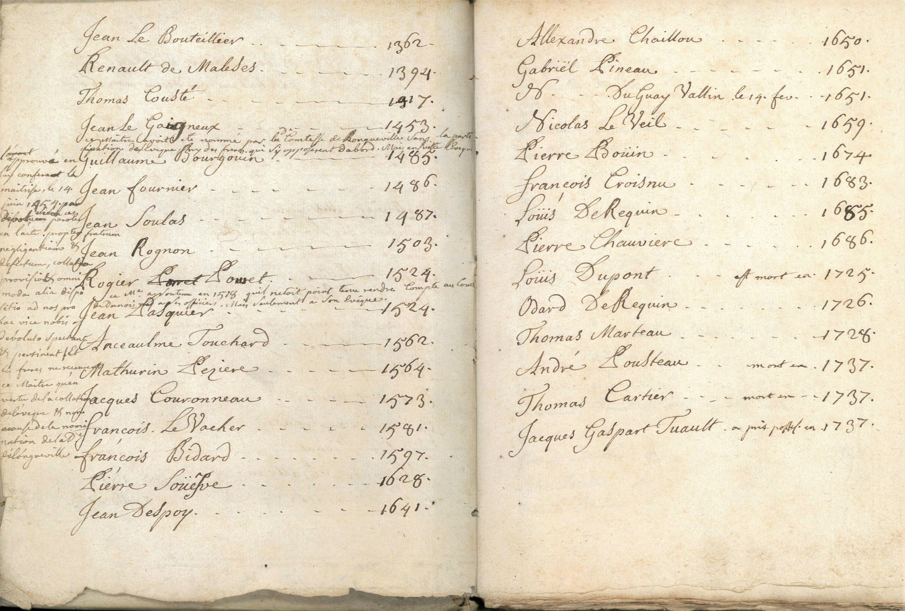 Manuscrit inédit écrit par deux mains différentes, pouvant être attribué pour une partie à l'abbé Alexandre Courgibet (1706-1778), ancien frère condonné de l'hôtel-dieu et chantre en dignité de la Sainte Chapelle du château de Châteaudun, historien du Dunois qui a écrit Essai de L'histoire du Comté et Bailliage du Dunois, composé de 2 tomes: une Histoire générale du comté et baillage de Dunois : histoire civile et politique de Châteaudun et du Dunois, et une Histoire particulière de la religion des Dunois.