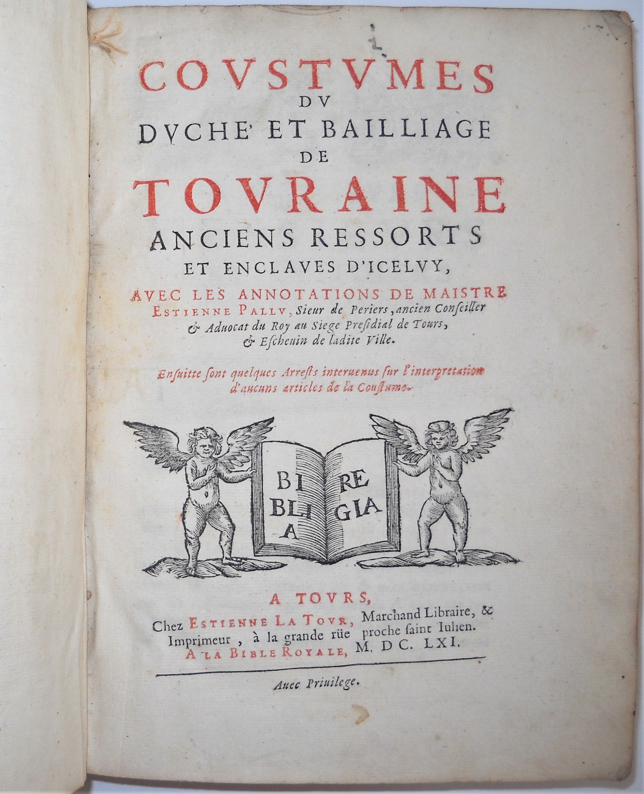 Coustumes du Duché et Bailliage de Touraine, anciens ressorts et enclaves d'iceluy. Avec les annotations de Maître Estienne Pallu, Sieur de Périers, ancien conseiller et advocat du Roy au Présidial de Tours, Tours, Estienne La Tour, 1661, rel. in-4 veau du temps (en létat), (26)-775 pp., intérieur propre (qqs piqûres) ;
