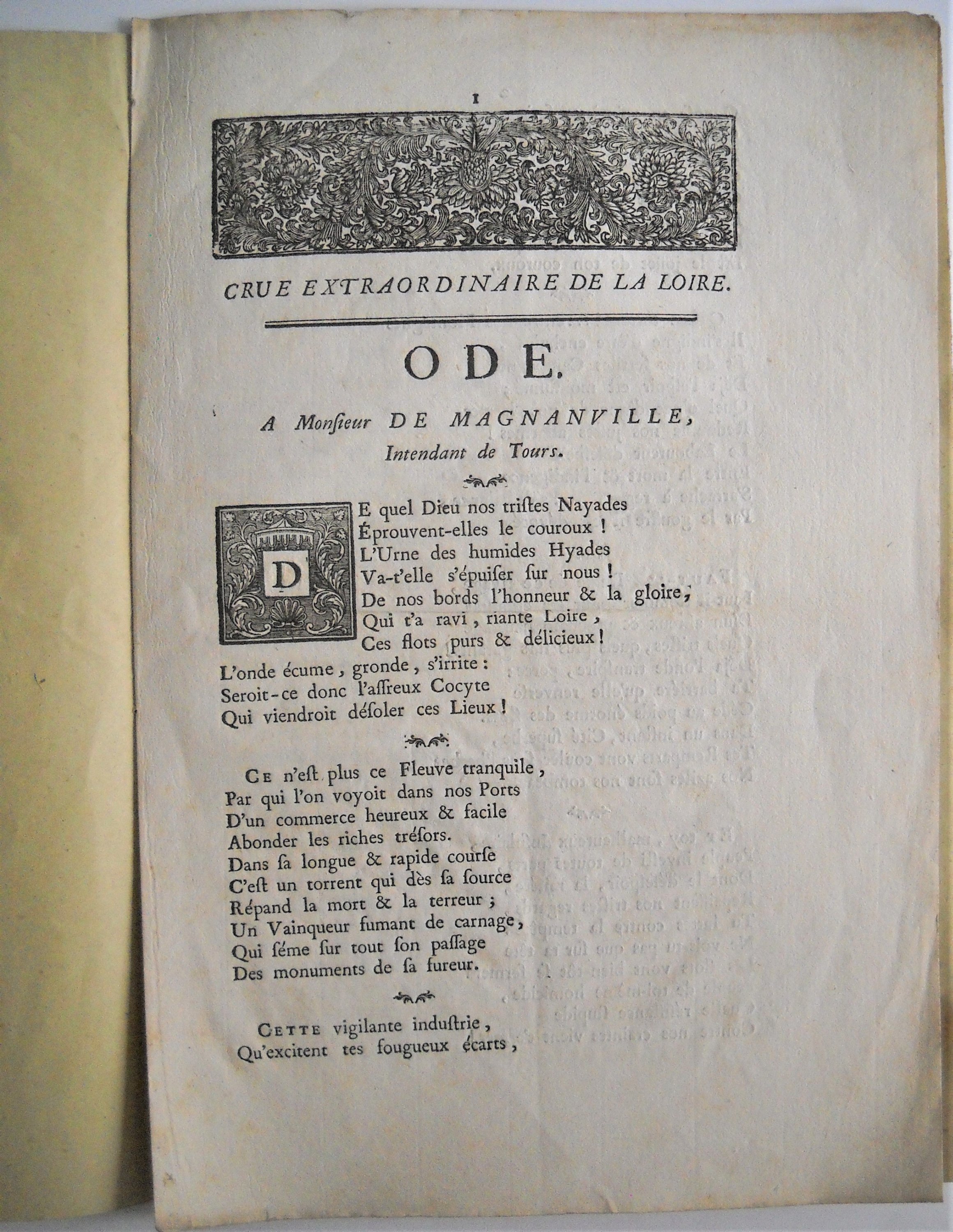 Crue extraordinaire de la Loire - Ode à monsieur de Magnanville, intendant de Tours, Tours, impr. F. Vauquer, 1755, 4 pp. in-fol. ; Duvergé, Mémoire topographiques, physique et médecinal ou traité sur la situation de la ville de Tours