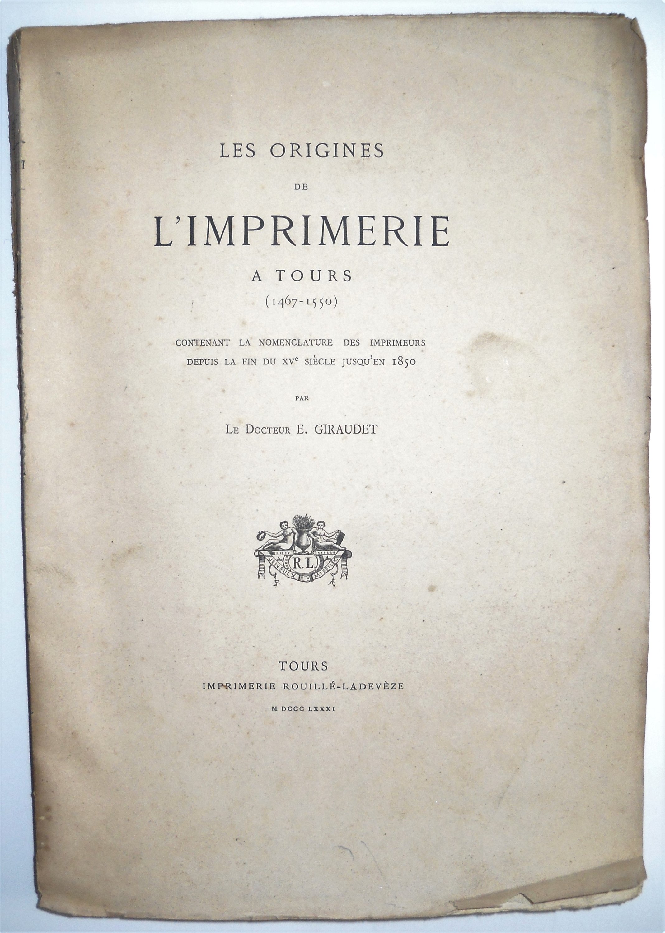 Eugène Giraudet, Les origines de limprimerie à Tours (1467-1550), Tours, Rouillé-Ladevèze, 1881, br. in-4, viii-130 pp., ex. sur vergé n°129/175. Rare.
