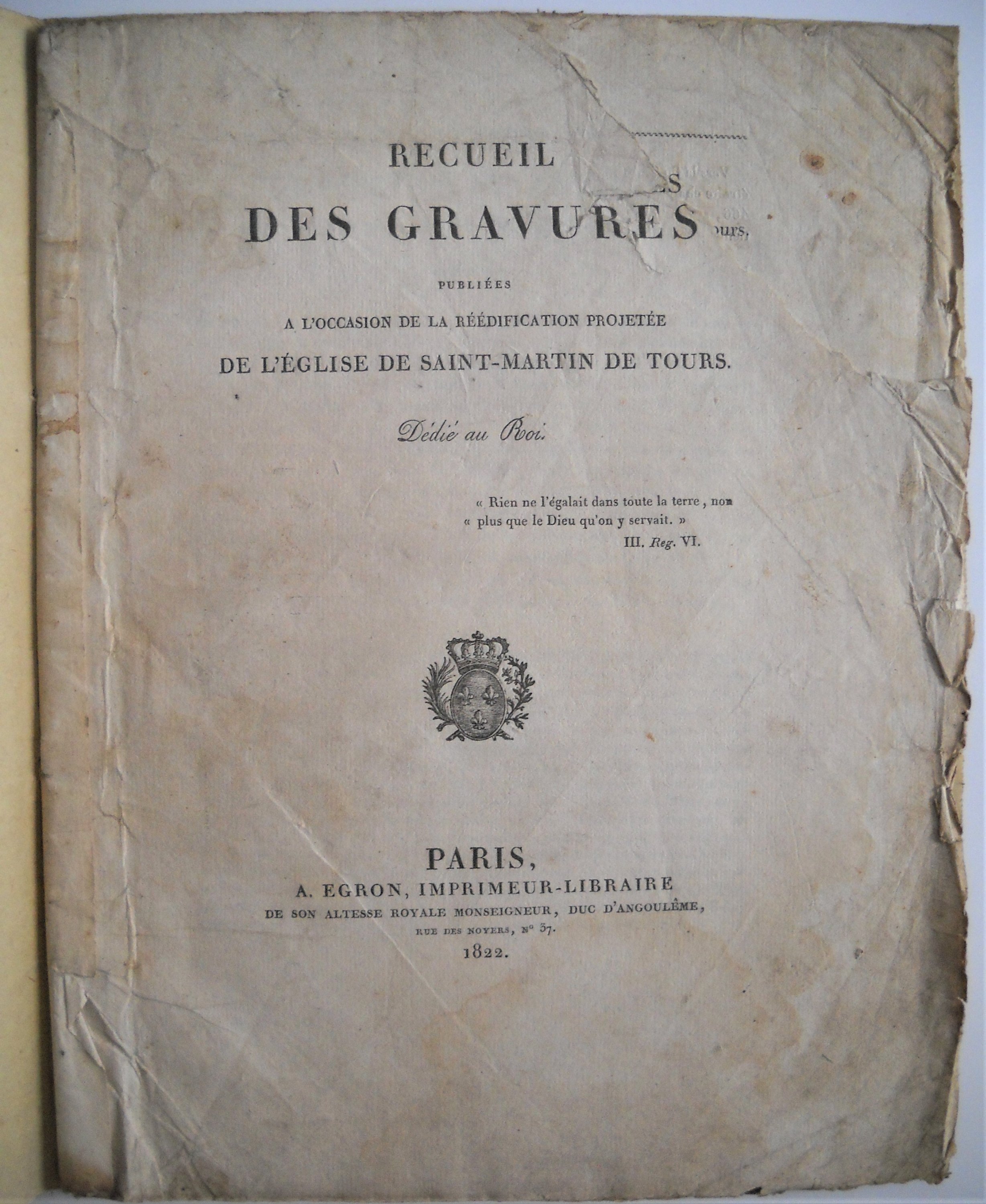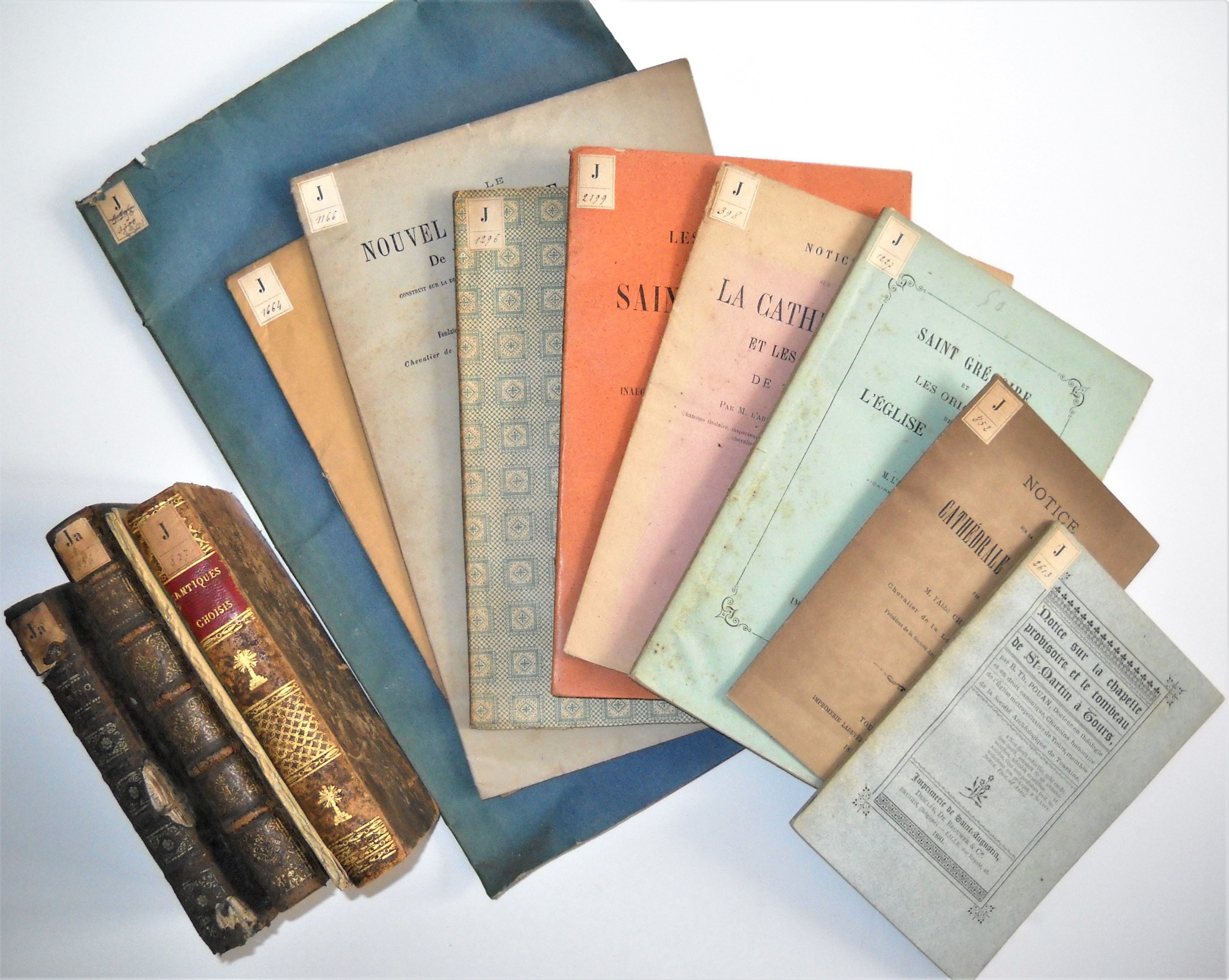 Paris, 1791, br. in-8, 54 pp. ; Recueil de cantiques à lusage des missions de France, Tours, 1820 ; Abbé Debeaux, Offices des grandes fêtes avec tous les psaumes en faux bourdon, Tours ; Recueil des gravures publiées à l'occasion de la réédification projetée de l'église de Saint-Martin de Tours, Egron, Paris, 1822, in-4, 8 pp. illustrées de 8 planches gravées (manque à la page de titre et déchirure p. ¾, mouillures) ; Abbé Rolland, Saint Grégoire et les origines de léglise de Tours, Tours, 1870 ; Abbé Manceau, Notice sur la cathédrale et les églises de Tours, Tours, 1875 ; Ply, Le nouvel orgue de chur de la métropole de Tours, Lyon, 1877 ; Giry, Chartes de Saint-Martin de Tours collationnées par Baluze sur les originaux, 1881 ; Pouan, Notice sur la chapelle provisoire et le tombeau de St Martin à Tours, Bruges, 1881 ; Les fêtes de Saint Martin en 1890, Tours, 1890.
