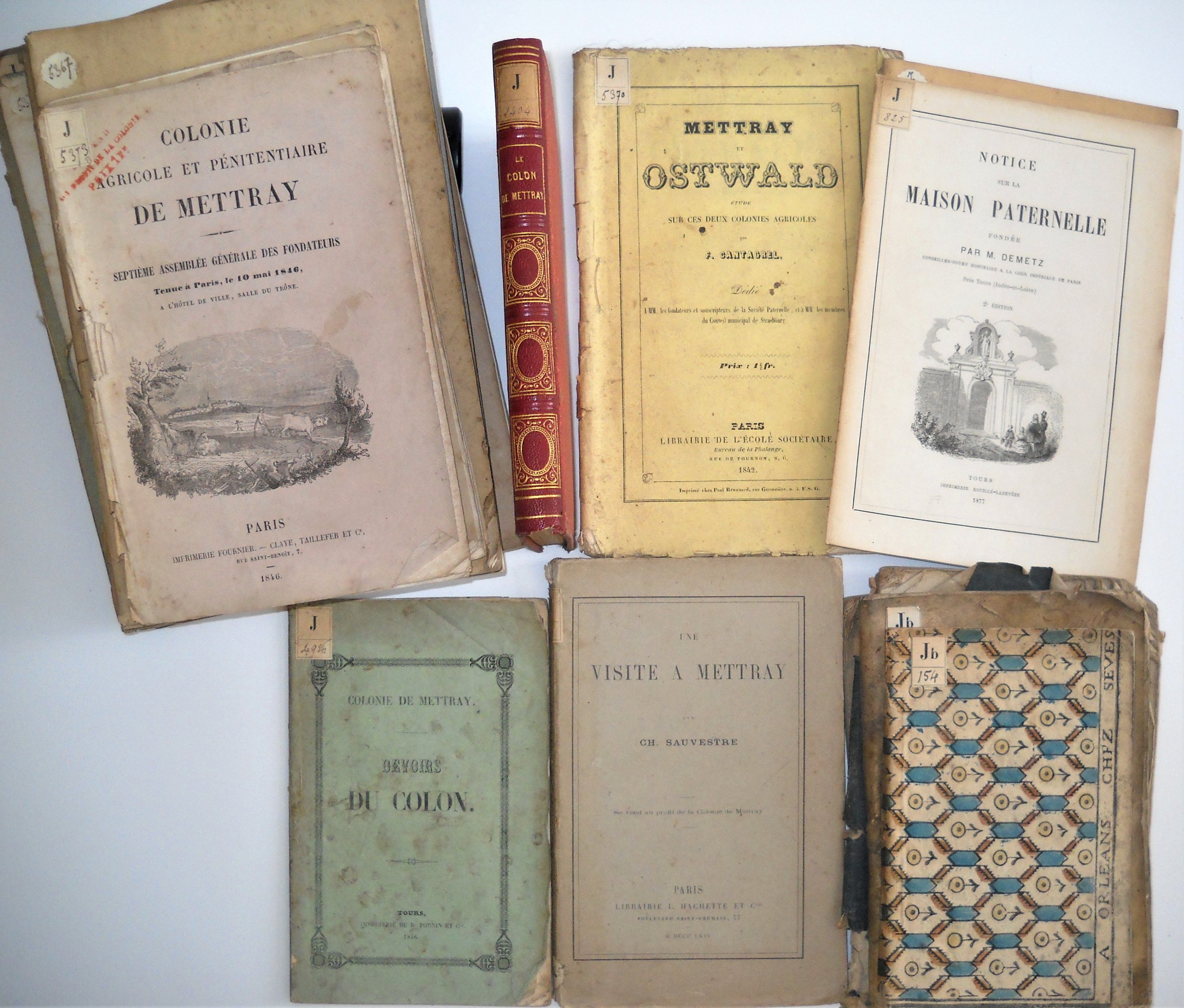 F.-A. Demetz : Fondation dune colonie agricole de jeunes détenus à Mettray, 1839, avec envoi autographe signé ; Notice sur la colonie de Mettray, 1863 ; Lettre sur la colonie de Mettray ; Abbé Pelletier, Sermon de charité en faveur de la colonie agricole de Mettray, 1841 ; F. Cantagrel, Mettray & Ostwald, étude sur ces deux colonies agricoles, 1842 ; A. Giraud, Colonie de Mettray, devoirs dun colon, 1846 ; A. Cochin, Mettray en 1846, 1847 ; P. Huot, Trois jours à Mettray, 1848 ; Ch. Sauvestre, Une visite à Mettray, 1864 ; E. Nyon, Le colon de Mettray, 1867 ; J.M. Guardia, La colonie agricole de Mettray, 1869 ; Bertin, Colonie agricole et maison paternelle de Mettray, 1873 ; 5 bulletins des rapports annuels de la colonie de Mettray, années 1845, 1846, 1853, 1874 et 1877 ; Notice sur la maison paternelle fondée par M. Demetz, 1877 ; etc ;