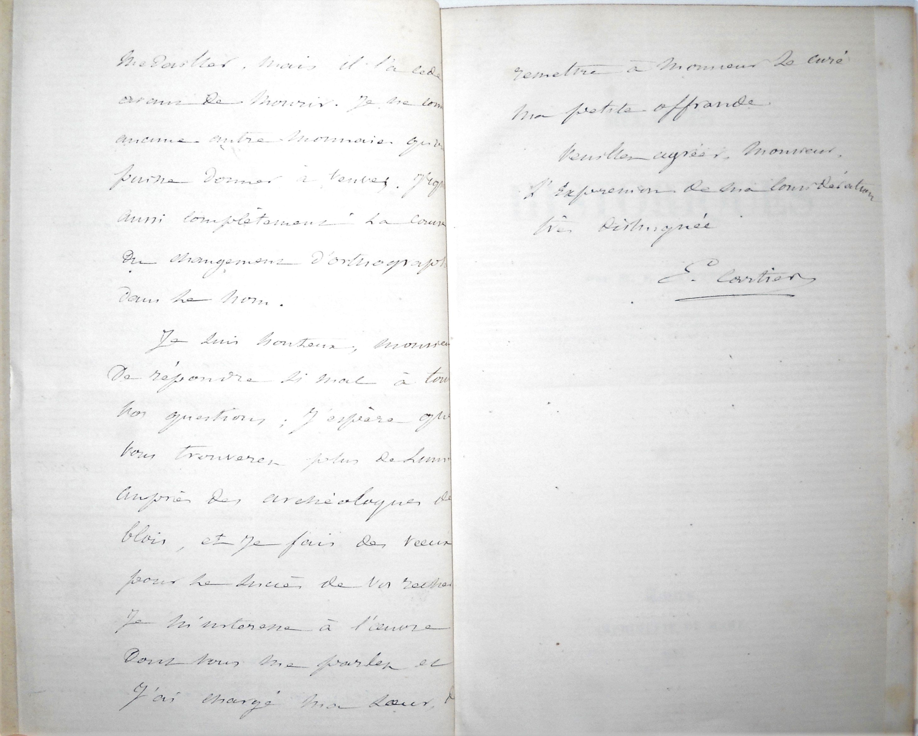 Etienne Cartier, recueil factice, rel. ½ maroquin vert in-8, comprenant : L.A.S. du 3 mars 1882 ; Mélanges historiques, Tours, 1842 ; Amboise en 1465, Paris, 1839 ; L.A.S. écrite dAmboise le 18 mars 1858 ; Essais historiques sur la ville dAmboise et son château, Poitiers, 1842 ; L.A.S. dAmboise du 14 décembre 1855 ; Rectification historique de la généalogie des seigneurs dAmboise, 1831 ; Notice sur la mairie dAmboise, avec 5 pl. illustrées, Tours, 1854 ; Représentations dramatiques à Amboise aux XVe et XVIe siècles ; De la conjuration dAmboise et de ses traces dans les archives de la mairie de cette ville ; Monnaies gauloises du camp dAmboise ; Monnaies frappées en Corse par Théodore et Paoli ; Monnaies historiques frappées par les prétendants à la couronne de Hongrie ; Monnaies frappées en Piémont de 1515 à 1529 par deux capitaines français avec le titre de comtes de Deciane ; Alonso Péan, Notice sur le château dAmboise, Blois, 1860.