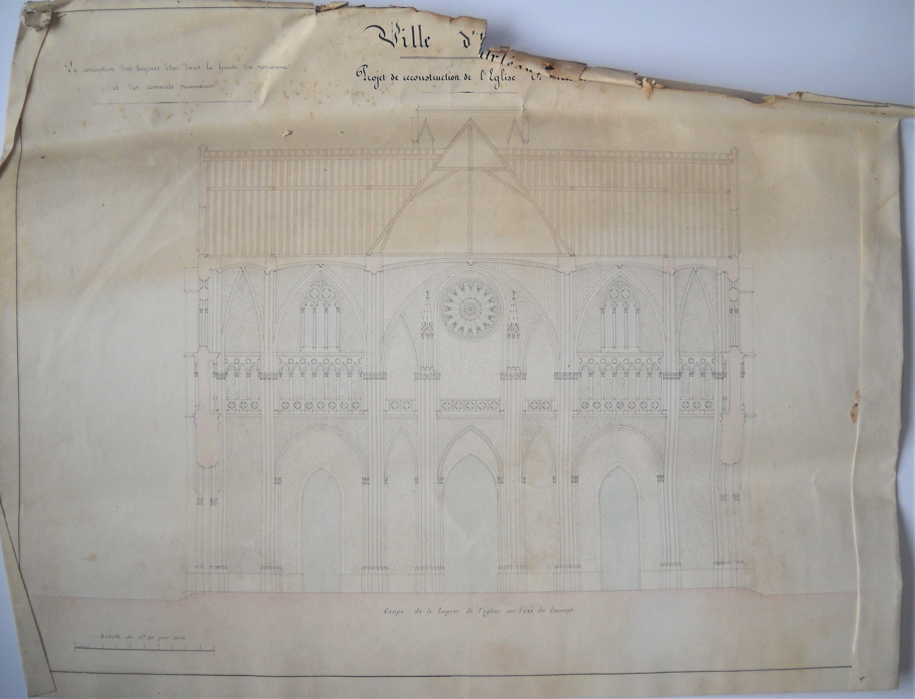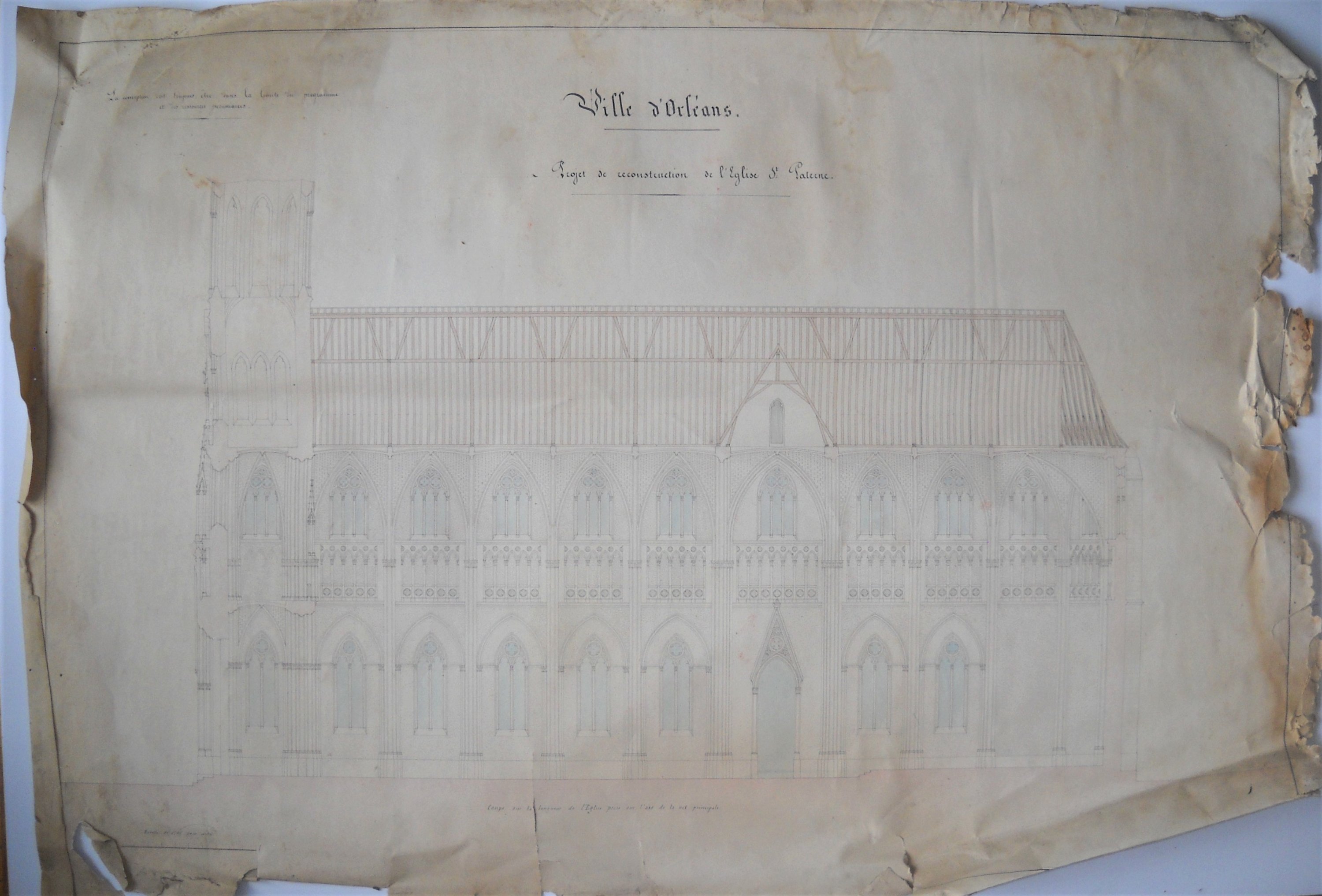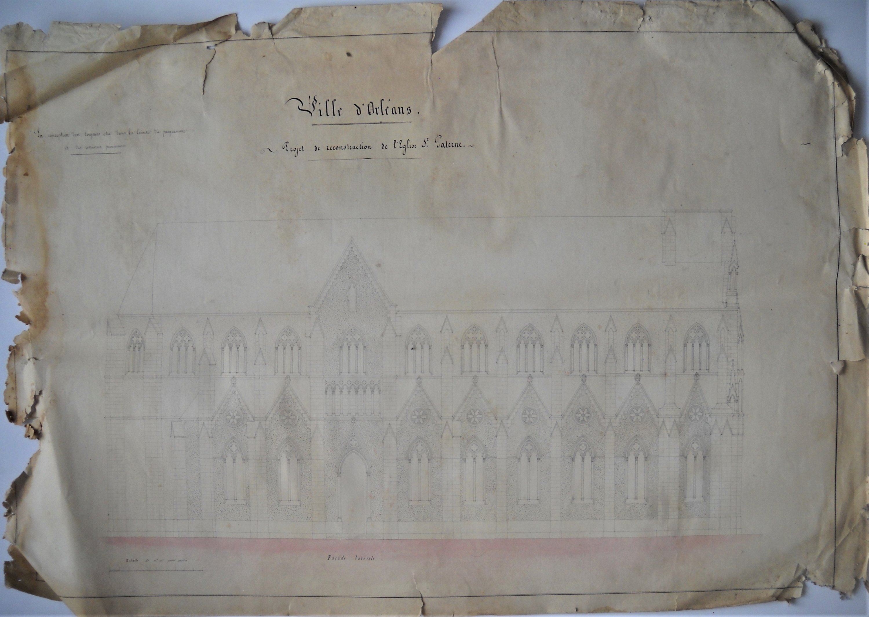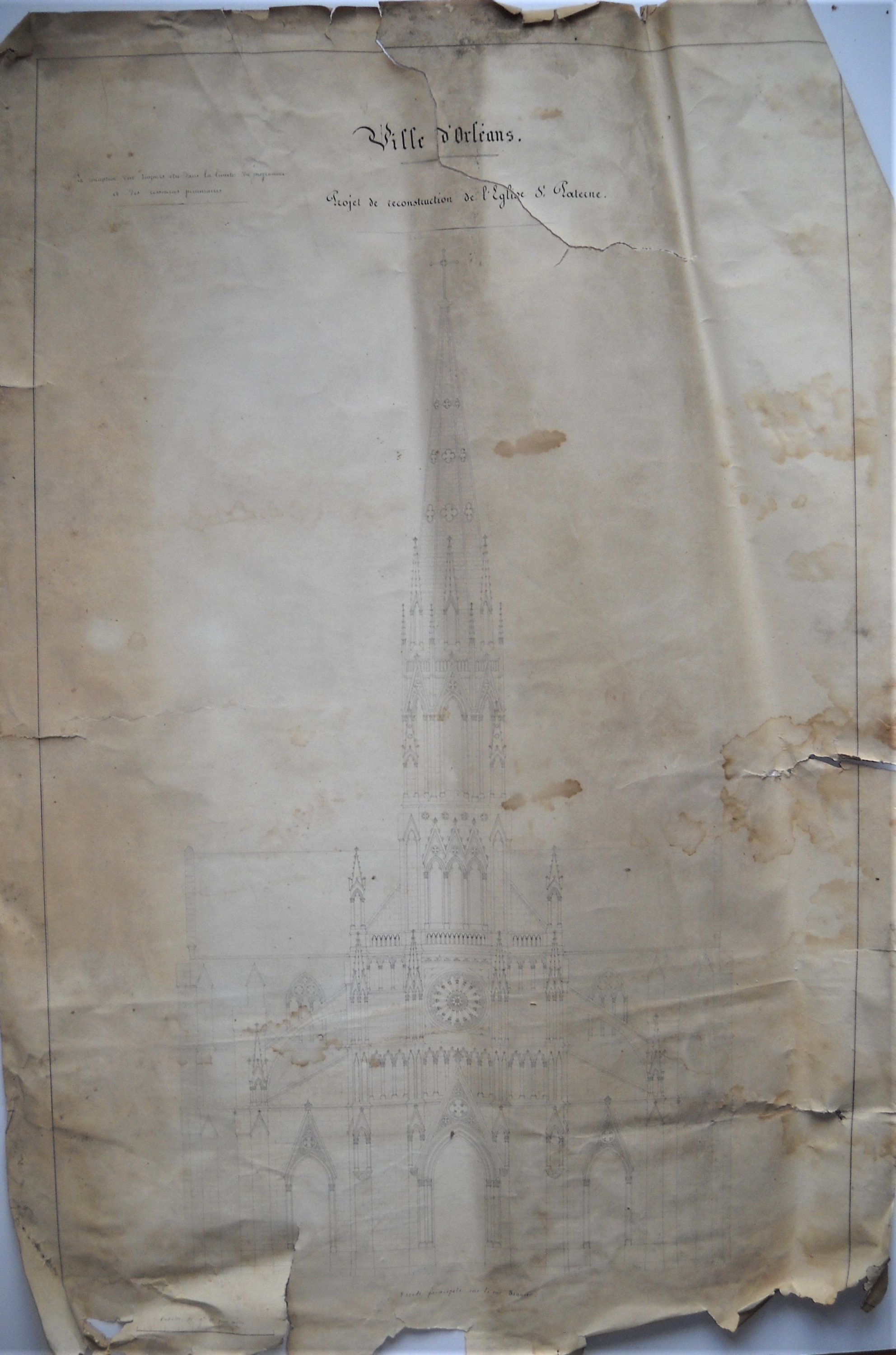 Cet ensemble de plans fut conçu en vue de répondre au projet de reconstruction de léglise Saint Paterne dOrléans. En 1862, la décision fut prise de la démolir et de la reconstruire, le bâtiment étant en très mauvais état, avec, à côté, une tour-campanile en brique du XVIème siècle (entre l'église et le presbytère actuel) qui, elle, dura jusqu'en 1914 (c'est la municipalité présidée par Fernand Rabier qui fit détruire la tour car elle menaçait de s'effondrer). Le projet présenté par Edouard Marganne nest pas retenu et la construction est confiée à l'architecte Ricard et la surveillance du chantier confiée à l'abbé Clesse. Retardés par la guerre de 1870 et financés par souscription publique, les travaux débutèrent en 1875 et la première pierre fut bénie le 9 mai 1876 par Monseigneur Dupanloup. Ils s'achevèrent en 1894 (sauf le portail ajouté en 1931). Reconstruite sur le modèle d'une église gothique, elle en adopte la décoration: arcs voutés, clefs de voûte, fenêtres ogivales (deux arcs de cercle se croisant) à meneaux (montant fixe qui divise la fenêtre), surmontés de rosaces (dans sa partie supérieure), colonnes cylindriques aux chapiteaux sculptés, (inspirées de Notre-Dame de Paris) et triforium à arcades.
