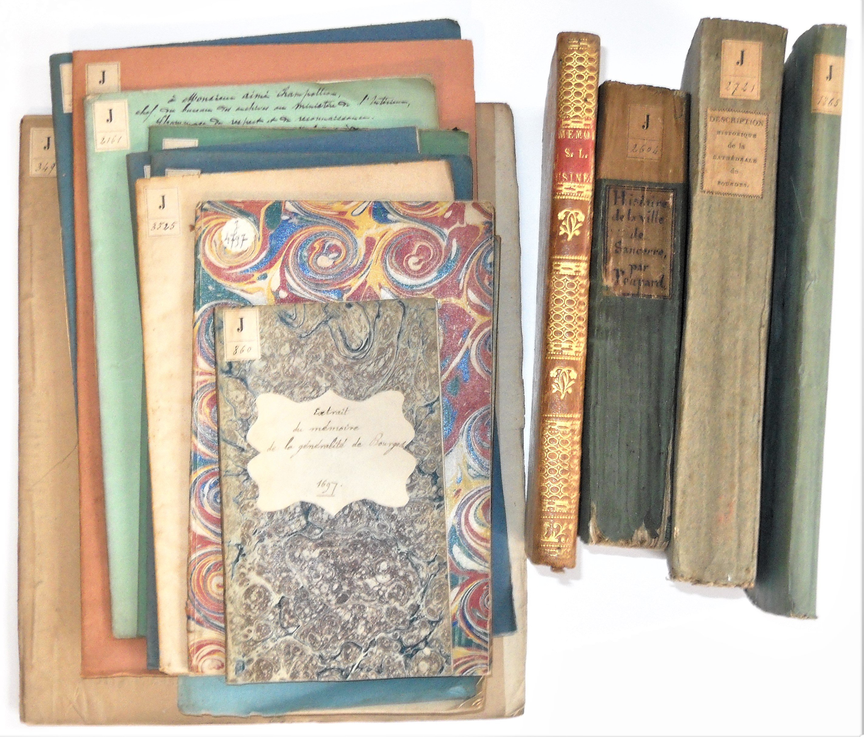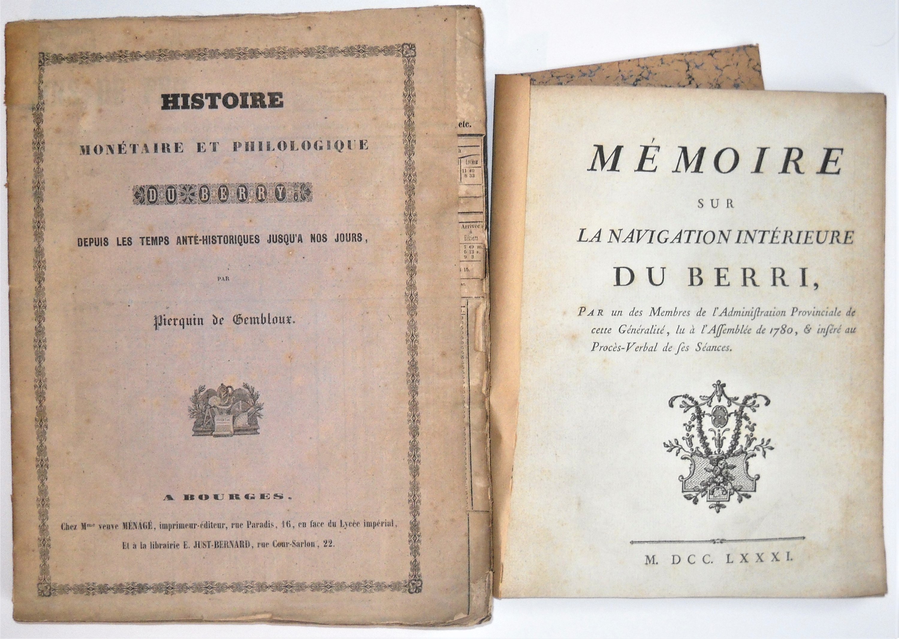 Extrait du mémoire de la généralité de Bourges, 1697, in-16, 44 pp. ; comte dEspagnac, Motion sur léchange de Sancerre présentée à lAssemblée nationale, 2 octobre 1789, 45 pp. ; Chanoine Romelot, Description historique et monumentale de léglise patriarcale, primatiale et métropolitaine de Bourges. Ornée de gravures, Bourges, Manceron, 1824, br. in-8, 320 pp. (incomplet, manques p. 321 et 322 et 4 pl. hors textes) ; Fabre, Mémoire pour servir à la statistique du département du Cher, Bourges, Vermeil, 1838, br. in-8, 194 pp. avec pl. dépliante ; de Gembloux, Histoire monétaire et philologique du Berry depuis les temps anté-historiques jusquà nos jours, Bourges, Vve Ménagé, 1840, br. in-4, xviii-237, 16 pl. numérotées (manque pl. n°9) ; comte de Gourcy, Visite de quelques fermes du Berry en septembre 1847, Saint Germain en Laye, 1847, in-8, 19 pp. ; Eloi Jouanneau, Nouvelle restitution et explication dune inscription gréco-latine du IVe siècle