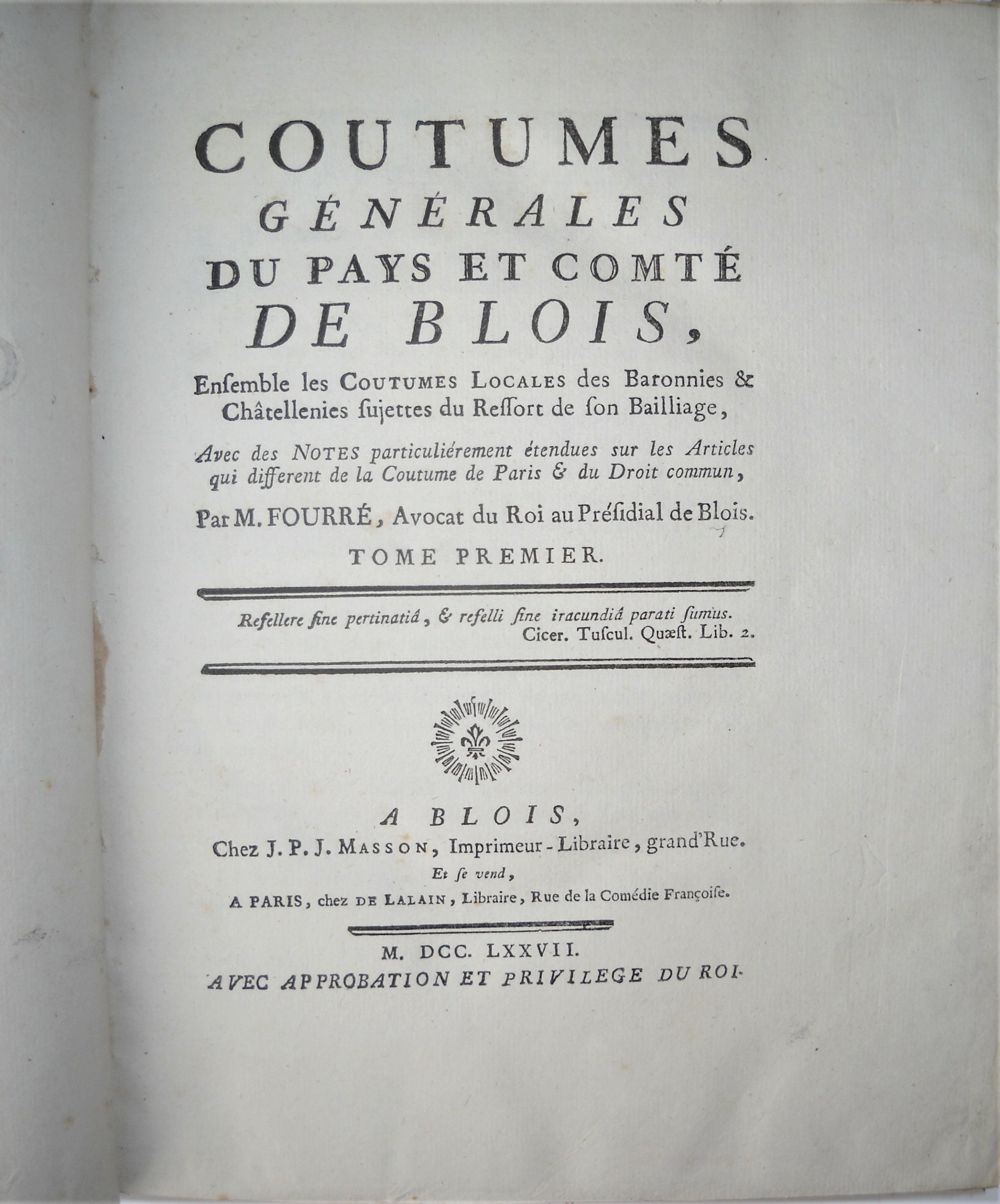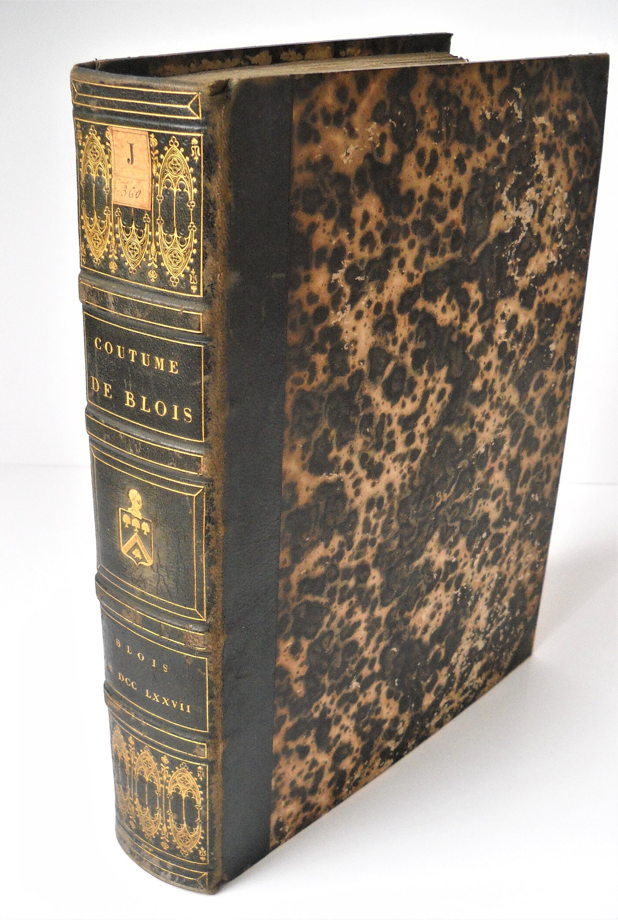 Coutumes générales du pays et comté de Blois, ensemble les coutumes locales des baronnies & châtellenies sujettes du ressort de son bailliage, avec des notes particulièrement étendues sur les articles qui diffèrent de la coutume de Paris & du droit commun, par M. Fourré, avocat du roi au présidial de Blois, divisé en trois parties, Blois, chez J.P.J. Masson, 1772, in-4, viii-960 pp., rel. ½ chagrin signée « Bibolet », élève de René Simier, au décor gothique et armoiries.