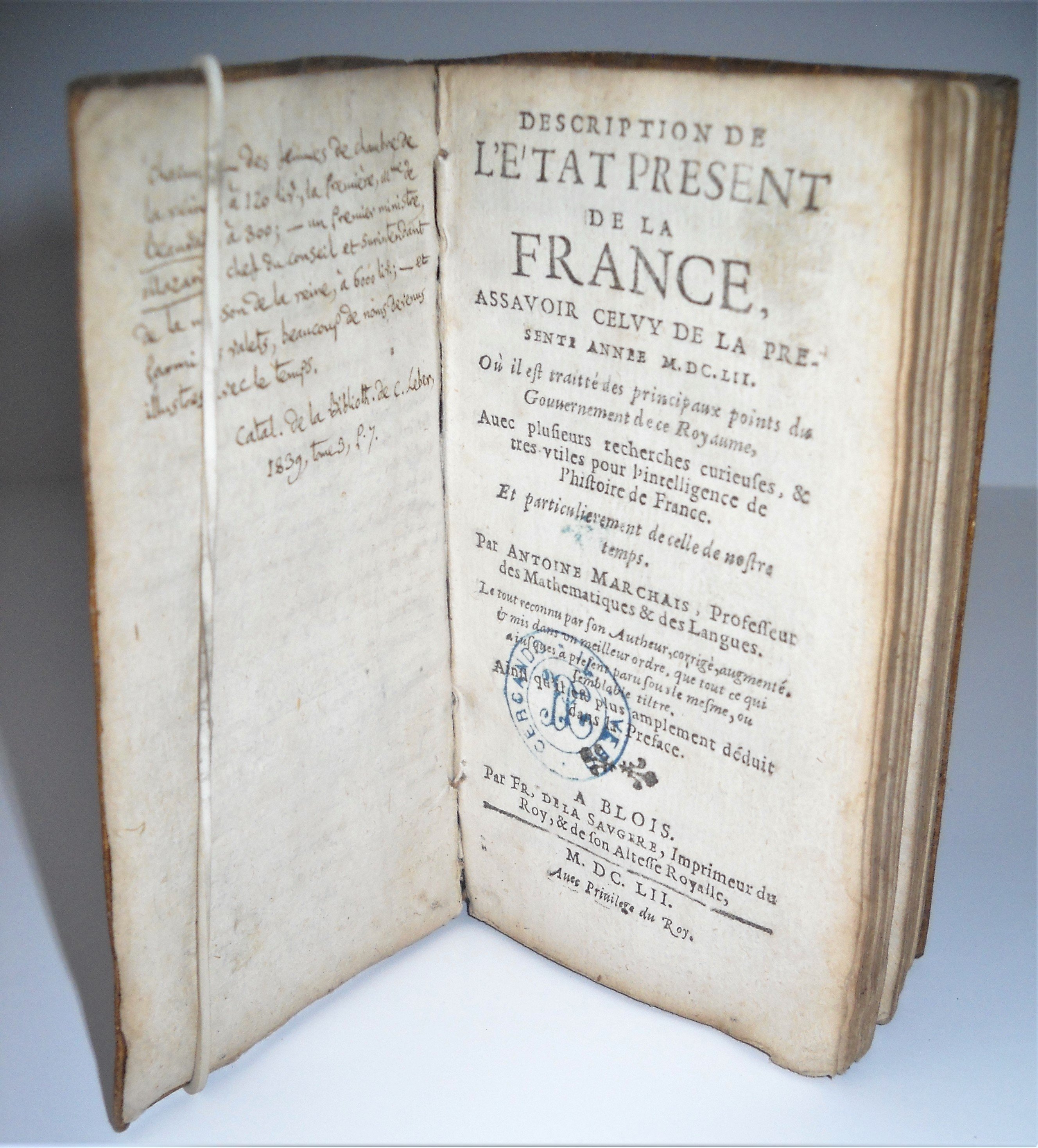 Marchais, professeur de mathématiques et des langues, Description de létat présent de la France assavoir celuy de la présente année 1652, où il est traité des principaux points du gouvernement de ce royaume, avec plusieurs recherches curieuses et très utiles pour lintelligence de lhistoire de France, Blois, Fr. de la Saugère, 1652, in-16, [xvii]-196 pp., rel. plein velin ; A la cour de Gaston dOrléans à Blois, Antoine Marchais dirige les opérations dobservation de léclipse de soleil de janvier 1656 en présence du prince ;