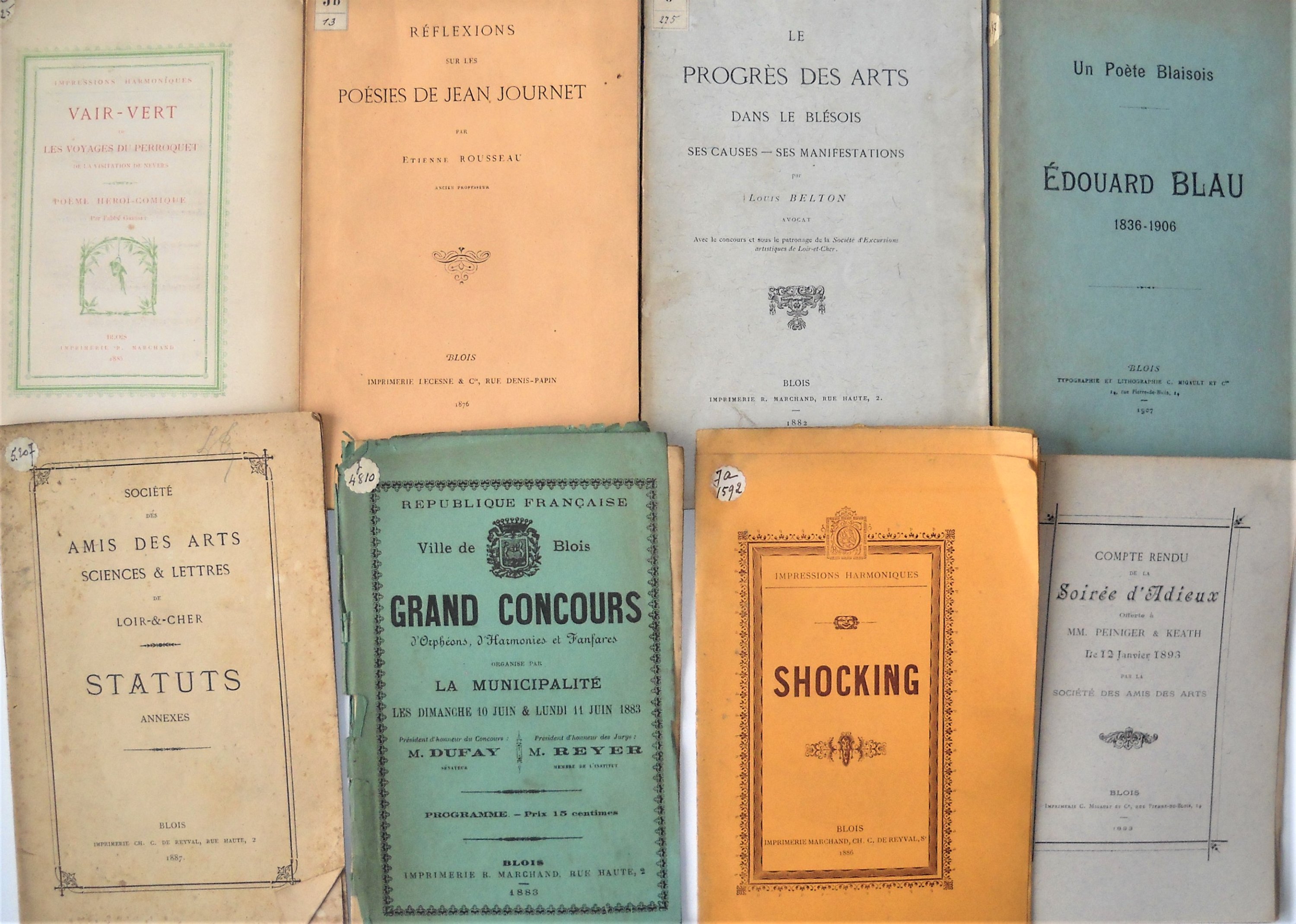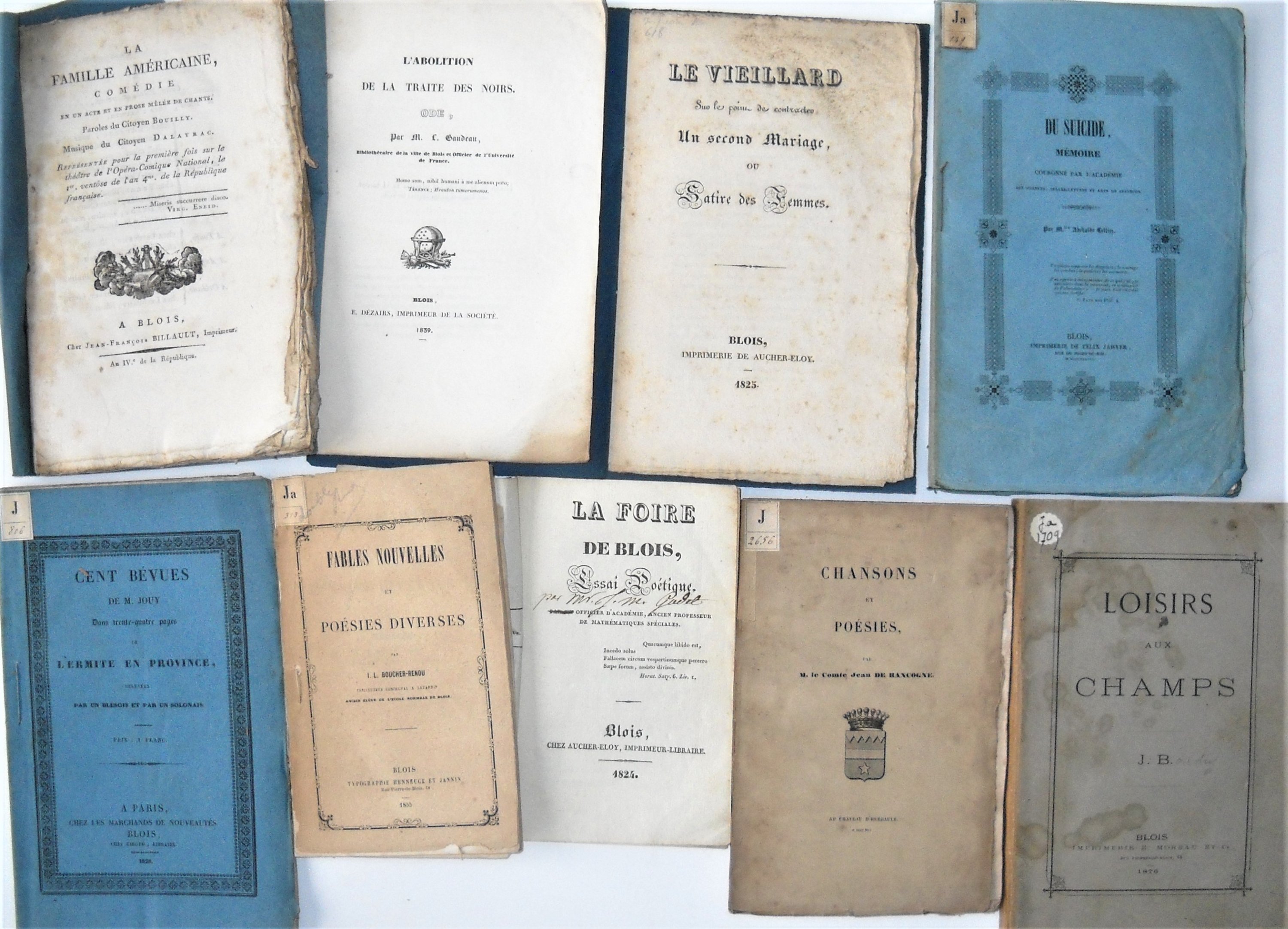 Radet et Desfontaines, La fête de légalité comédie en un acte, an III ; Bouilly et Dalayrac, La famille américaine, comédie, Blois, J.F. Billault, an IV ; Bimbenet, Odes sacrées, Blois, vers 1798 ; de Féraudi, Quelques fables ou mes loisirs, 1820 ; Gaudeau, ancien principal du collège de Blois, Une matinée de printemps passée sur la butte des Capucins, poème, 1822 ; Godet, La foire de Blois, essai poétique, Blois, 1824 ; Les soirées de la tante, ou histoires amusantes à lusage du premier âge par un ami des enfants, Blois, 1825 ; Le vieillard sur le point de contracter un second mariage ou satire des femmes, Blois, 1825 ; Cent bévues de M. Jouy dans trente-quatre pages de lermite en province relevées par un Blésois et par un Solonais, Paris, 1828 ; Catalogue de la librairie circulante dAucher-Eloy, grande Rue n°35, à Blois ; Jules Trinité, Mes rêves ou essais poétiques, 1836 ; Lortal, Nos loisirs ou poésies et mélanges, Blois, 1837 ; Merson, Du courage des femmes, Blois, 1837 ; Chevalier, Odes dAnacréon, Blois, 1833 ; de Gourbillon, Fabrice à Madrid ou le rêve dun poète, Blois, 1836 ; Petite méthode pour apprendre les transpositions du plain-chant, Blois, 1837 ; Adélaïde Celliez, Du suicide, mémoire couronné par lacadémie des sciences, belles-lettres et arts de Besançon, Blois, 1838 ; etc...