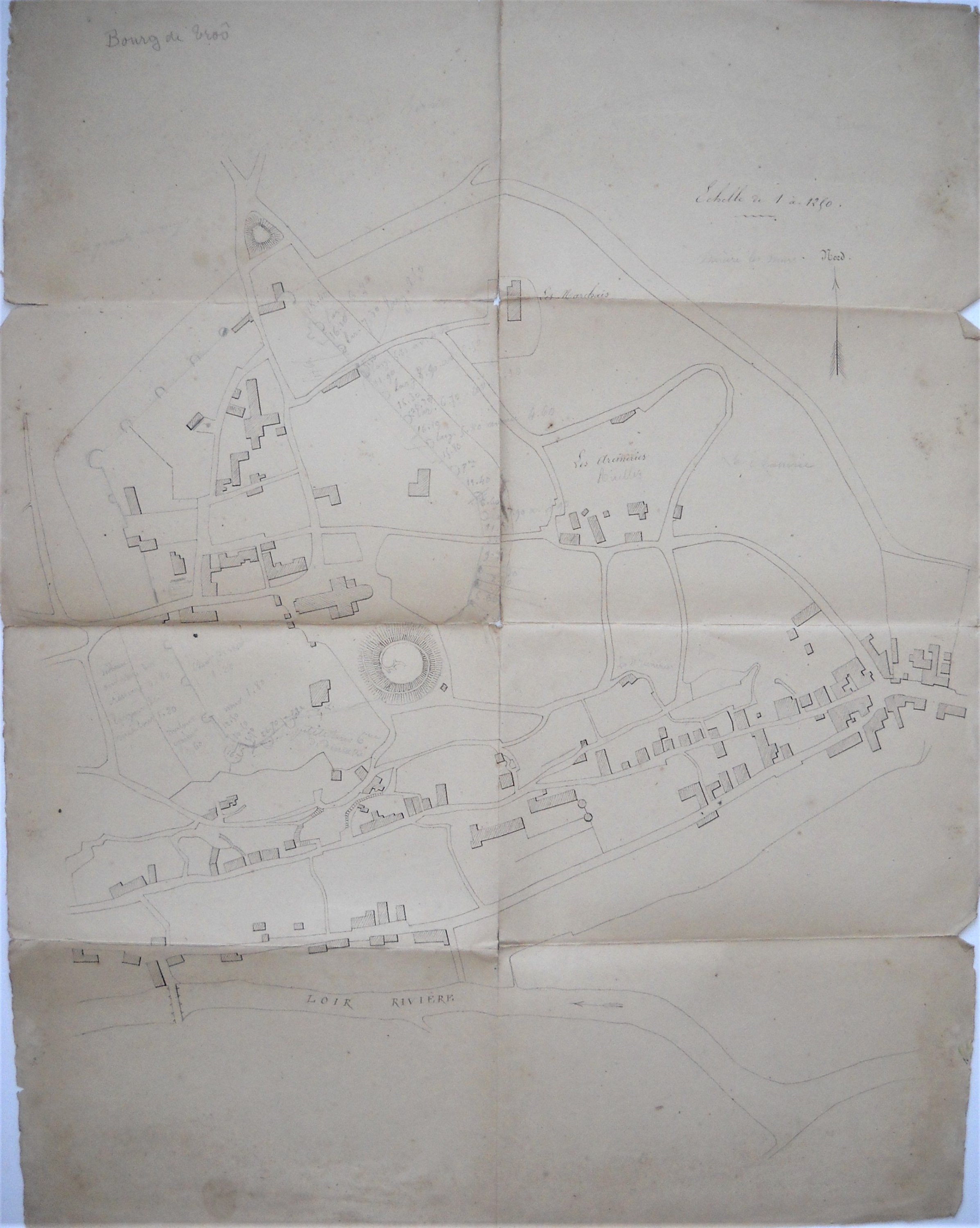 Carte manuscrite à la plume et au crayon du bourg de Trôo, milieu du 19e siècle, avec le relevé topographique des anciennes fortifications, et notamment lemplacement des tourelles, 66 x 52 cm.