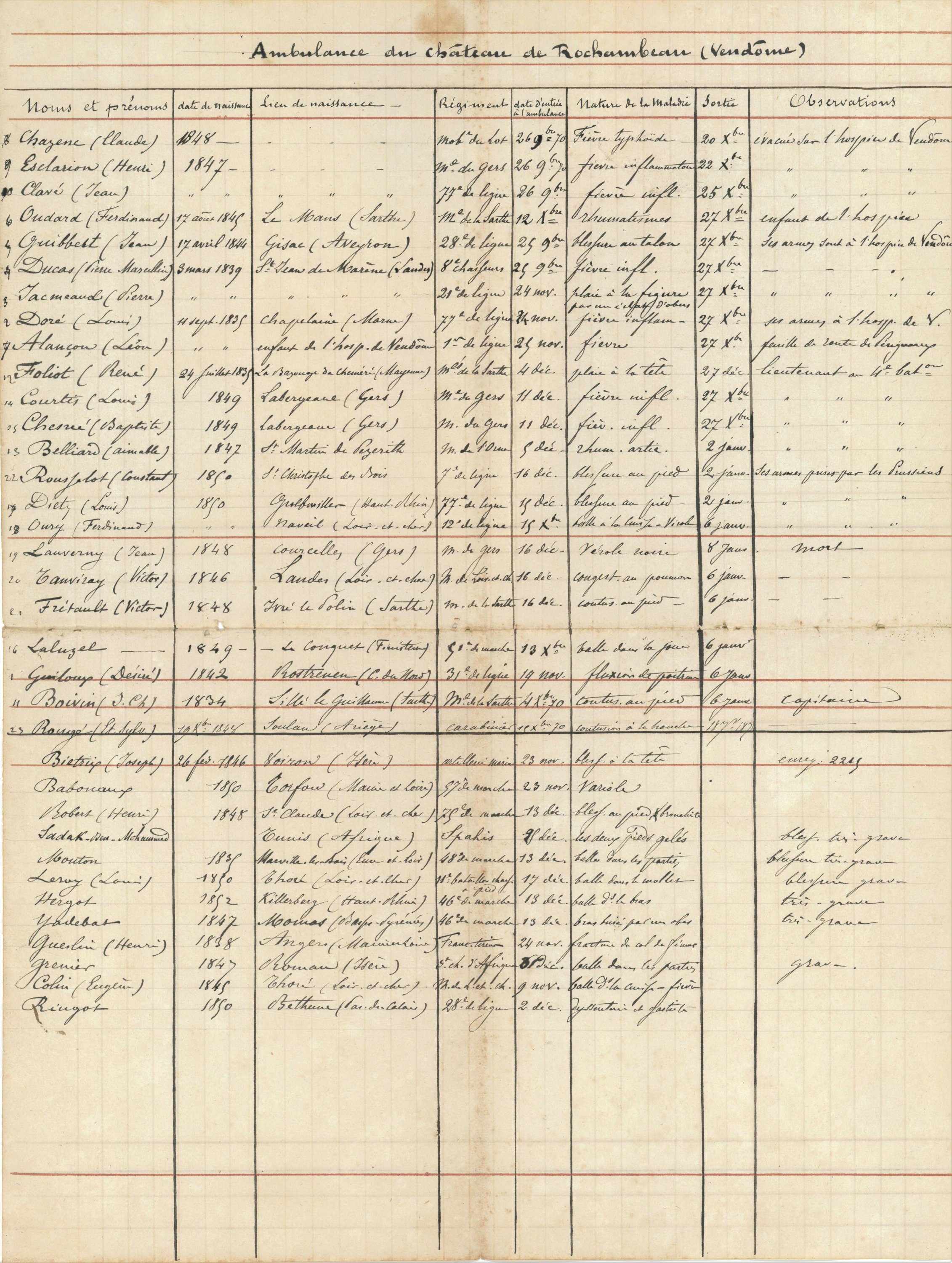 2 tableaux manuscrits listant les nom, prénom, date et lieu de naissance, régiment, date dentrée et de sortie, de lambulance installée au château de Rochambeau, comme annexe de lhospice de Vendôme durant la guerre de 1870-1871 ; rarissime ;