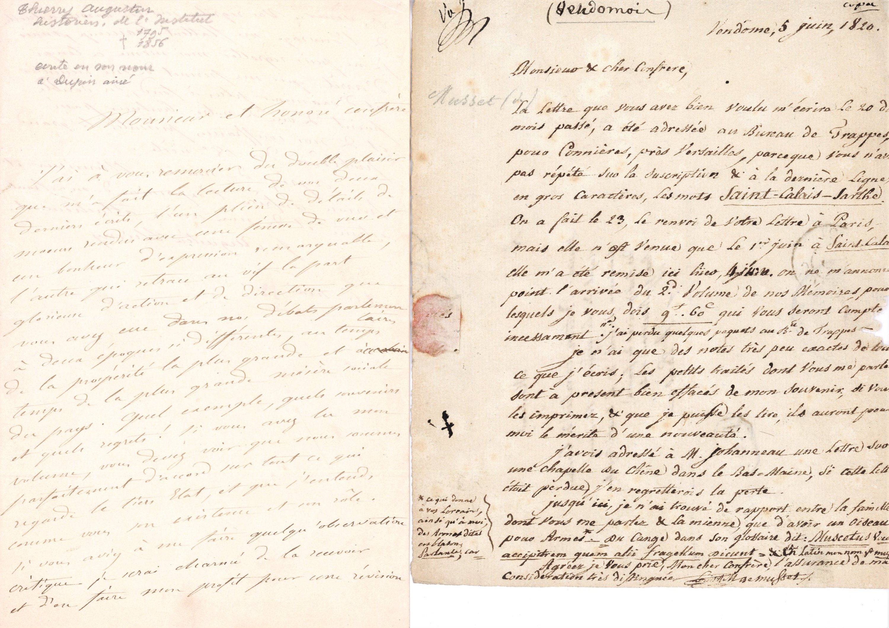 L.A.S., Vendôme, 5 juin 1820, Louis Alfred de Musset (1753-1839), marquis de Cogners, militaire et écrivain, adressée au secrétaire général de la société royale des Antiquaires de France, 1 page in-8 ;