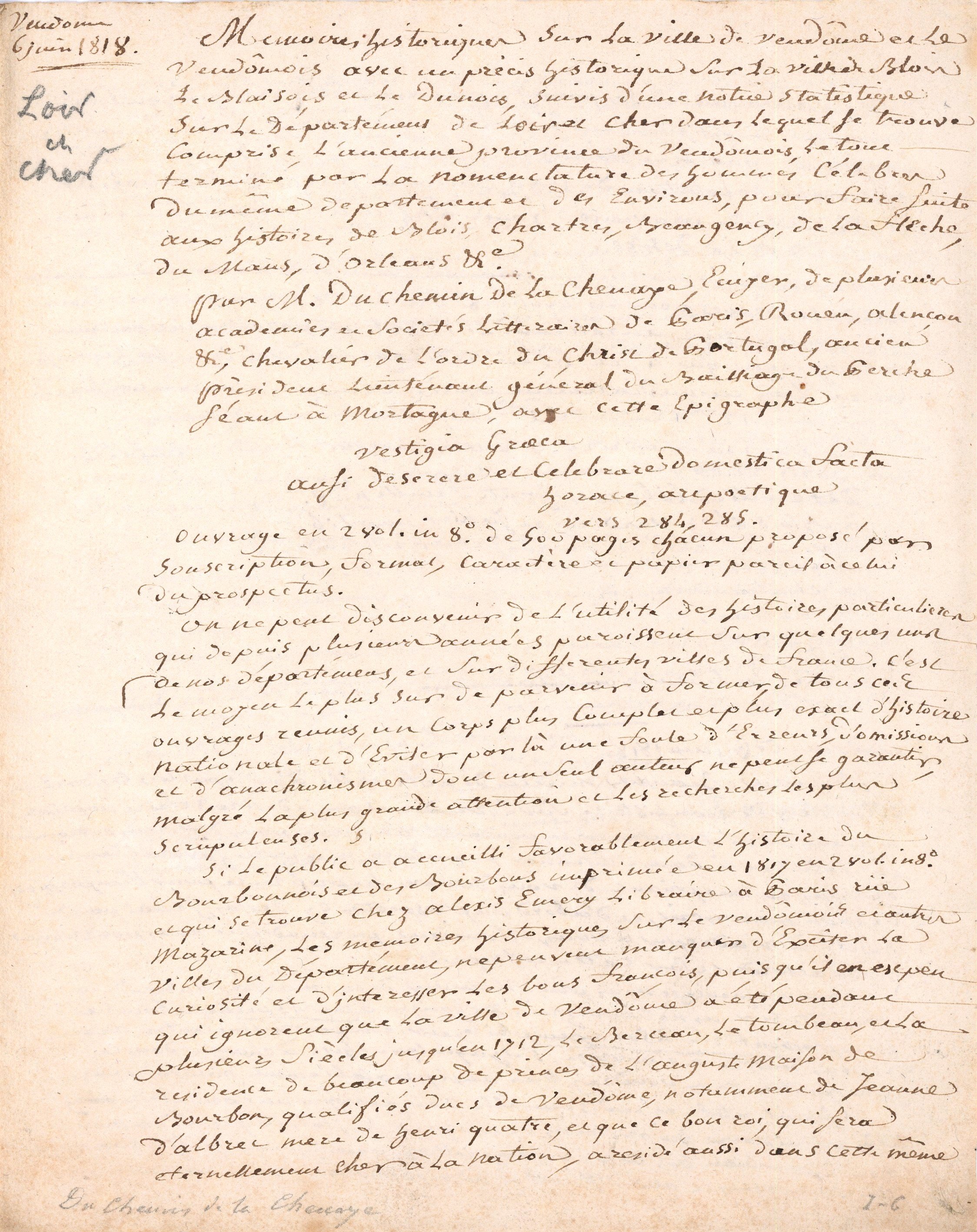 3 pages in-4, 6 juin 1818, adressée à Jean-François Deterville libraire-éditeur de Paris en vue de limpression de son manuscrit « Mémoires historiques sur la ville de Vendôme et le Vendômois, avec un précis historique sur la ville de Blois