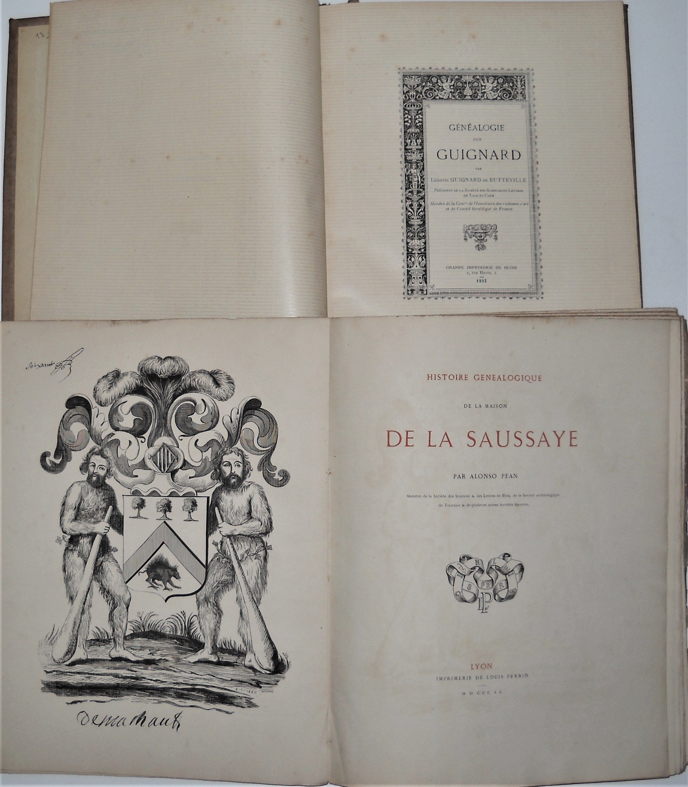 • Alonso Péan, Histoire généalogique de la maison de la Saussaye, Lyon, Louis Perrin, 1860, br. in-4, xv-90 pp. (qqs rousseurs), tiré à 60 ex. ;