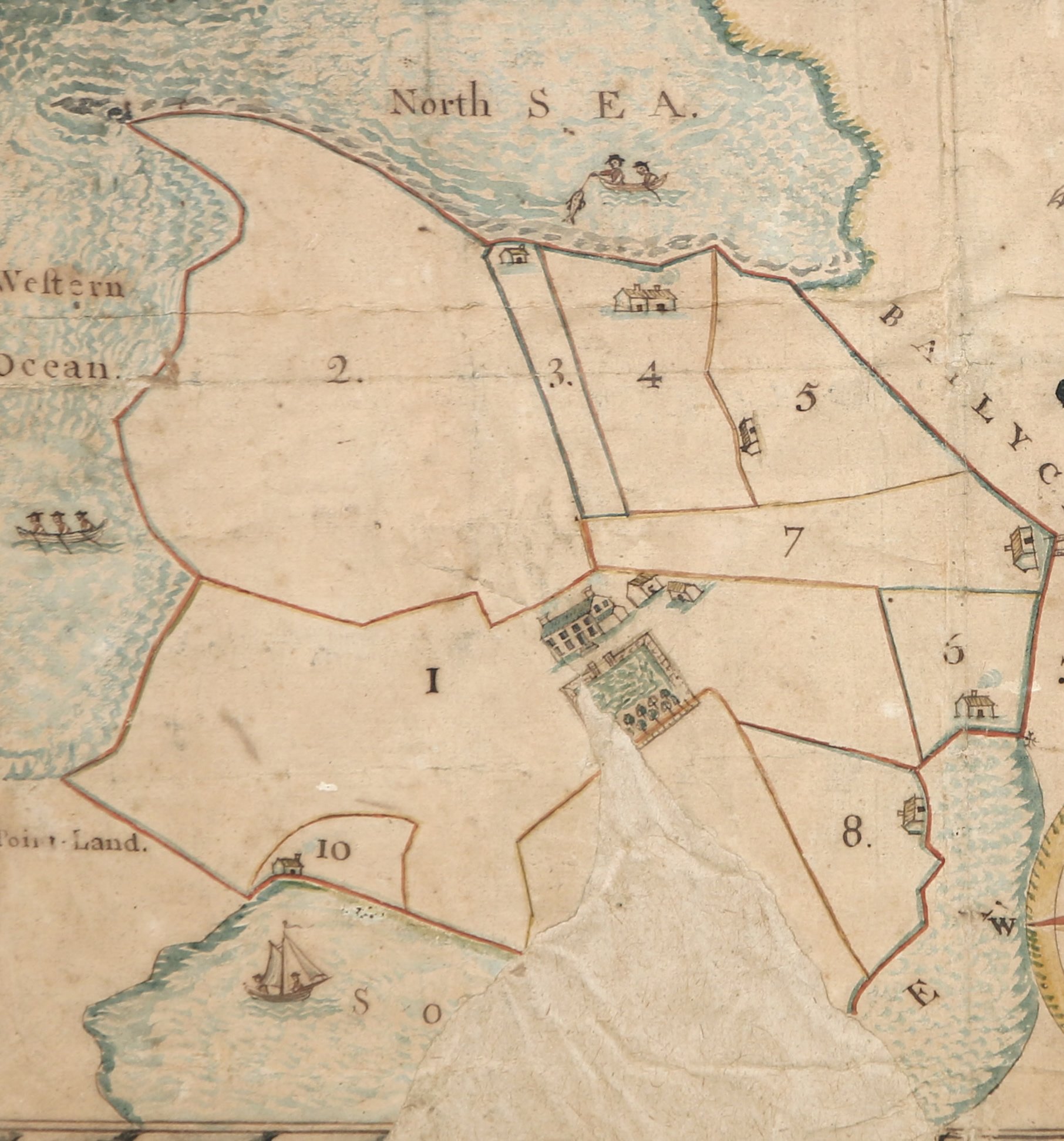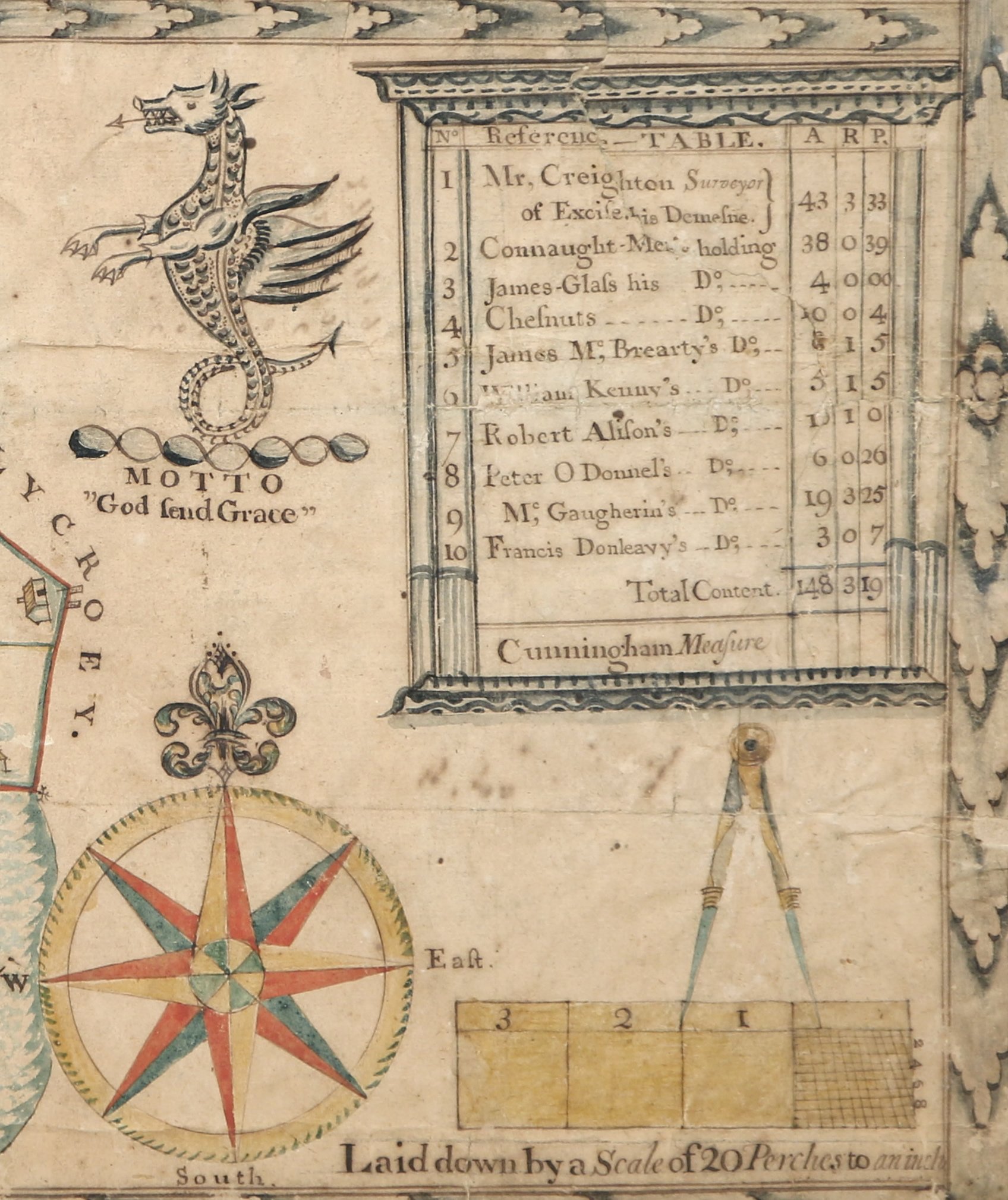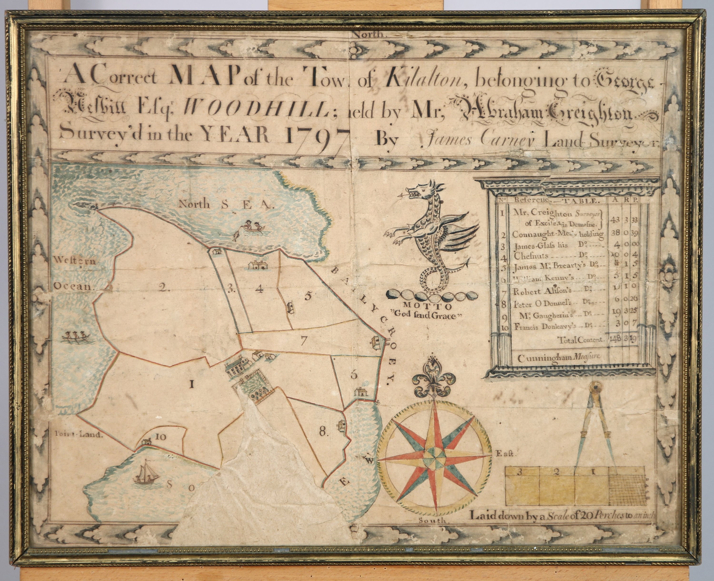 A correct map of the tow[n] of Kilalton... Sur-vey'd in the year 1797, carte d'arpentage parcellaire, plume et aquarelle, établie en 1797 par James Carney arpenteur géomètre, aux décors dessinés en couleurs d'un compas, rose des vents, bateaux de pêche, habitations et de l'insigne du clan écossais des Crichton au blason représenté par un dragon crachant du feu et à la devise: God send Grace. 36 x 45 cm, sous cadre (manque, rest.).
