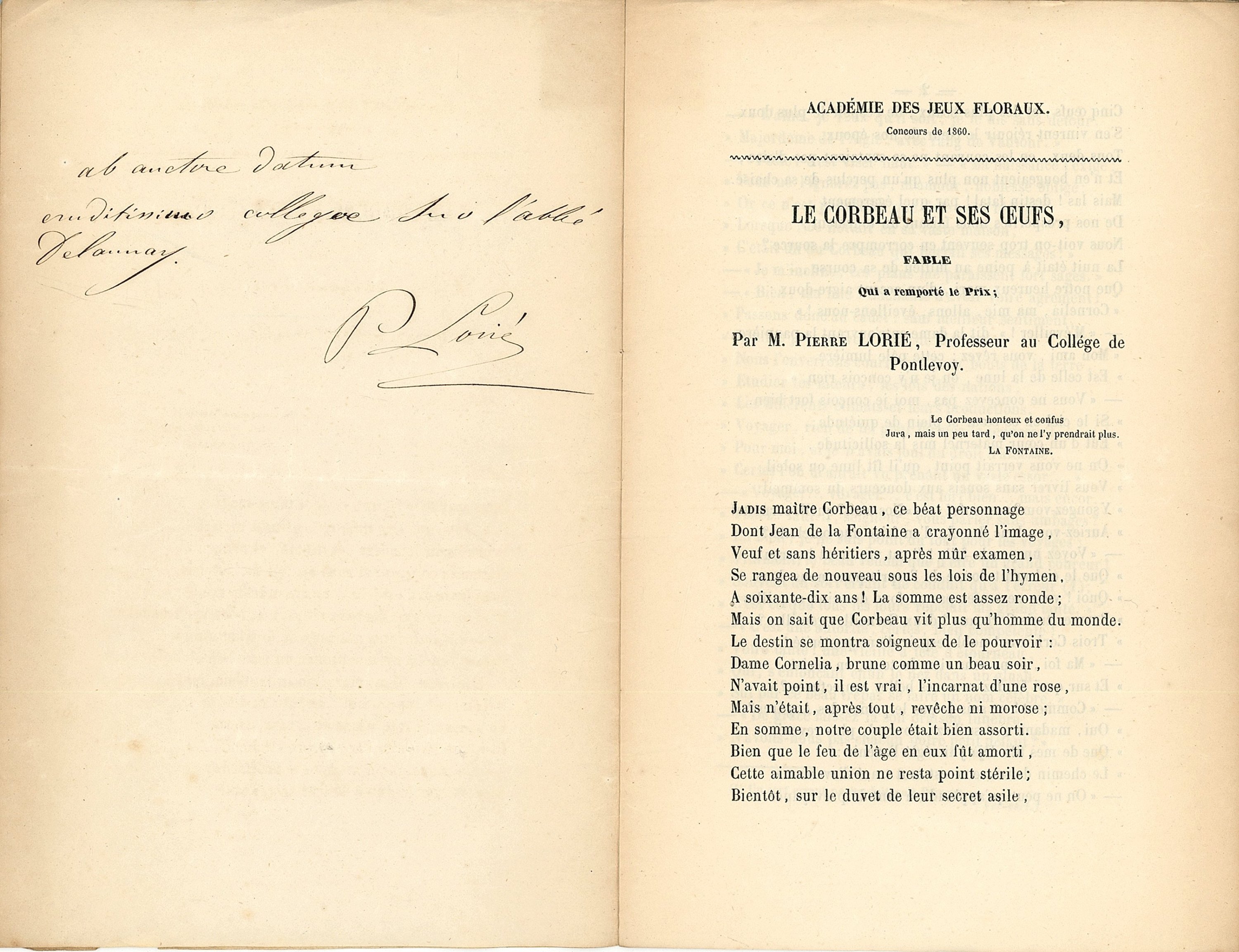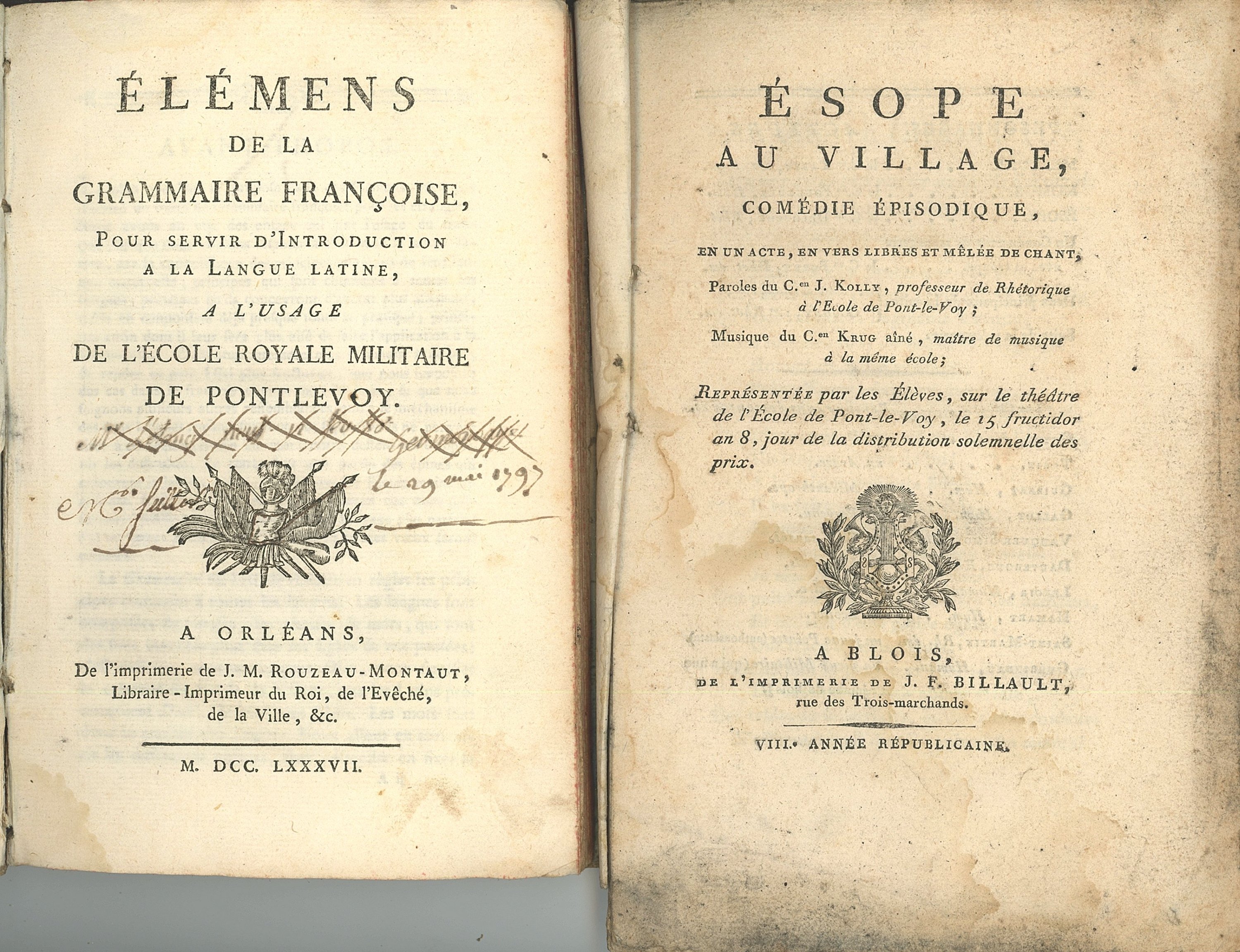 • Monarchie de Juillet: Recueil factice rel. in-8 contenant: Biographie de l’abbé Demeuré, 1838 ; Notice historique de l’abbé Pascal, 1836 ; Rapports sur les travaux de l’académie de 1834 à 1845 ; Discours prononcés par les directeurs et professeurs de 1836 à 1845 ; Abbé Demeuré, directeur du collège, Plan et esprit des études suivies dans cette école, Blois, Dézairs, 1834, br. in-8, 16 pp. ; Abbé Cummins, sous-directeur du collège, La Fontaine’s Fables, translated into english verse, Blois, Dézairs, 1834, br. in-8, 94 pp. ; Abbé Mathieu, M. le comte Daniel d’Etchegoyen O’Connel, ou les soieurs de Saint-Paul à Madon, poésie écrite pour une séance de l’Académie de Pontlevoy, Paris, Delaunay, 1836, 14 pp. ; Abbé Pascal, Notice historique et descriptive sur Pontlevoy, Blois, Dezairs-Blanchet, 1836, br. in-8, 109 pp. ; Denain, professeur de rhétorique, Rapport sur les travaux de l’académie de Pontlevoy, Blois, Dézairs, 1837, br. in-8, 81 pp. , Prospectus de souscription du maire de Pontlevoy pour ériger un monument à la mémoire de M. Berbiguier, artiste, 1838 ; Alexandre Dupré: Essais sur la seigneurie, le monastère et l’école de Pontlevoy, Blois, Dézairs, 1841, 110 pp. avec corrections et ratures manuscrites ; Pornin et Rabillon, Pont-Levoy, son abbaye et son école, 1844, album de planches lithographiées ;